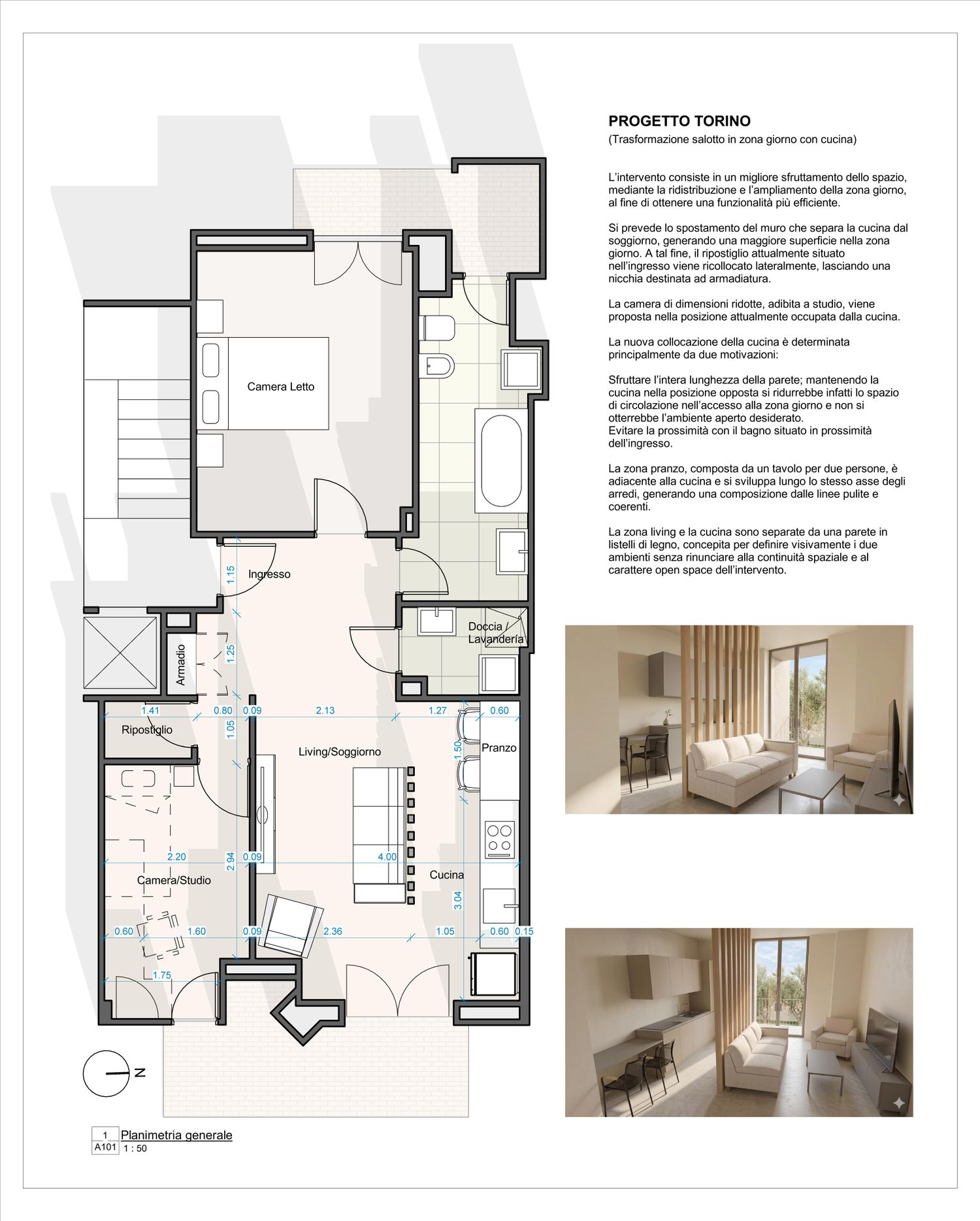L’intervento consiste in un migliore sfruttamento dello spazio, mediante la ridistribuzione e l’ampliamento della zona giorno, al fine di ottenere una funzionalità più efficiente.