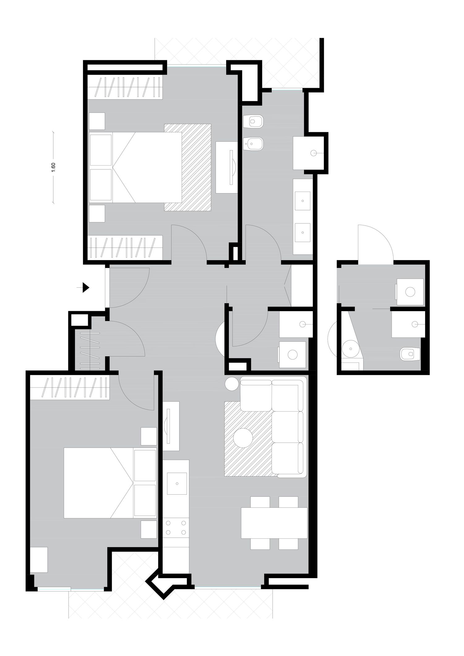 Salve. Nel progetto ho ricavato un antibagno con armadio a muro per prodotti pulizia. L'antibagno usufruibile sia per il bagno che per la lavanderia. Evidenzio seconda soluzione per sfruttare in futuro la lavanderia come bagno.