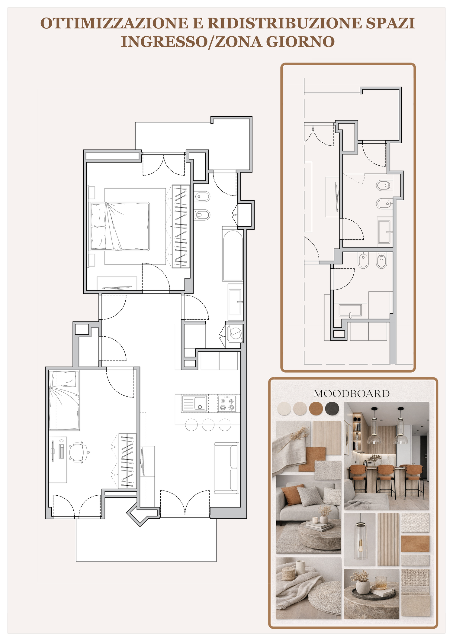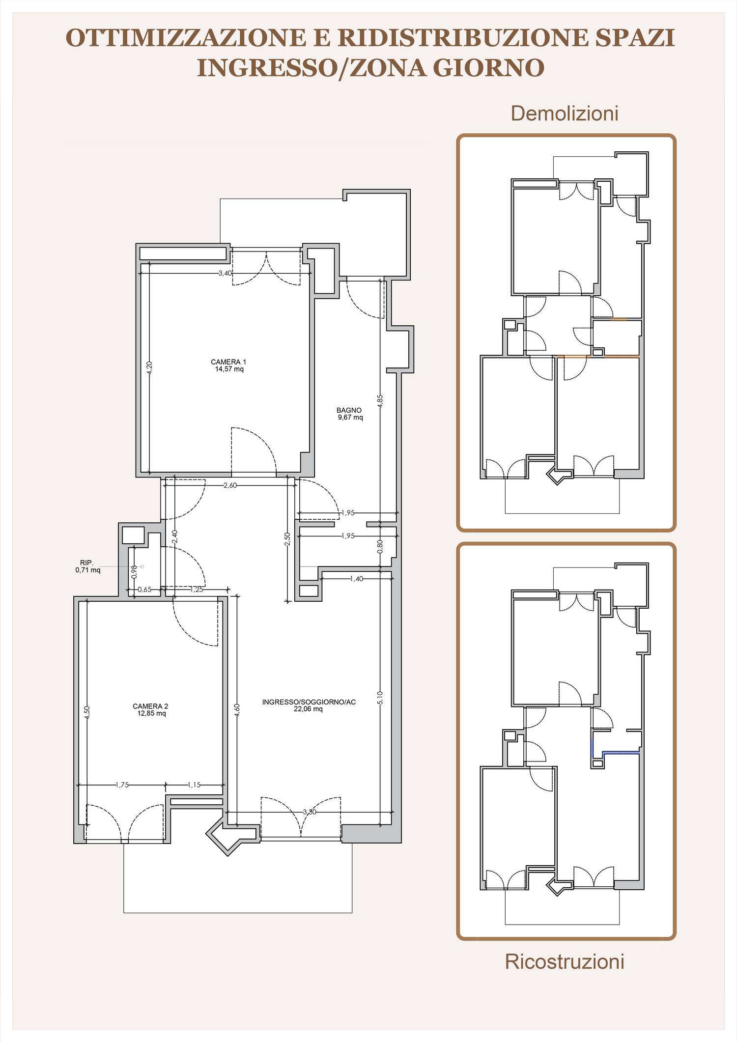 Partendo dalle indicazioni chiare e precise che ha condiviso, ho sviluppato una soluzione pensata per valorizzare al massimo gli spazi e migliorarne la funzionalità. In particolare, ho lavorato per ricavare nella zona giorno una cucina compatta ma completa, ottenuta attraverso una parziale ridistribuzione del bagnetto. Questo intervento consente di ottimizzare gli ambienti senza stravolgere la configurazione originaria e mantenendo le demolizioni al minimo.