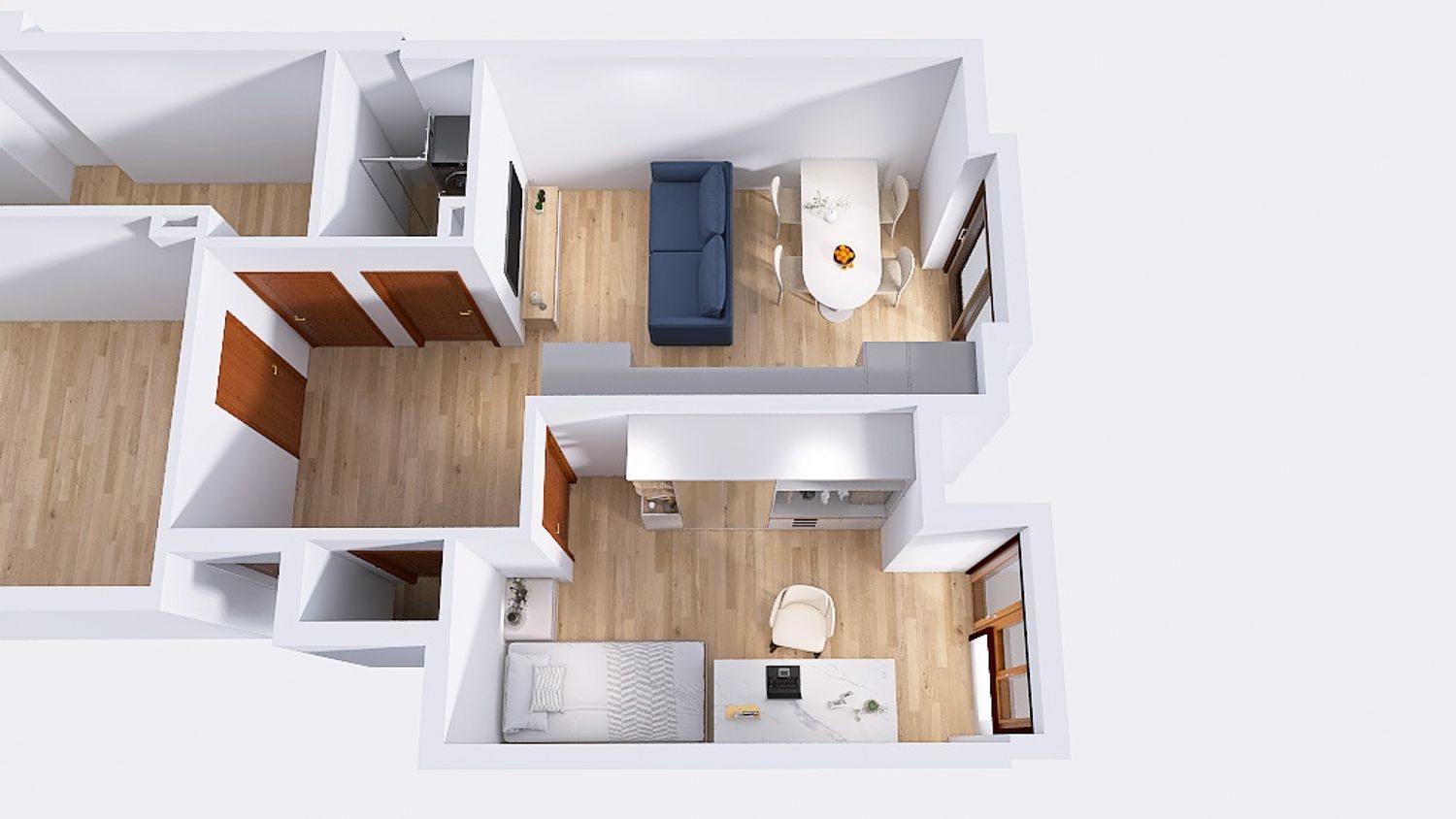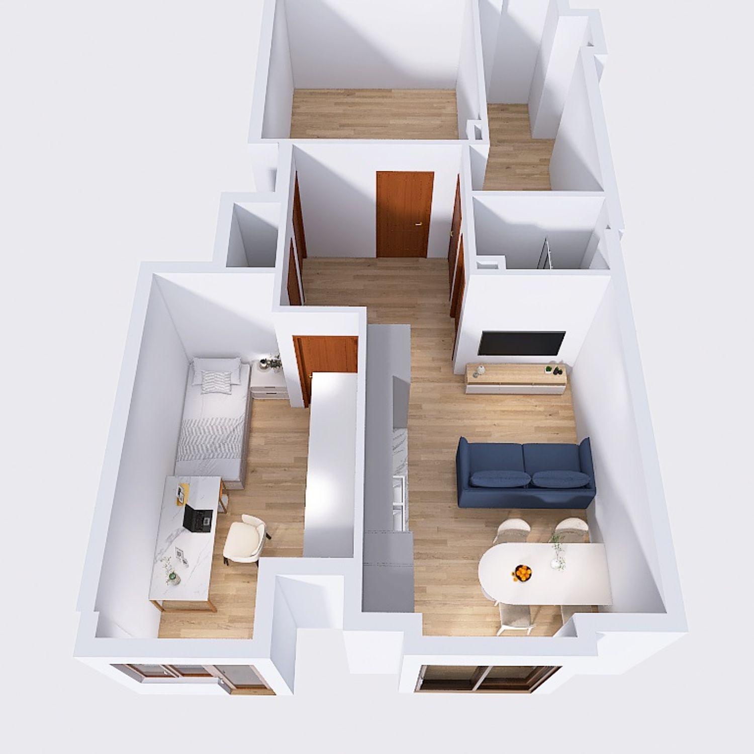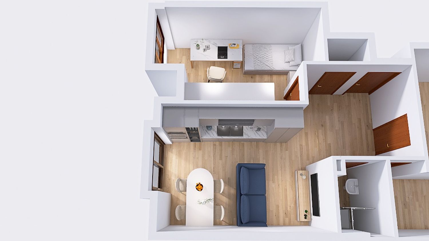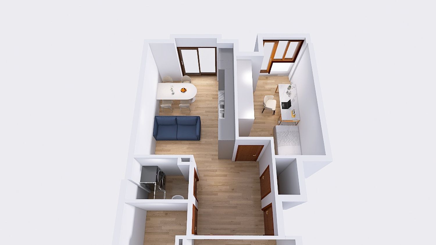 Come da richiesta è stato creato un living condiviso con cucina e zona pranzo, con spazi ben delineati e con flussi che non si intrecciano per un maggior confort, nella ex cucina ci sta comodamente una camera singola con armadio/libreria e una comoda scrivania, con il letto incassato come da disegno può tranquillamente essere uno studio che diventa camera ospiti all'occorrenza oppure una comoda camera singola per una condivisione. il bagnetto togliendo il wc e inserendoci una lavatrice e asciugatrice a colonna diventa una comoda lavanderia con doccia e lavandino.