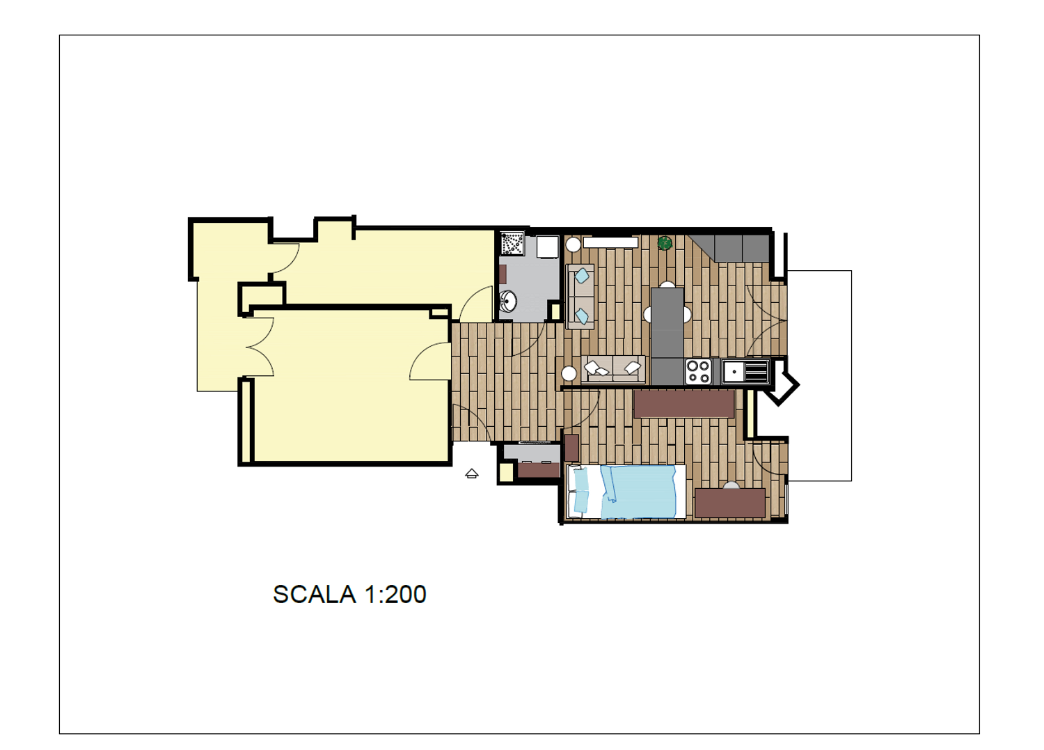 Si mantiene la posizione dei tubi e dei raccordi principali al fine di non demolire i massetti. Si crea uno spazio giorno immediatamente visibile e raggiungibile dall'entrata.Si sostituisce la porta del ripostiglio con una porta a soffietto. Si impiega un parquet in laminato da posare direttamente sull'esistente.Si raccomanda di eseguire i lavori a seguito di Cila perchè è necessario un riaccatastamento dell'unità essendo cambiati i pesi degli ambienti e vendendo sostituito un locale bagno con un locale lavanderia.