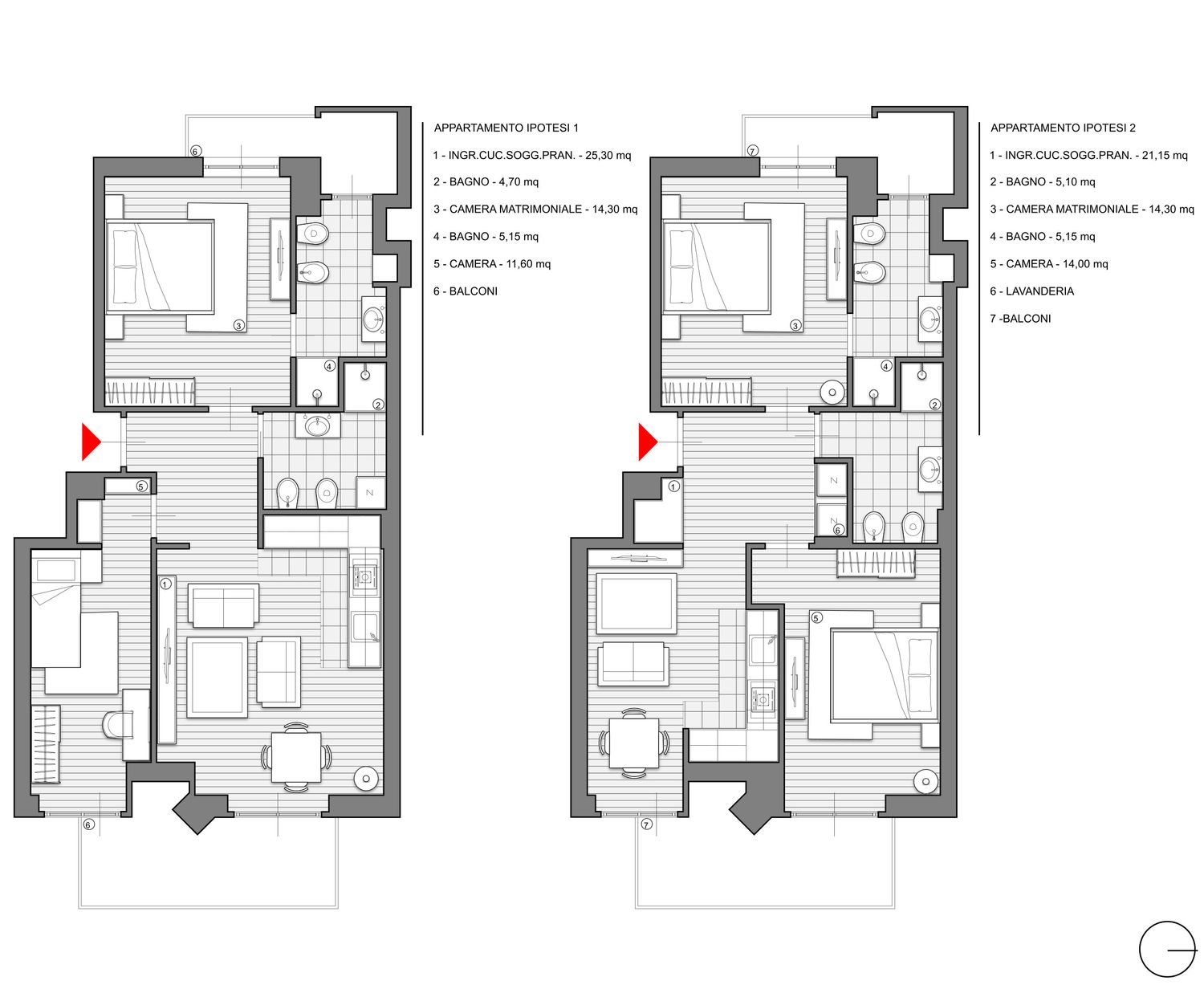 E’ molto simile all’ipotesi 1 ma dal disimpegno di ingresso trovo subito l’open space, leggermente più piccolino dell’altra ipotesi, per garantire una seconda camera matrimoniale ,trovo una zona destinata alla zona lavanderia, un bagno di servizio e la camera padronale con bagno in camera rimane invariata.