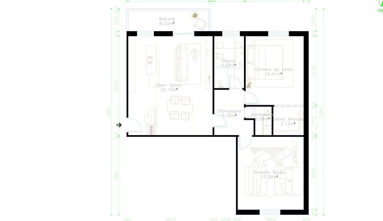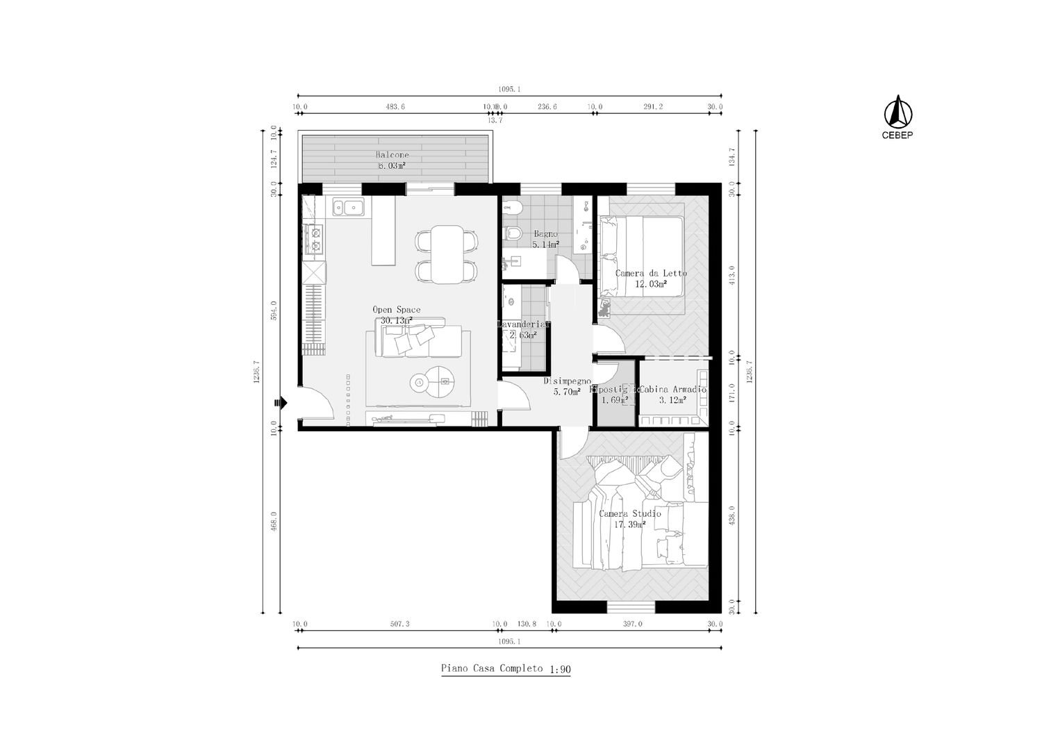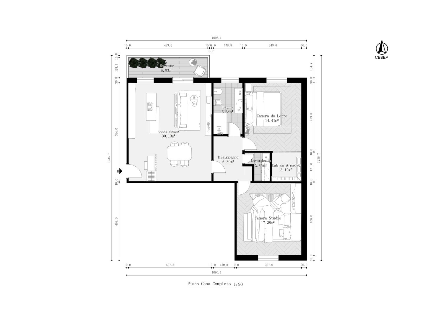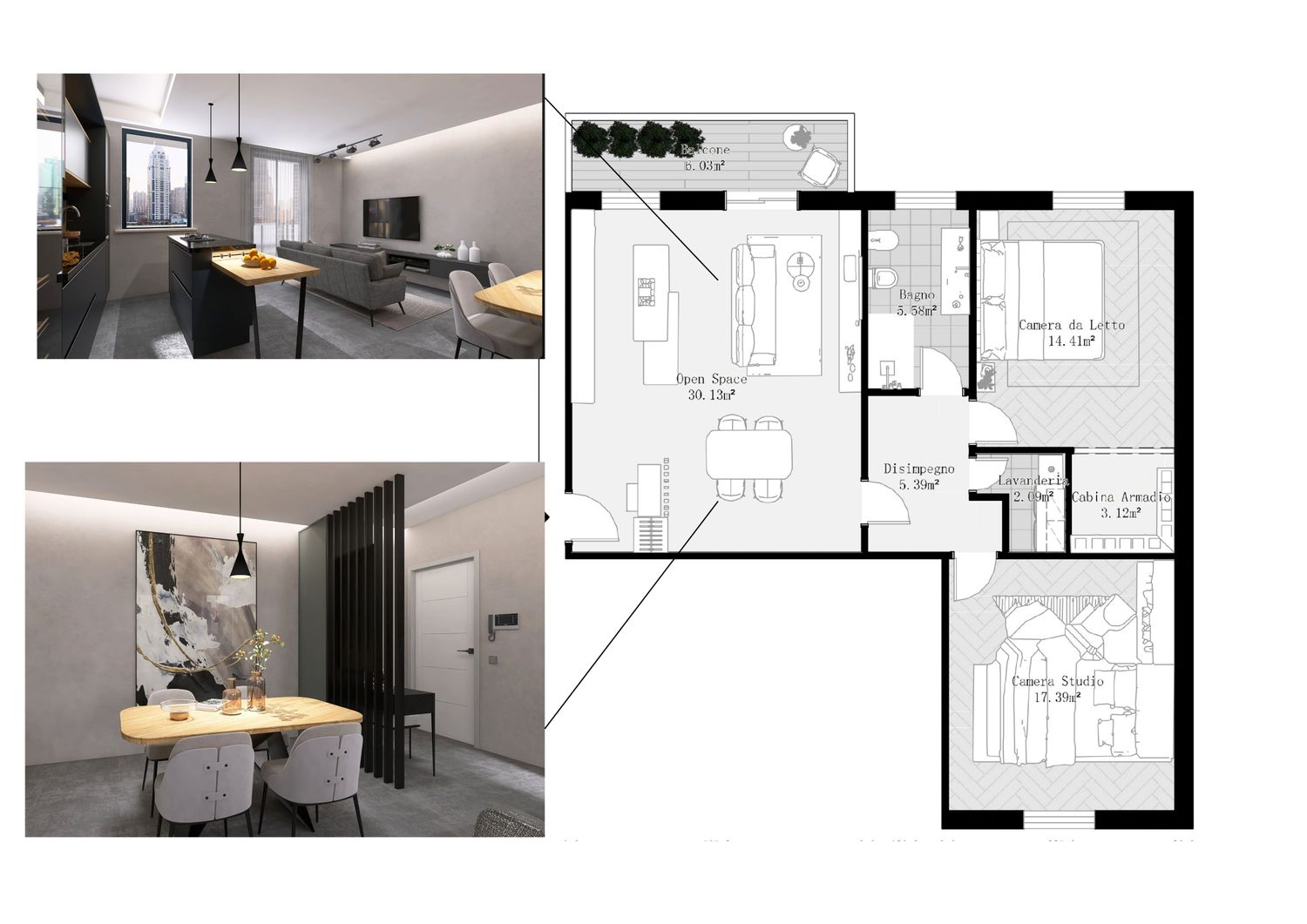 L’appartamento è organizzato con una distribuzione funzionale e ben equilibrata, che distingue in modo chiaro la zona giorno dalla zona notte, garantendo comfort e continuità spaziale.