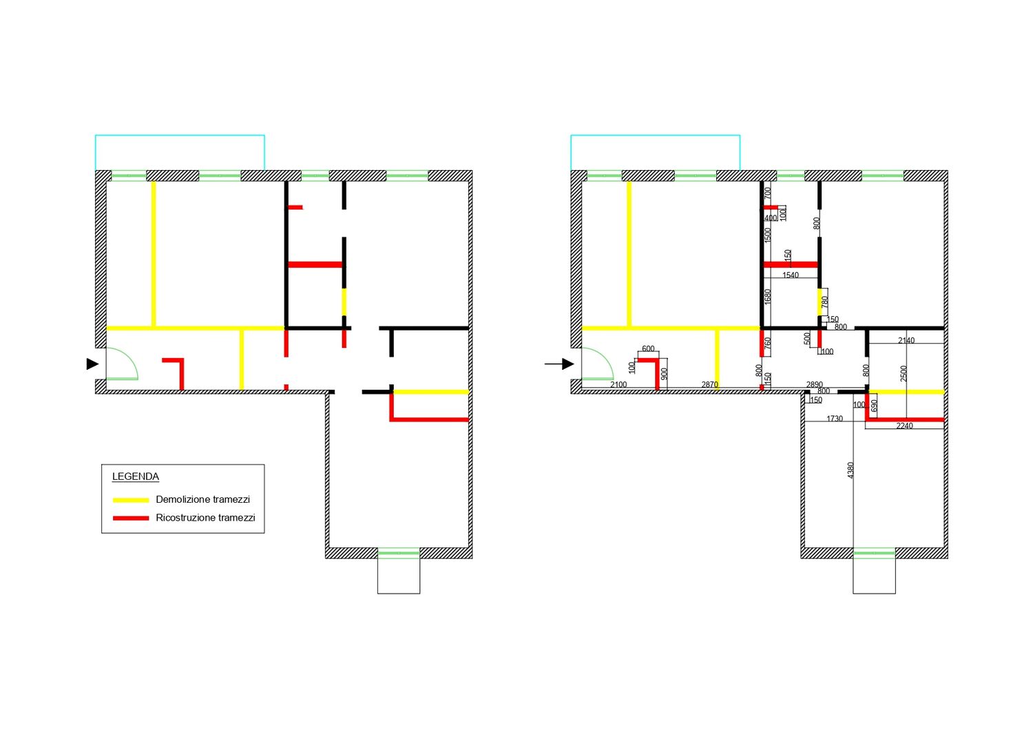 E' stato effettuato uno studio in pianta dell'appartamento creando un open space per la zona living e cucina con un ingresso svuotatasche/cappottiera.