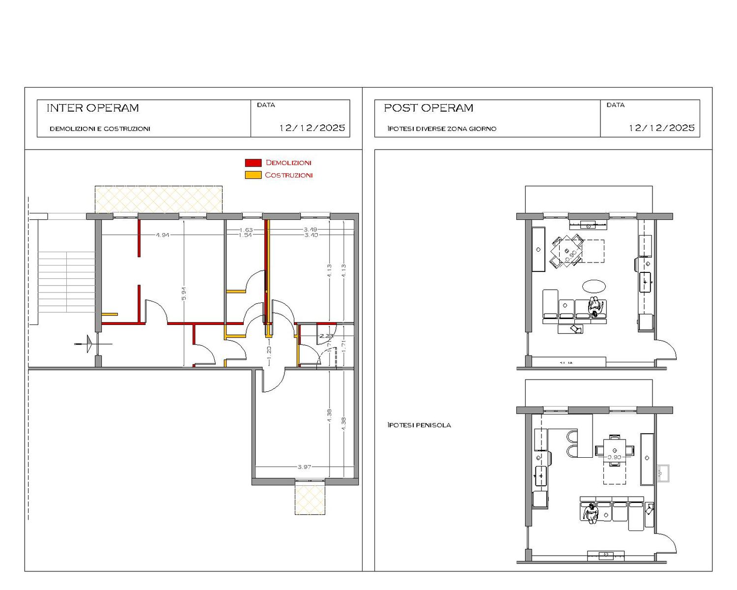 Valutate le varie possibilità, per la zona giorno sono state ipotizzate diverse distribuzioni, provando anche ad inserire la penisola (come da desiderio) ma lo spazio risulterebbe molto compresso.