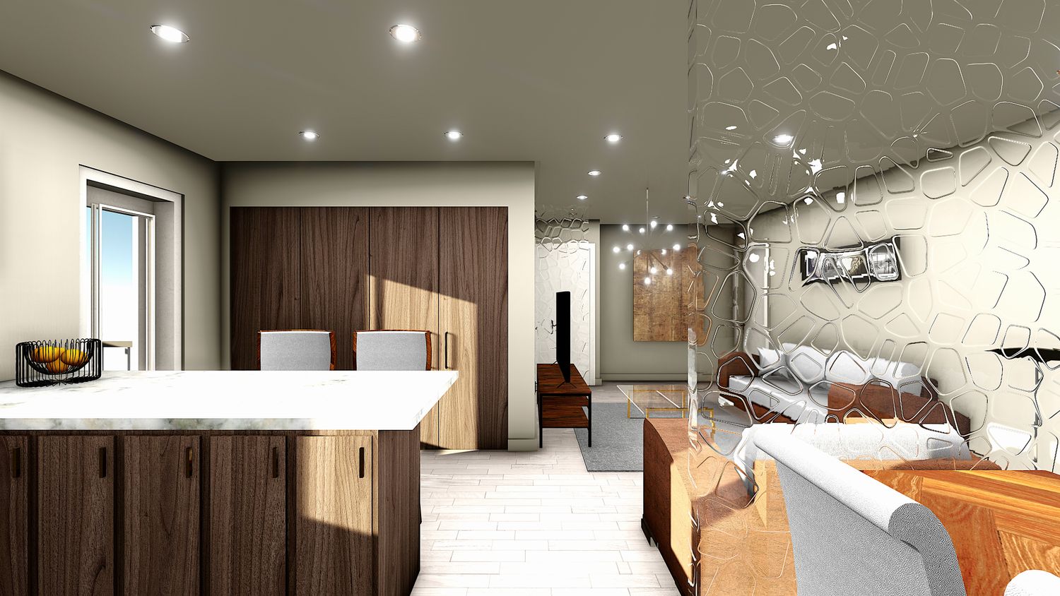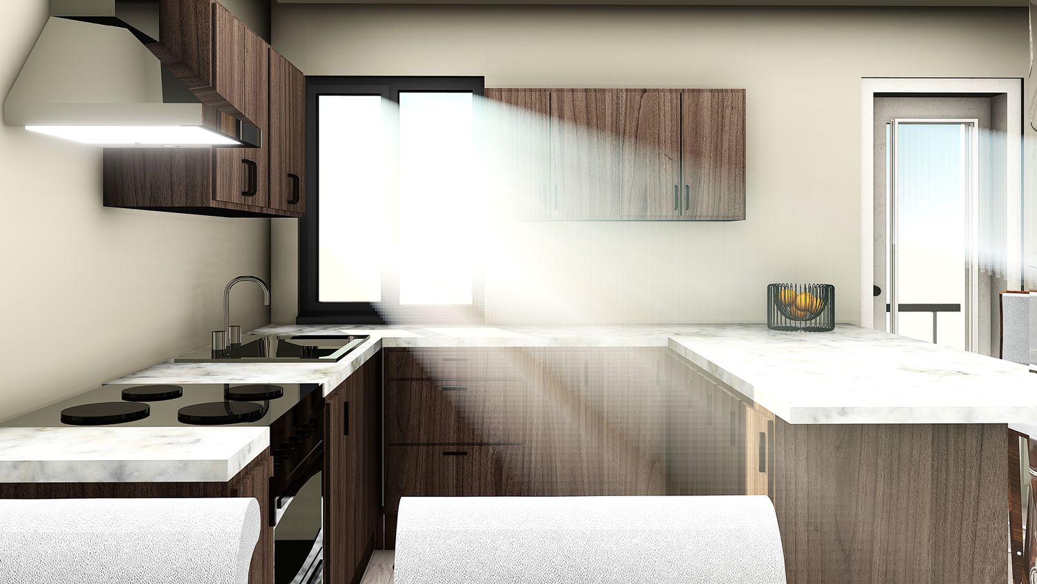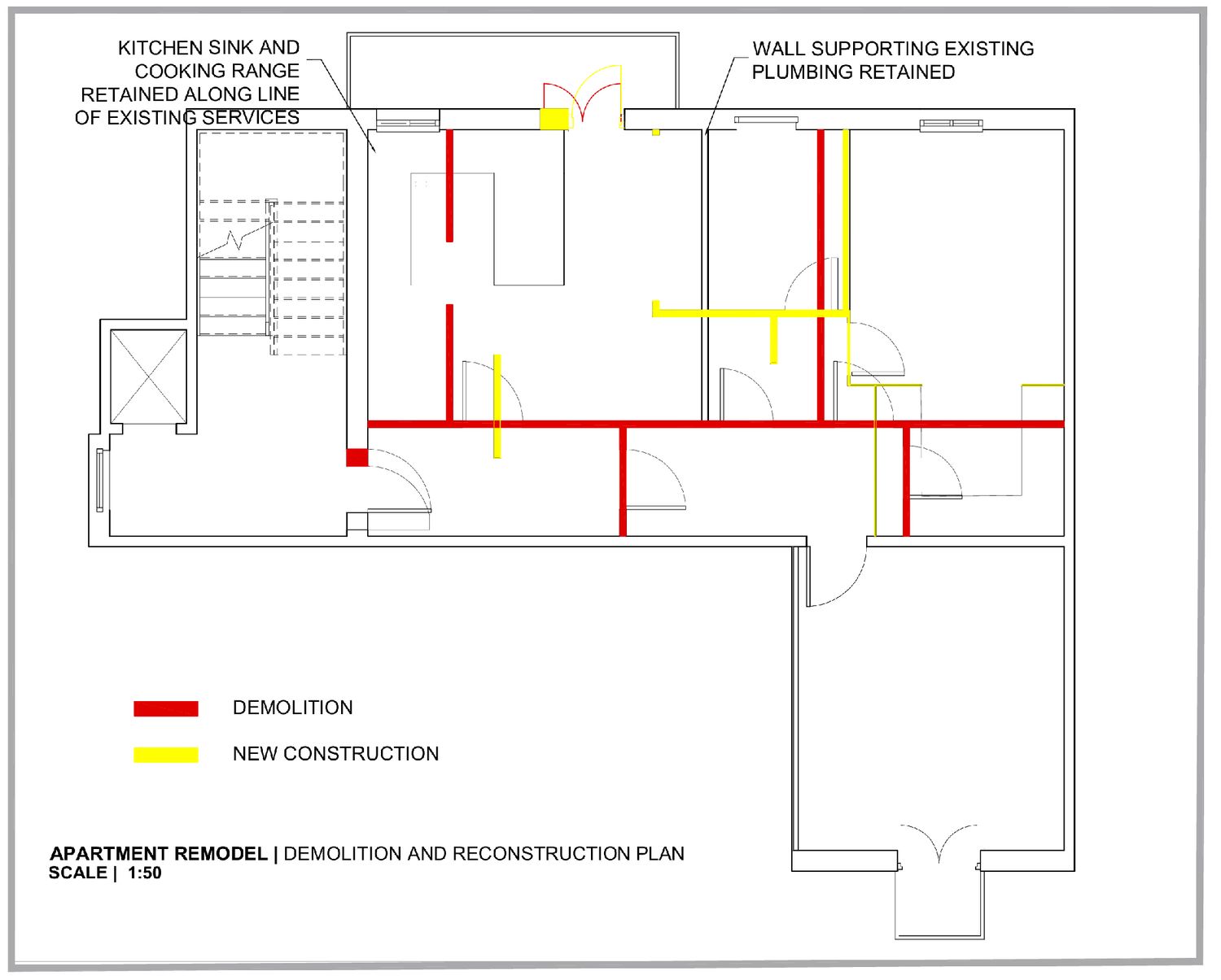The proposed plan incorporates an open plan living with kitchen including peninsula, a laundry cabinet positioned along the wall of existing plumbing also ensuring no noise impact to the bedrooms. The kitchen sink and cooking range has been positioned along existing plumbing and gas services line.