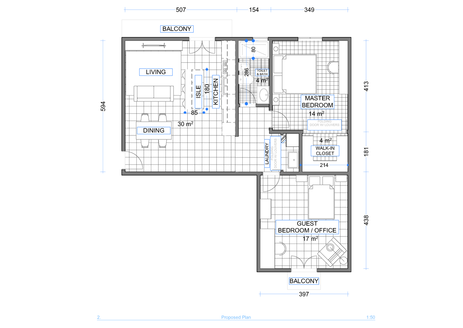 This project involved a complete renovation of a two-bedroom apartment on the 4th floor, redesigned to improve functionality, comfort, and spatial flow. The layout features a spacious open-plan kitchen and living area, two balconies, a main bedroom with a walk-in wardrobe, a study/guest room, a dedicated laundry room, and a bathroom.