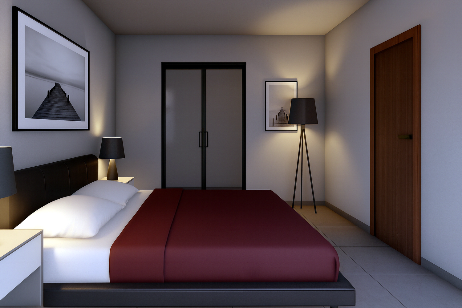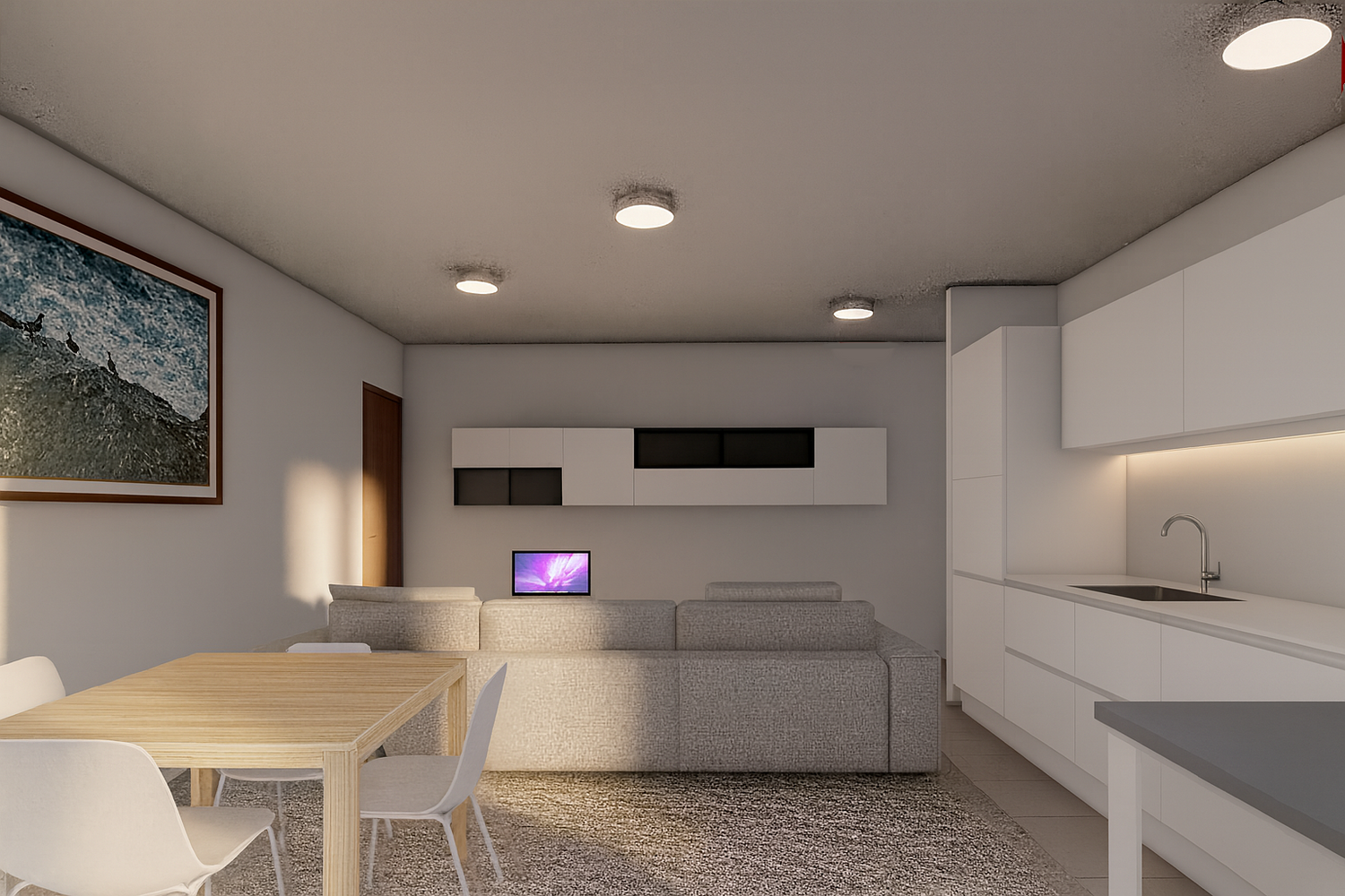 Come si può ben vedere nelle immagini ho pensato un arredamento moderno non spinto, con la pavimentazione, il battiscopa e le finiture dei bagni in gres porcellanato, la tinteggiatura bianca che permette di catturare all’interno degli spazi più luce naturale.