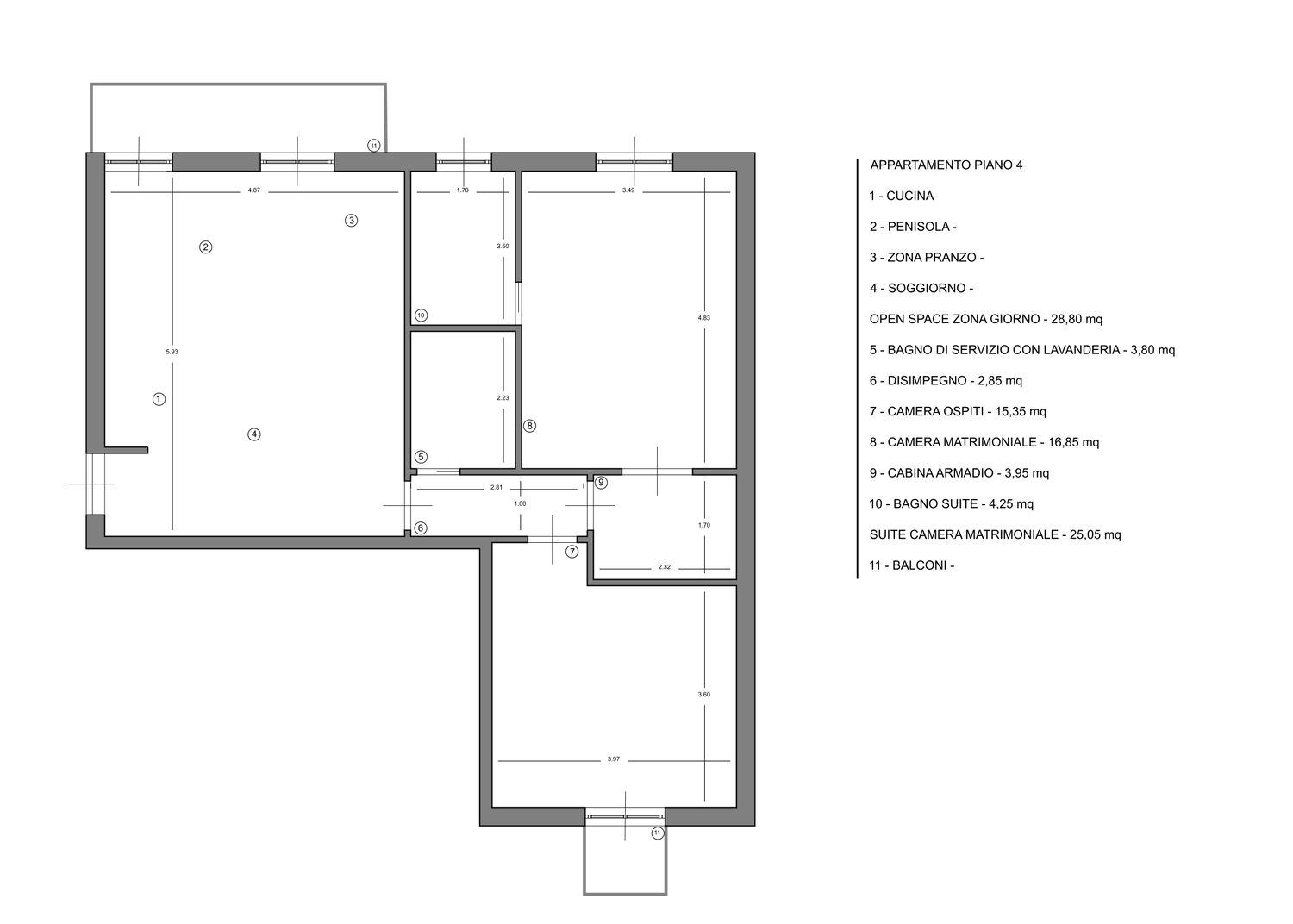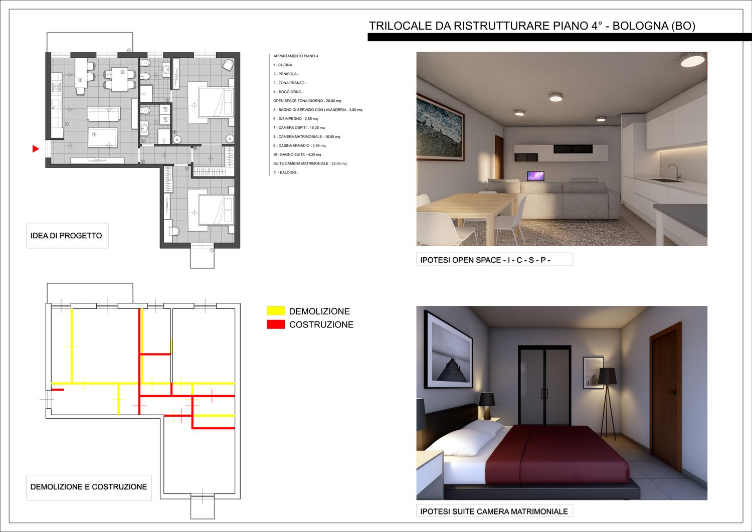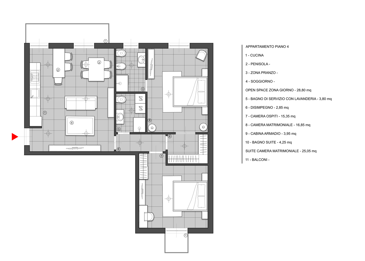 PIANTA PIANO QUARTO: Dall’ingresso si accede ad un grande open space circa 28,00 mq, a sinistra dello stesso vi è una grande cucina a vista con penisola,una zona pranzo ed un soggiorno. Ingrandendo leggermente le dimensioni del bagno a discapito dell’open - space, ho pensato di ricavare due zone servizi la prima si accede dal disimpegno dove sono presenti una doccia, un lavabo, un sanitario e una lavatrice con asciugatrice affiancate che se impilati permettono di poter inserire anche un bidet, nell’altro ci si accede direttamente dalla camera matrimoniale dopo aver attraversato la cabina armadio da una porta vetrata.