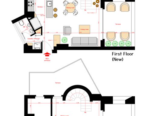 Objective: remove the dividing wall between the kitchen and the living room and create a single space with a small bathroom immediately to the left of the entrance.