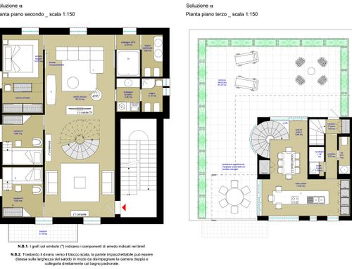 – Terrace to be used all-year-round. Dining area needs to be protected (covered) more extensively towards the terrace outer-wall where you can find the french window; area 'relax' with mobile coverage (umbrella or gazebo, etc). System of pots and plants on the entire terrace perimeter (30 meters linear). Optional to add a small gym area with 2 machines.