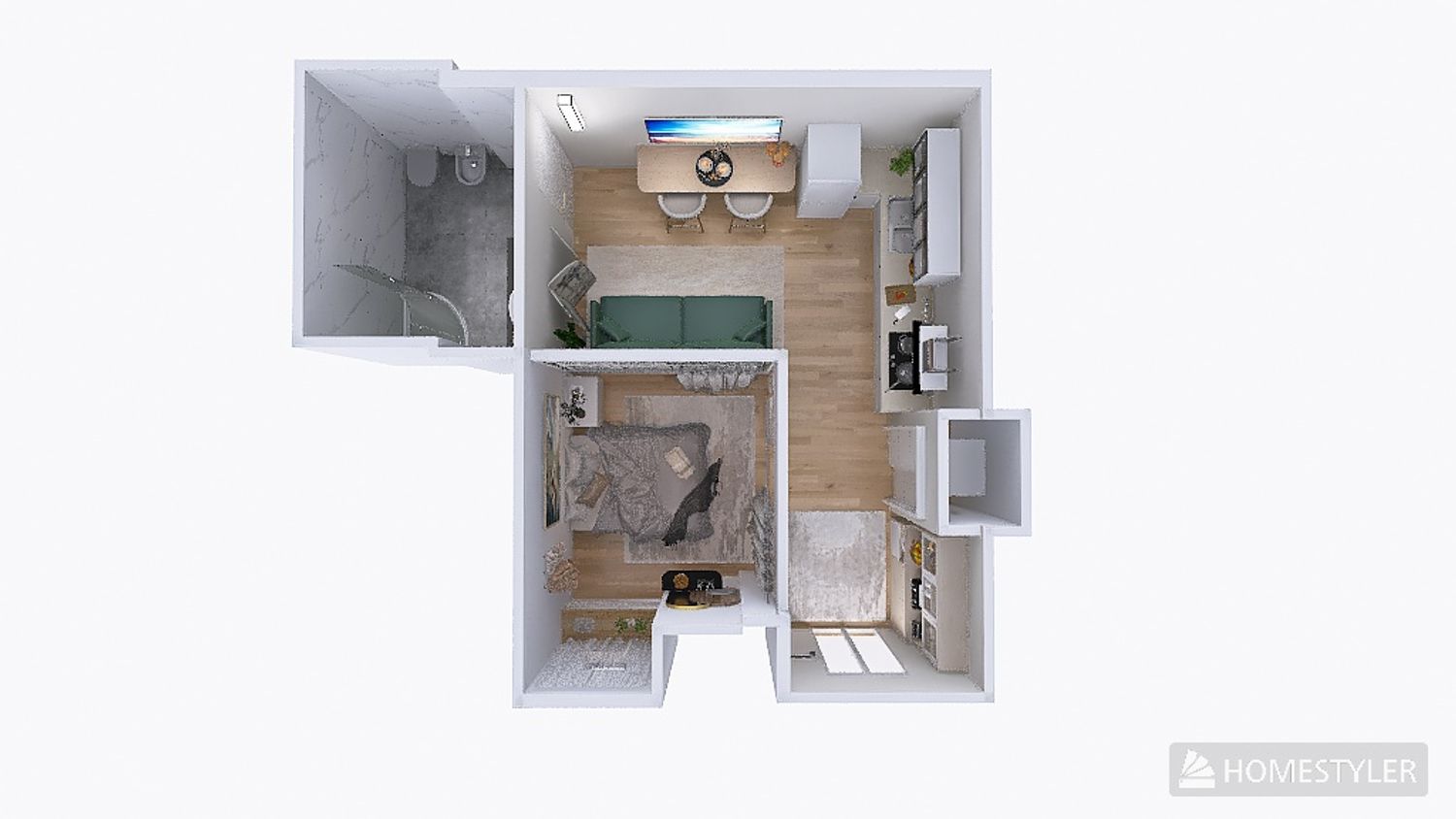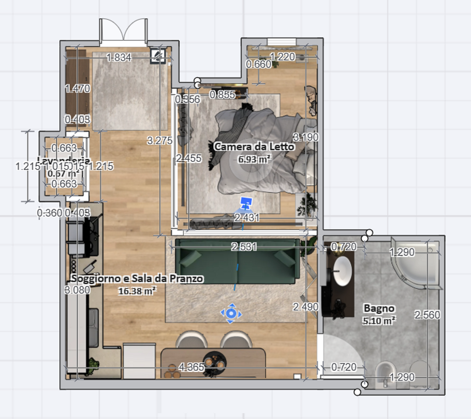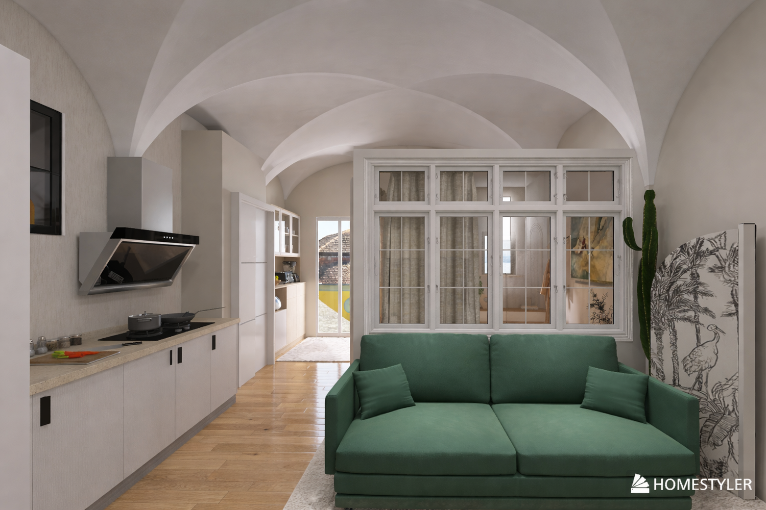 Il progetto prevede la riorganizzazione del monolocale per migliorare funzionalità, comfort e attrattività per l’affitto turistico. Lo spazio viene suddiviso in una zona giorno con angolo cottura compatto e area living, e in una piccola camera da letto separata tramite una parete vetrata che permette di mantenere visibili le caratteristiche volte a botte e garantire luminosità. L’intervento valorizza l’atmosfera mediterranea della casa con materiali naturali e colori ispirati al mare, creando un forte impatto visivo nelle foto online. Nella piccola nicchia esistente viene inoltre realizzato un vano tecnico chiuso da tramezzi, destinato ad accogliere la lavatrice, così da ottimizzare gli spazi e mantenere ordinata la zona bagno.