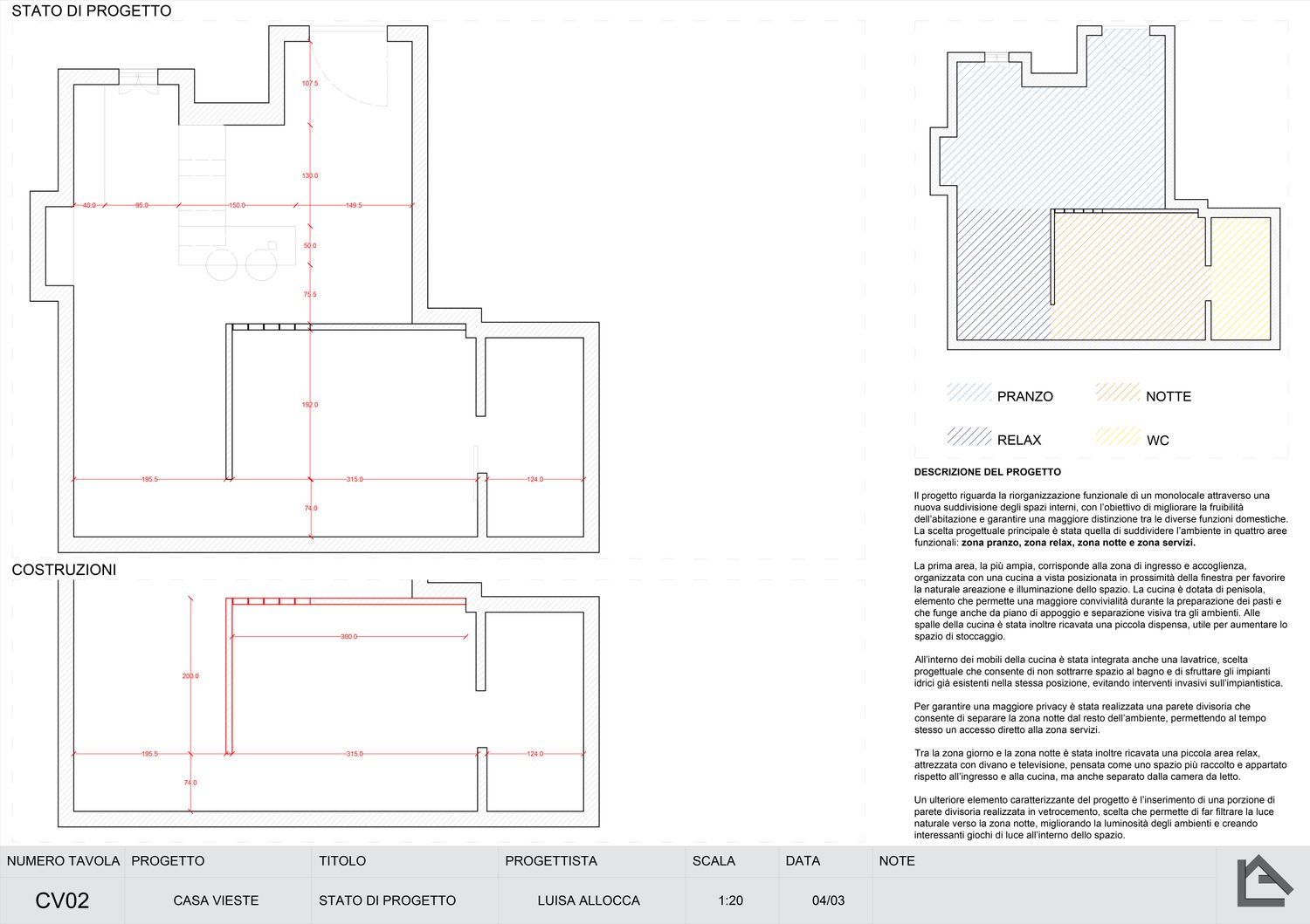 Il progetto riguarda la riorganizzazione funzionale di un monolocale attraverso una nuova suddivisione degli spazi interni, con l’obiettivo di migliorare la fruibilità dell’abitazione e garantire una maggiore distinzione tra le diverse funzioni domestiche. La scelta progettuale principale è stata quella di suddividere l’ambiente in quattro aree funzionali: zona pranzo, zona relax, zona notte e zona servizi.