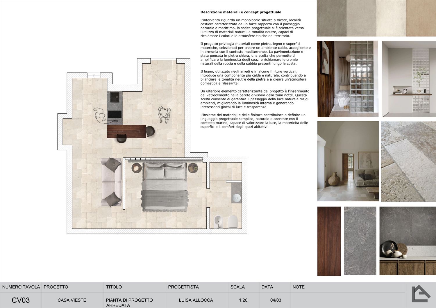Considerando che l’intervento riguarda un monolocale situato a Vieste, località costiera caratterizzata da un forte rapporto con il paesaggio naturale e marittimo, la scelta progettuale si è orientata verso l’utilizzo di materiali naturali e tonalità neutre, capaci di richiamare i colori e le atmosfere tipiche del territorio.