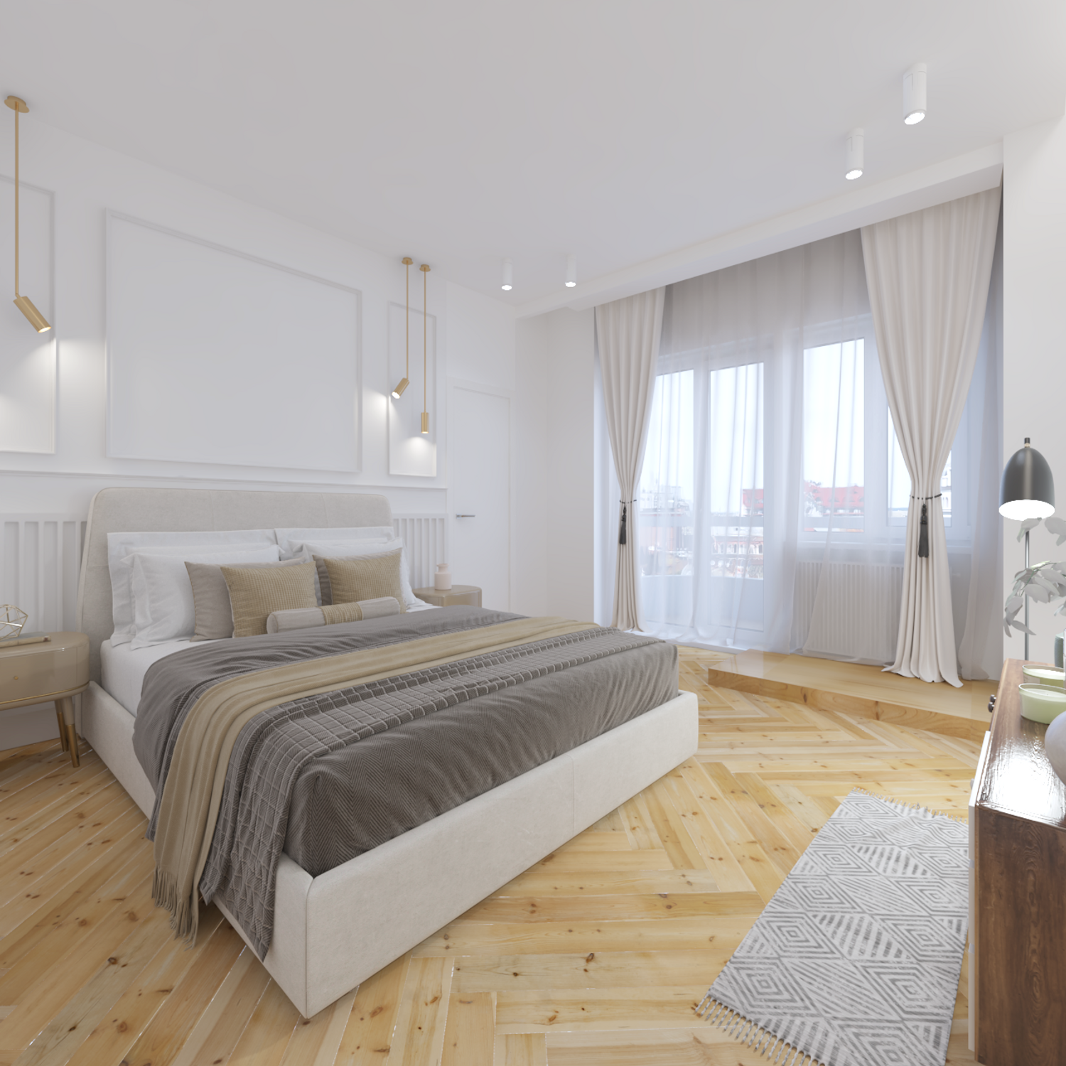 In the master bedroom, the layout includes a double bed and a console (you may place a mirror instead of artwork above it if you prefer). A full-width curtain was designed for the window and terrace door. The fabric, color, and material of this curtain, as well as the wall design, bed, and bedside lamps, were carefully coordinated to create a warm and refined atmosphere.