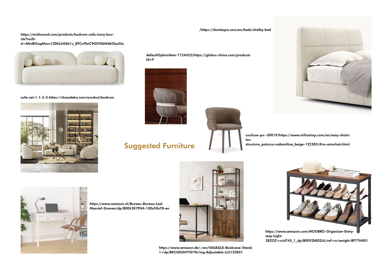 I have also prepared renderings of each space, along with photos and links to the suggested furniture pieces, so that you can better visualize and understand the proposed design.