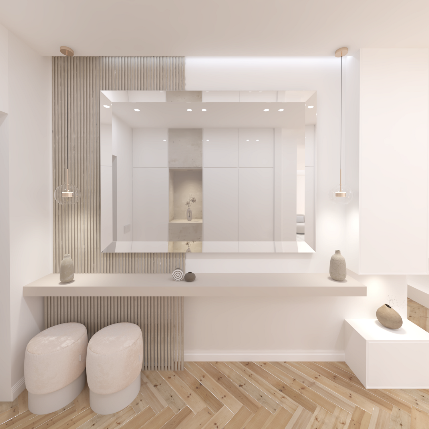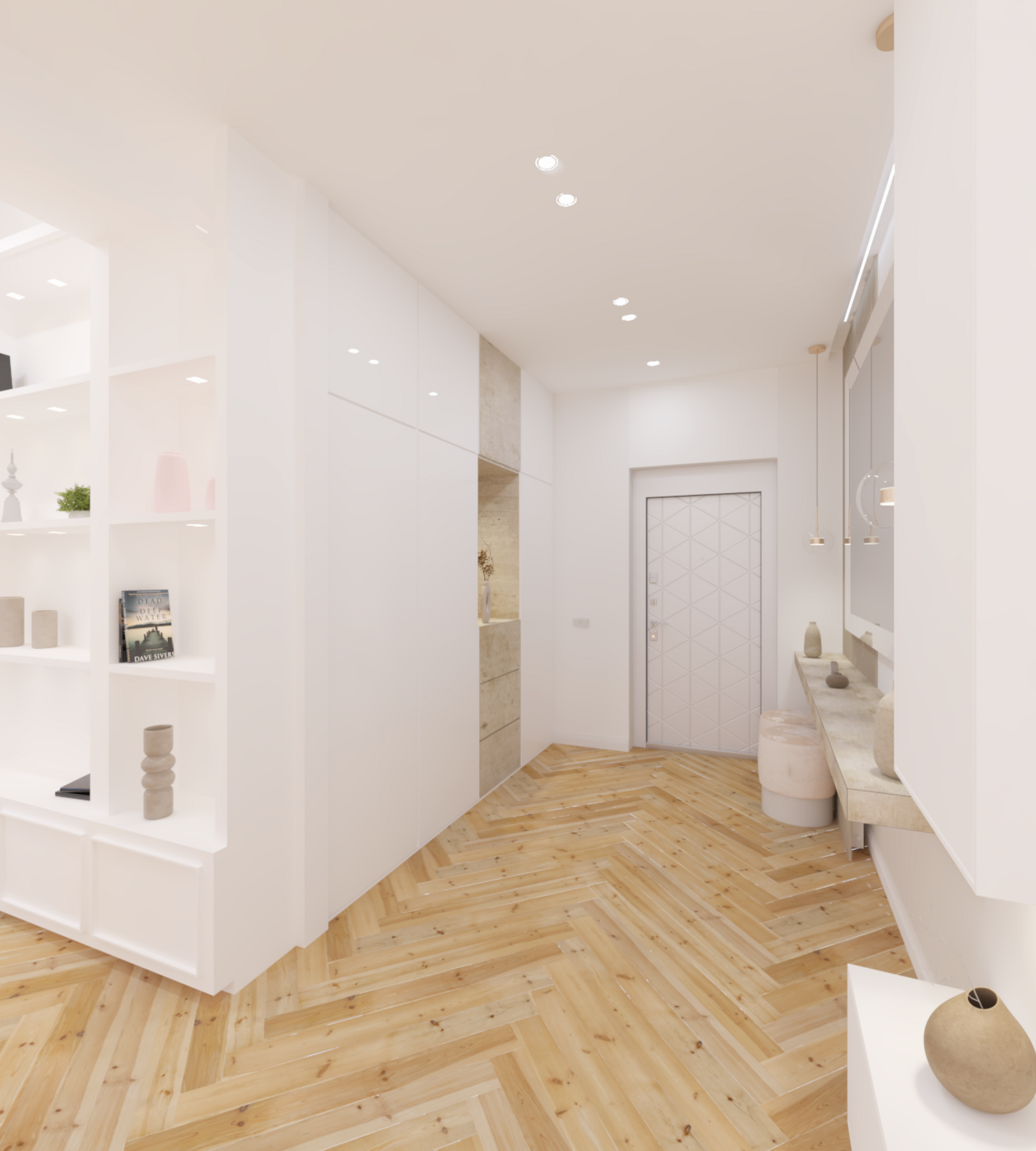 Next to the mirror, a storage cabinet was designed with a central open shelf highlighted by focused lighting, ideal for displaying decorative pieces. Two wall lamps were placed on both sides of the mirror, and finally, two poufs were added for seating. In the wall niche opposite the mirror, I designed a full-height storage unit. The upper section is intended for items used less frequently, while the lower part is divided — one side serving as a shoe and coat closet, and the other as a vacuum cleaner cabinet. The central section of this unit features a decorative area made of a different material, enhanced by accent lighting.