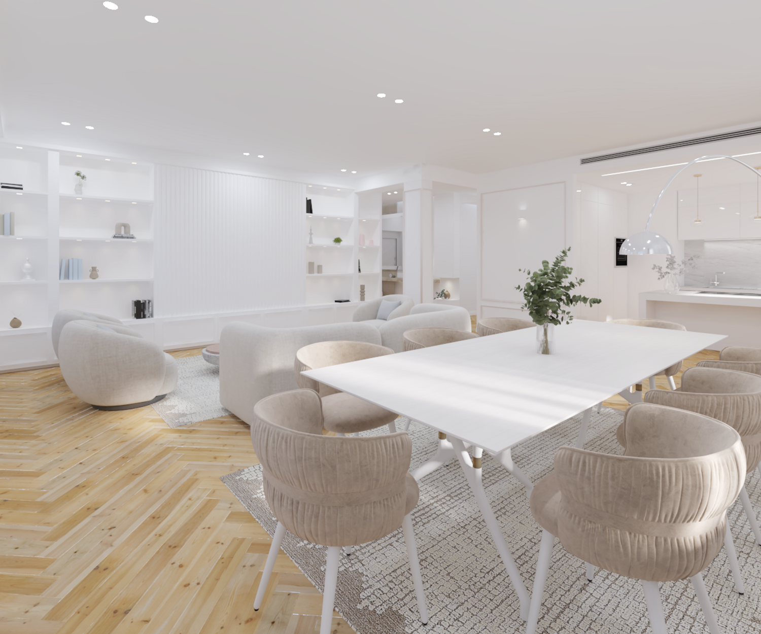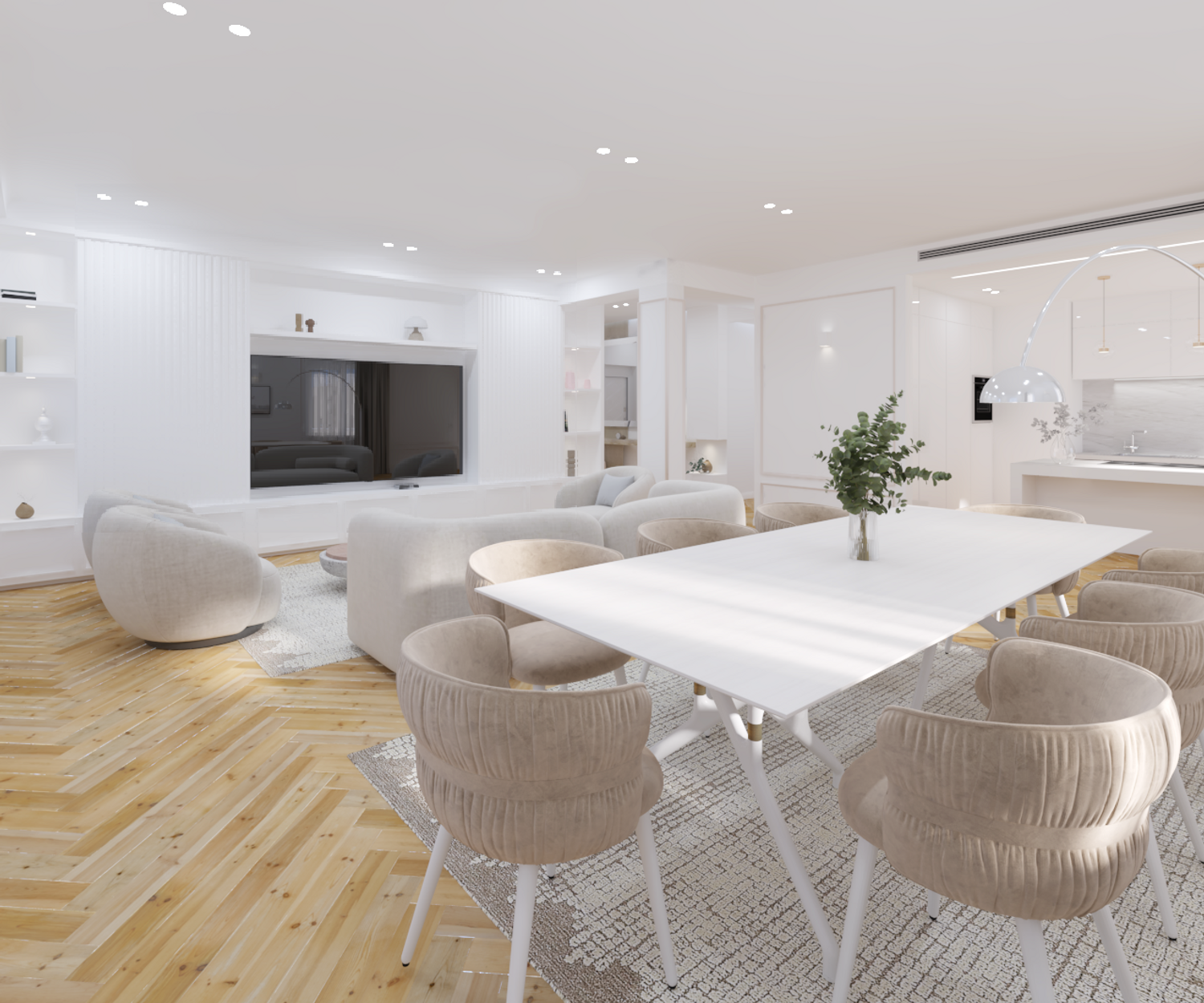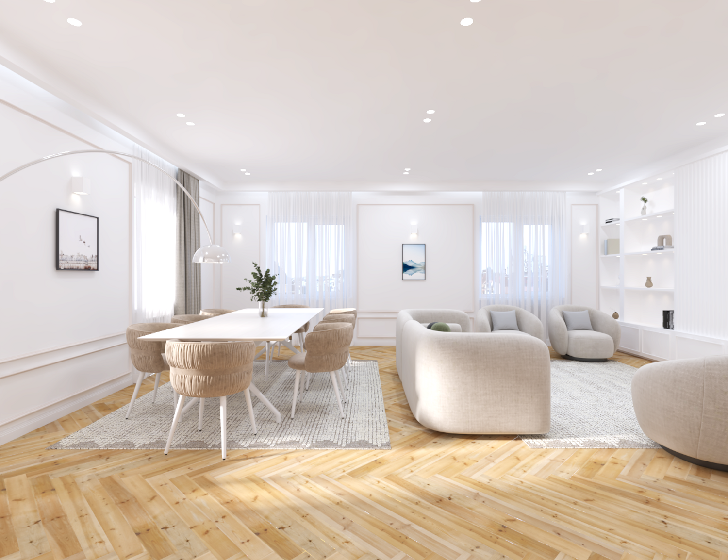 For the dining area, I kept your existing white table and paired it with a rug that harmonizes with the parquet and the warm tones of the overall design. The chairs, living room furniture, rugs, and curtains were all selected according to the references you provided. The dining area is shown for eight seats, but the layout allows for additional chairs if desired.
