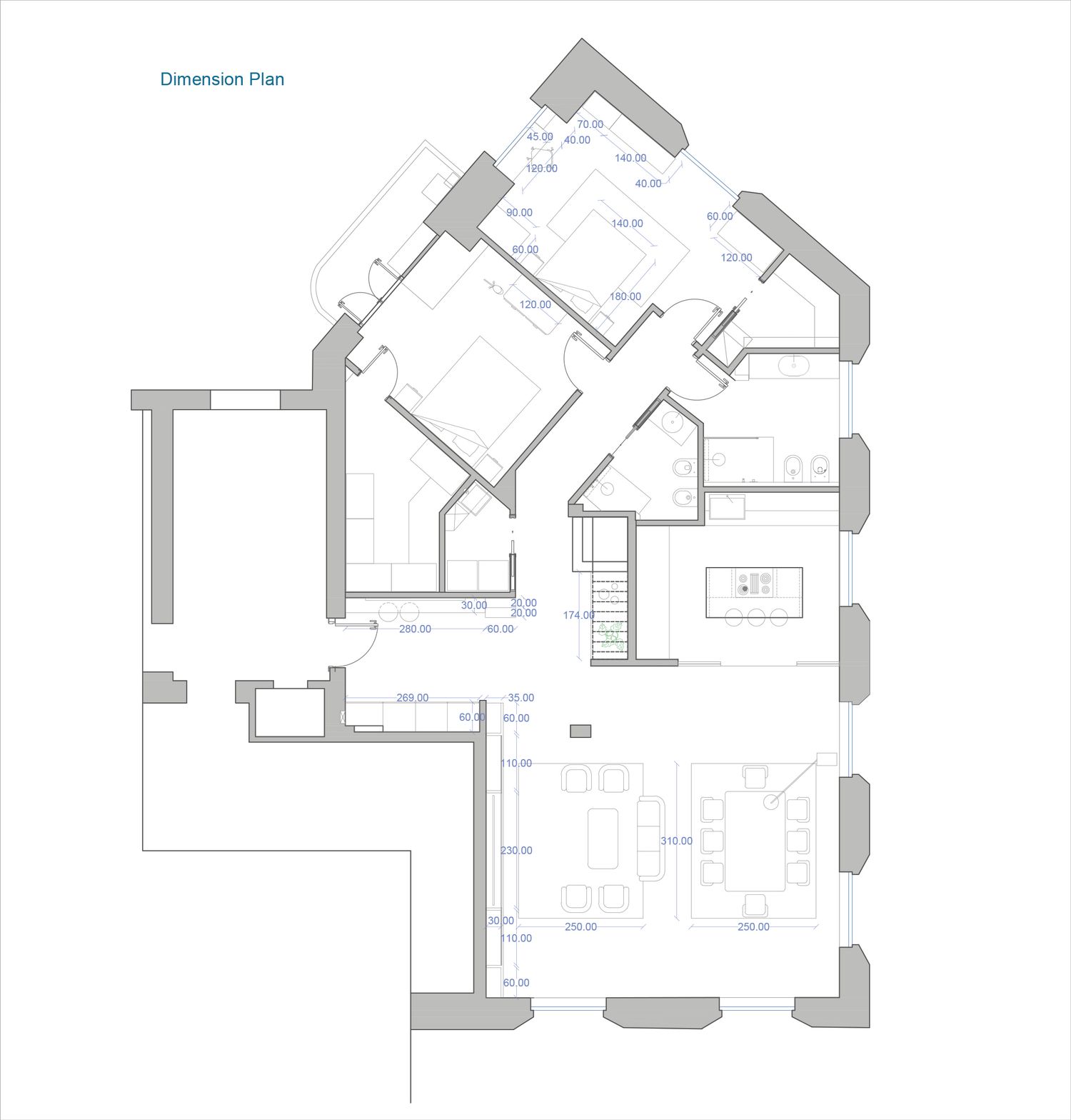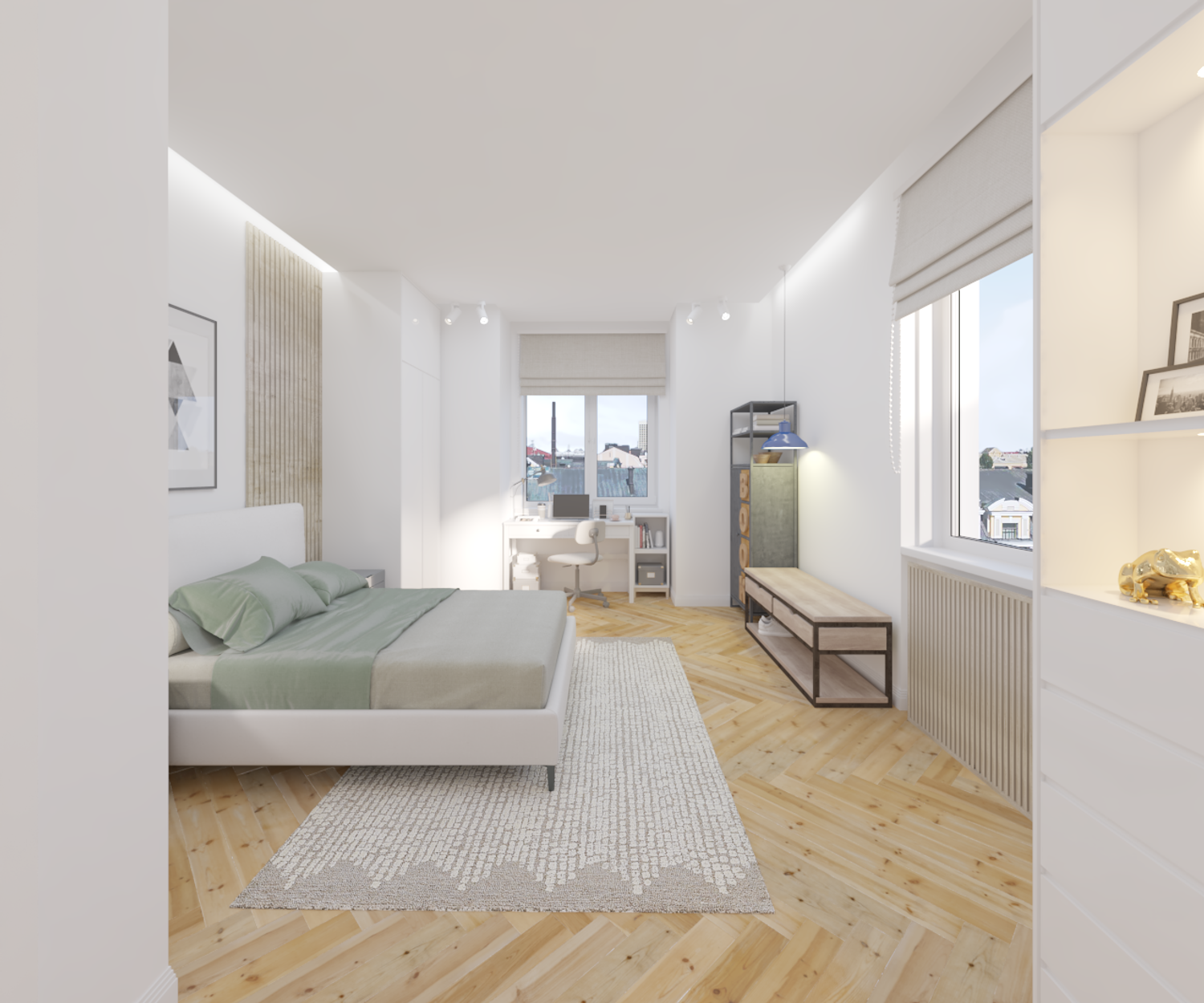 In the second bedroom, the existing white bed (with its current dimensions) was kept. Next to it, I designed a full-height wardrobe (90 cm wide, 60 cm deep) for clothing storage — or it may be made shallower if not used for that purpose.