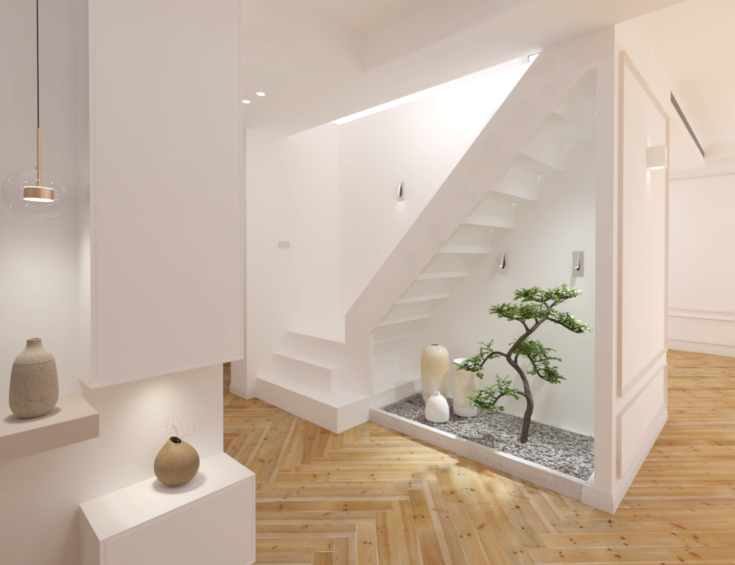 The space under the stairs has been transformed into an indoor garden, where you can place your favorite small tree. With proper plant lighting, this green corner will contribute to both the atmosphere and the natural beauty of the space.