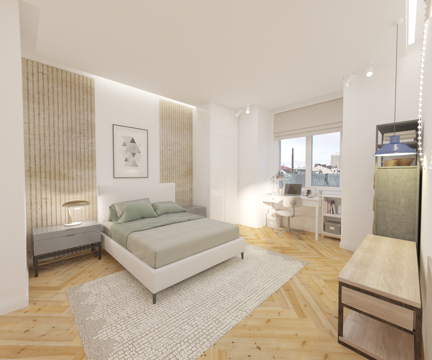 A linear ceiling light was placed above the bed to emphasize the wall decoration and the framed element behind it. A bedside lamp sits on the nightstand. The desk and its shelving unit are positioned under the window to make the best use of the natural light and the wall recess.
