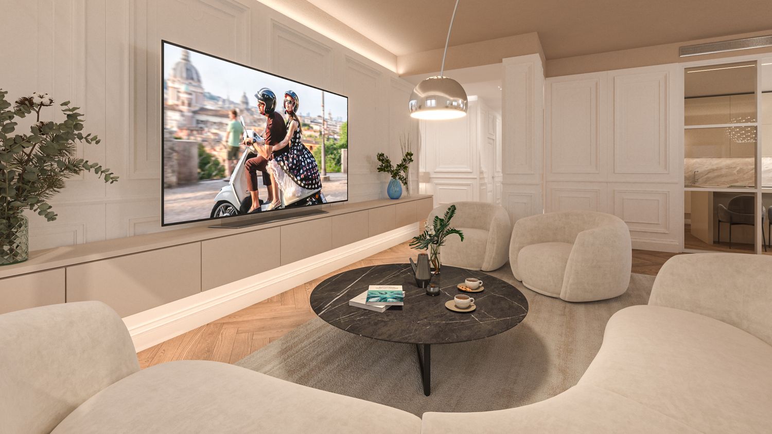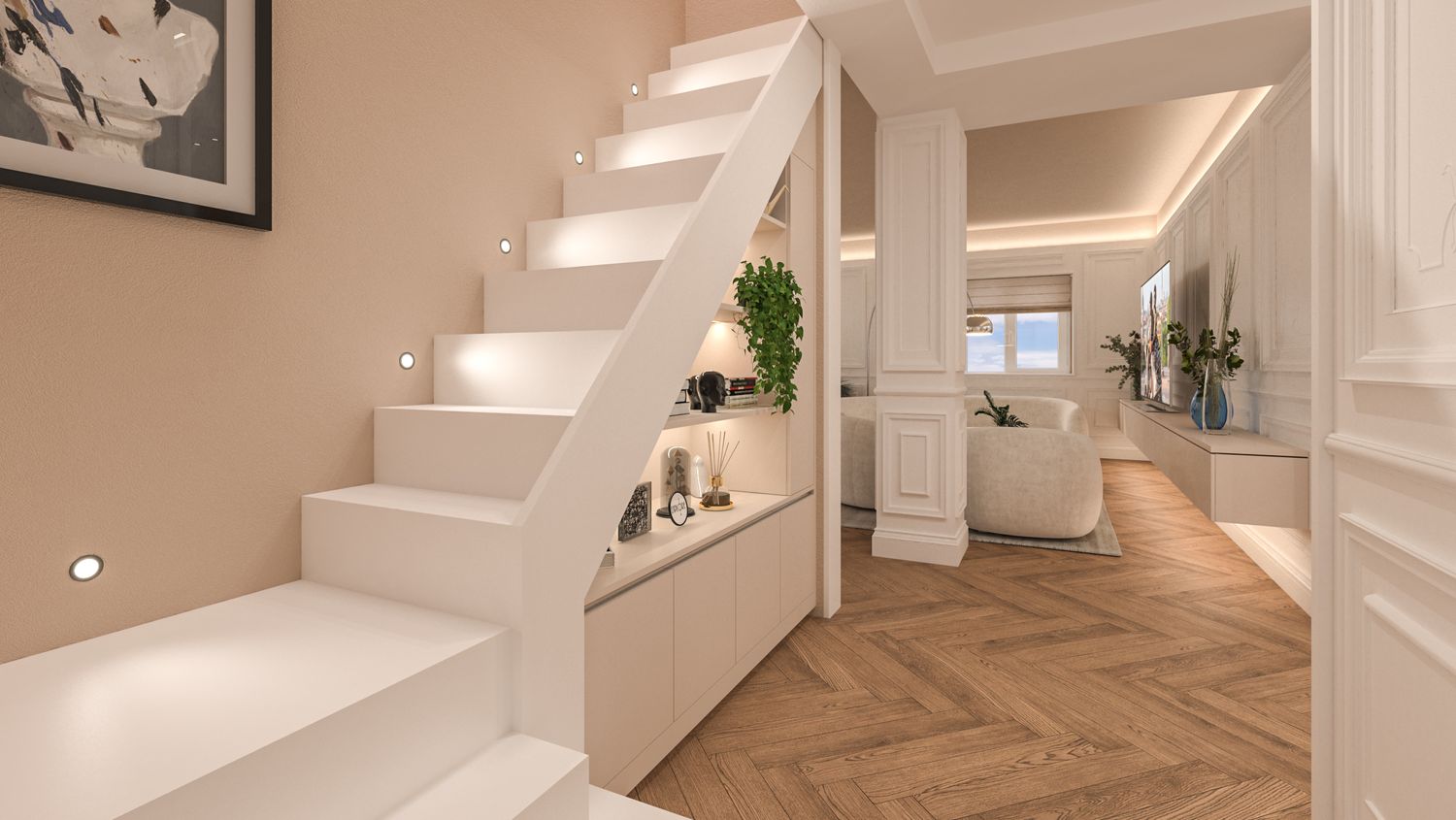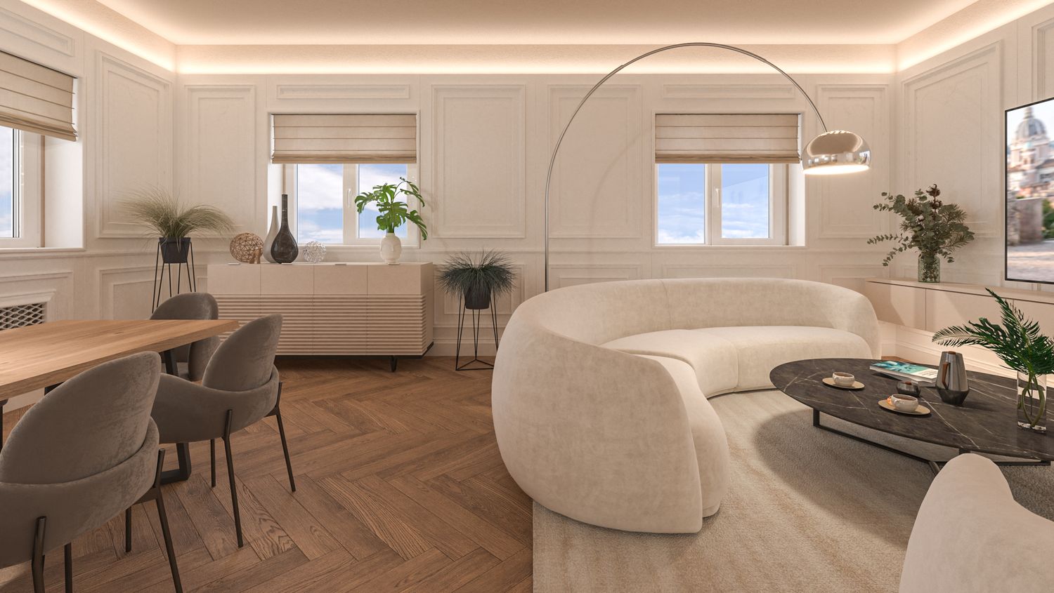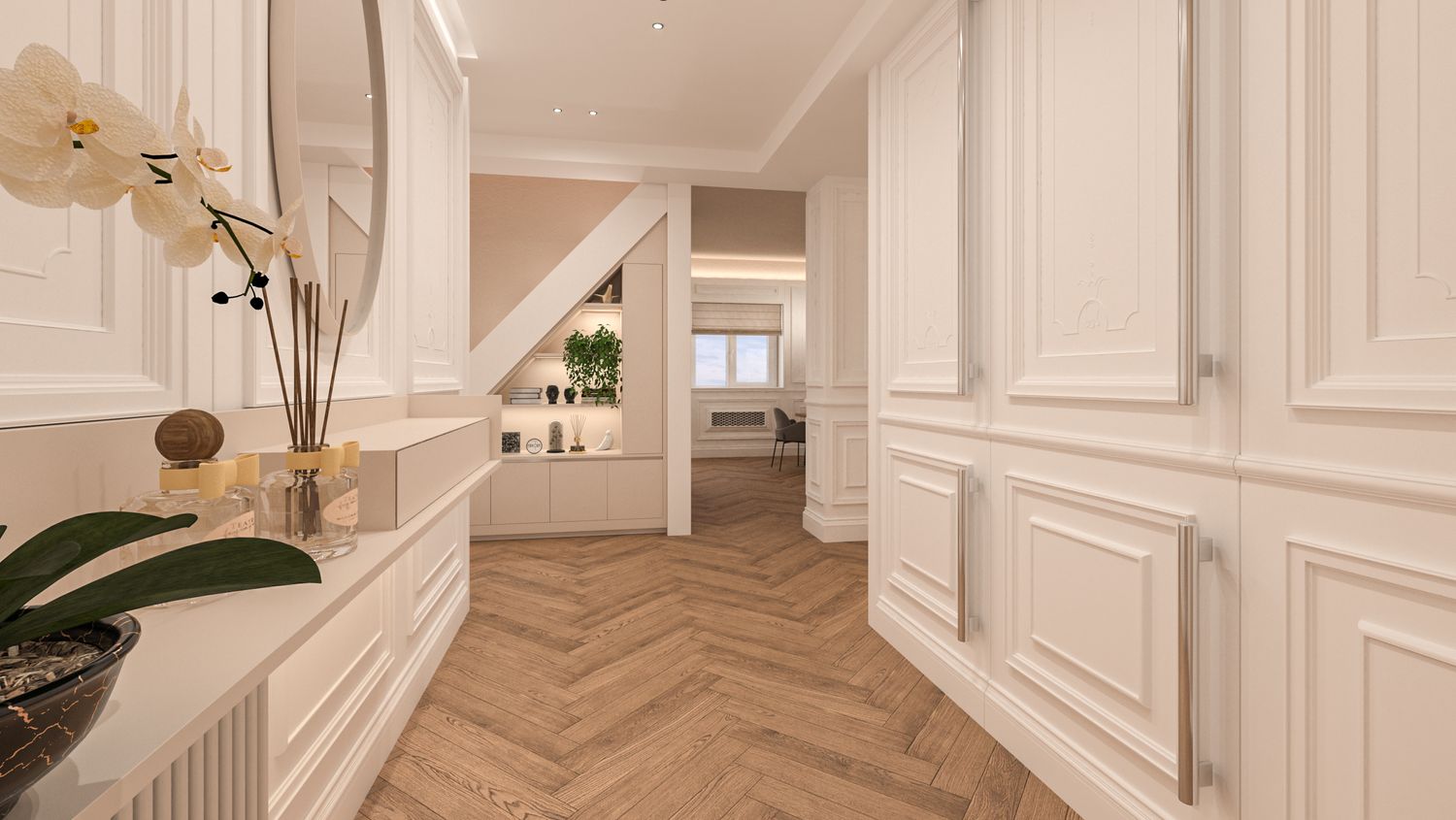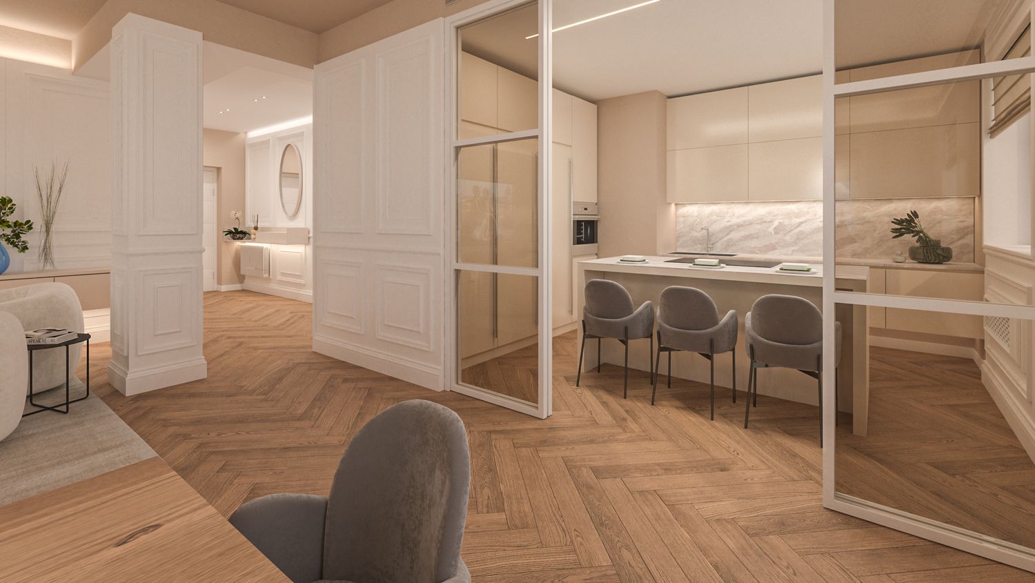 Il progetto d’interni interpreta un’eleganza classico-contemporanea attraverso una palette di toni caldi e neutri – beige, avorio e bianco RAL 9010 – che avvolgono l’appartamento in un’atmosfera accogliente e sofisticata. Senza modificare pavimenti o pareti, l’intervento si concentra sull’arredo e sulla decorazione: boiserie rettangolari, tessuti morbidi, linee pulite e volumi equilibrati definiscono ambienti armoniosi e luminosi. Nella zona giorno la lampada ad arco Castiglioni diventa protagonista accanto a sedute avvolgenti e a un tavolo dal piano materico in legno massello, mentre le porte in vetro bronzato scorrono per separare cucina e sala da pranzo ma senza perdere la profondità dell'ambiente. Le camere da letto combinano comfort e stile, con testiere pannellate e boiserie color avorio chiaro, luci soffuse e arredi su misura. L'ingresso si è arricchito di una consolle aerea, un armadio a scomparsa nella boiserie e un mobile contenitivo sottoscala di grande impatto. Un progetto che celebra la luce, la matericità e l’equilibrio, trasformando uno spazio nuovo in una casa dal carattere caldo, raffinato e senza tempo.
