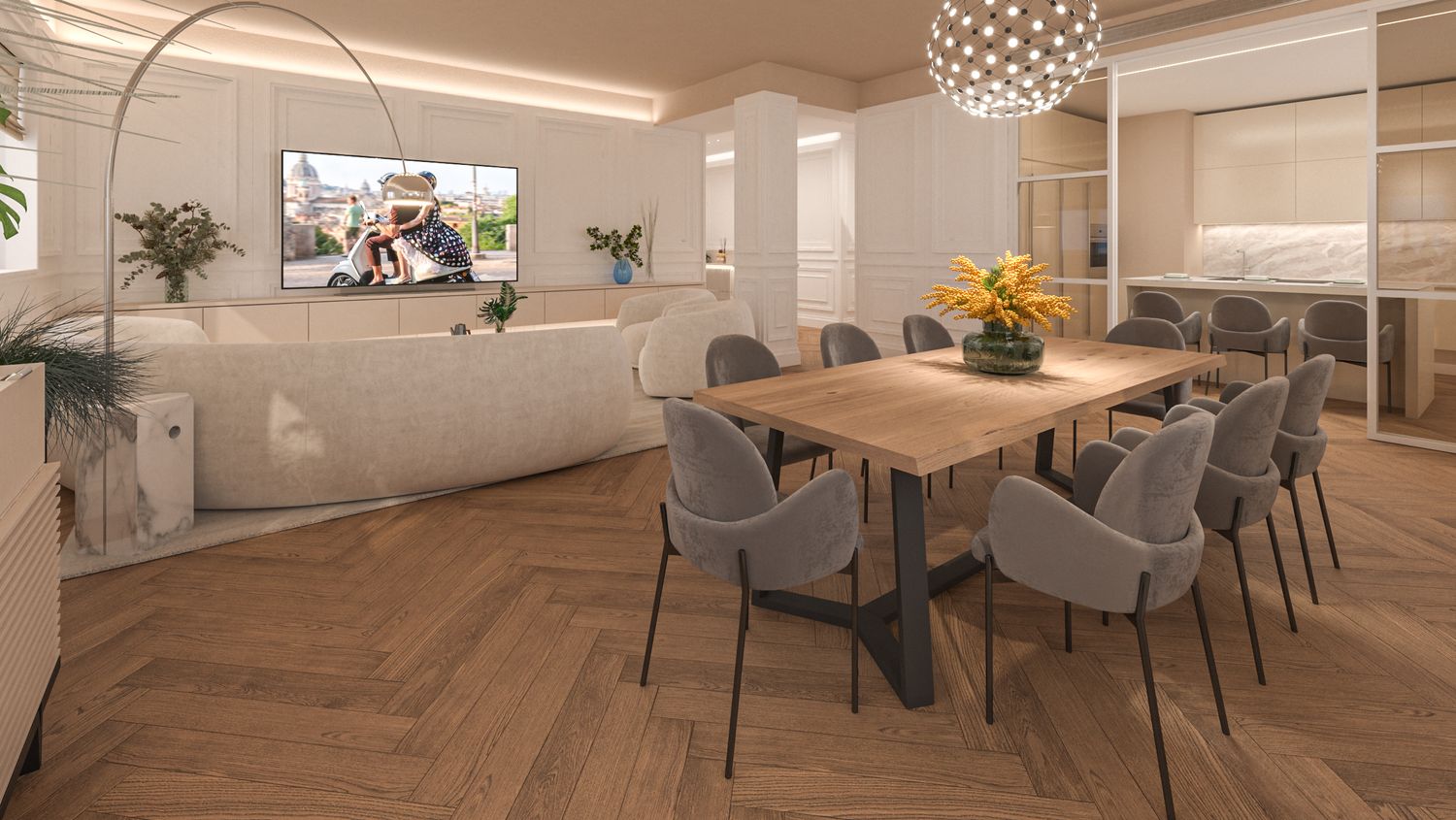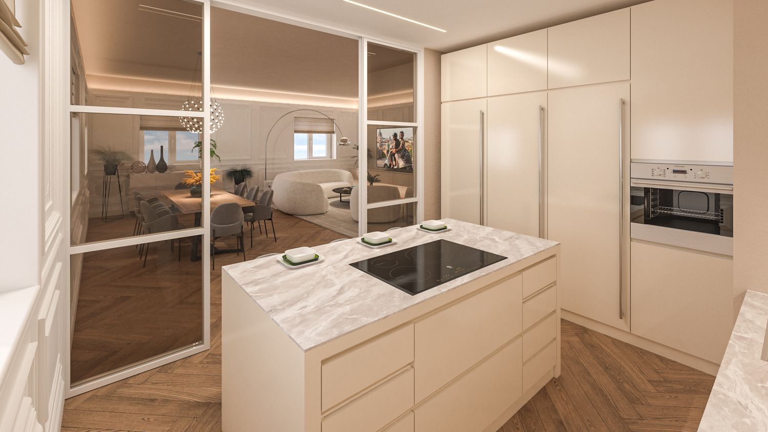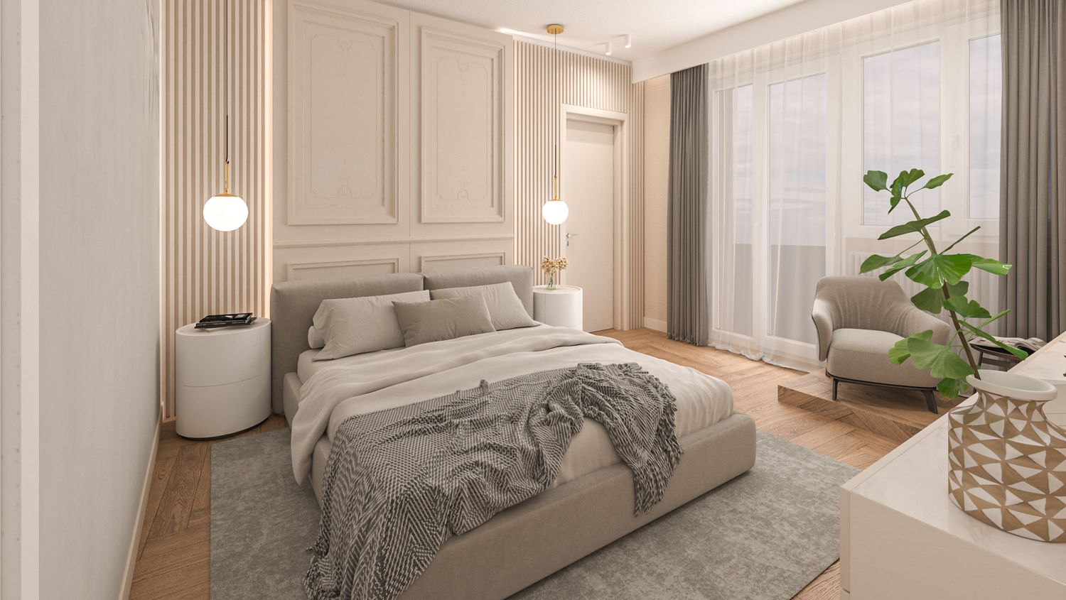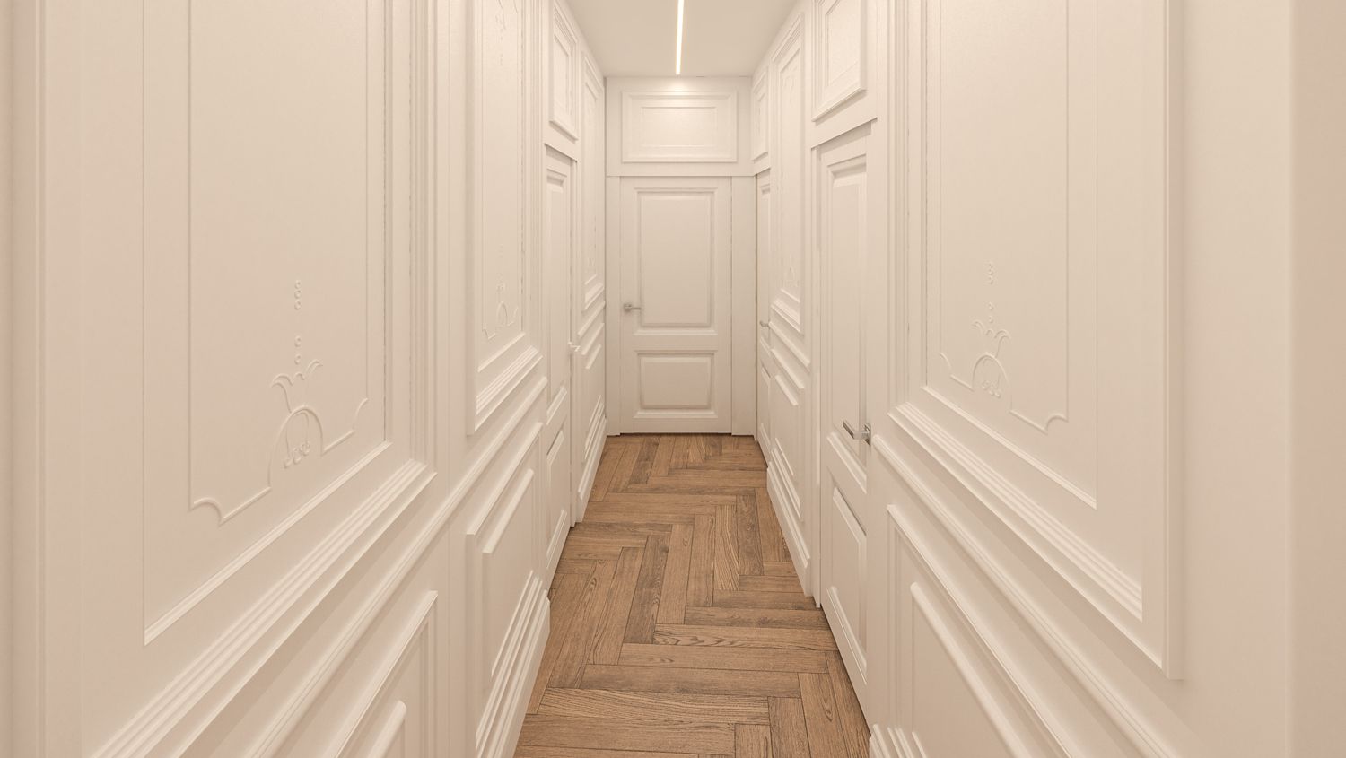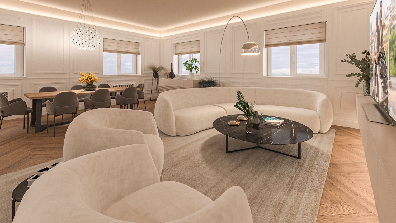Il progetto d’interni interpreta un’eleganza classico-contemporanea attraverso una palette di toni caldi e neutri – beige, avorio e bianco RAL 9010 – che avvolgono l’appartamento in un’atmosfera accogliente e sofisticata. Senza modificare pavimenti o pareti, l’intervento si concentra sull’arredo e sulla decorazione: boiserie rettangolari, tessuti morbidi, linee pulite e volumi equilibrati definiscono ambienti armoniosi e luminosi. Nella zona giorno la lampada ad arco Castiglioni diventa protagonista accanto a sedute avvolgenti e a un tavolo dal piano materico in legno massello, mentre le porte in vetro bronzato scorrono per separare cucina e sala da pranzo ma senza perdere la profondità dell'ambiente. Le camere da letto combinano comfort e stile, con testiere pannellate e boiserie color avorio chiaro, luci soffuse e arredi su misura. L'ingresso si è arricchito di una consolle aerea, un armadio a scomparsa nella boiserie e un mobile contenitivo sottoscala di grande impatto. Un progetto che celebra la luce, la matericità e l’equilibrio, trasformando uno spazio nuovo in una casa dal carattere caldo, raffinato e senza tempo.