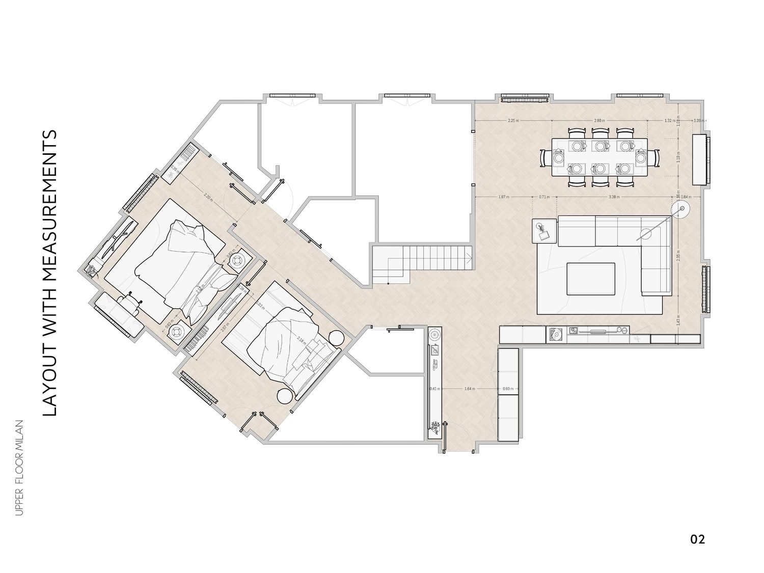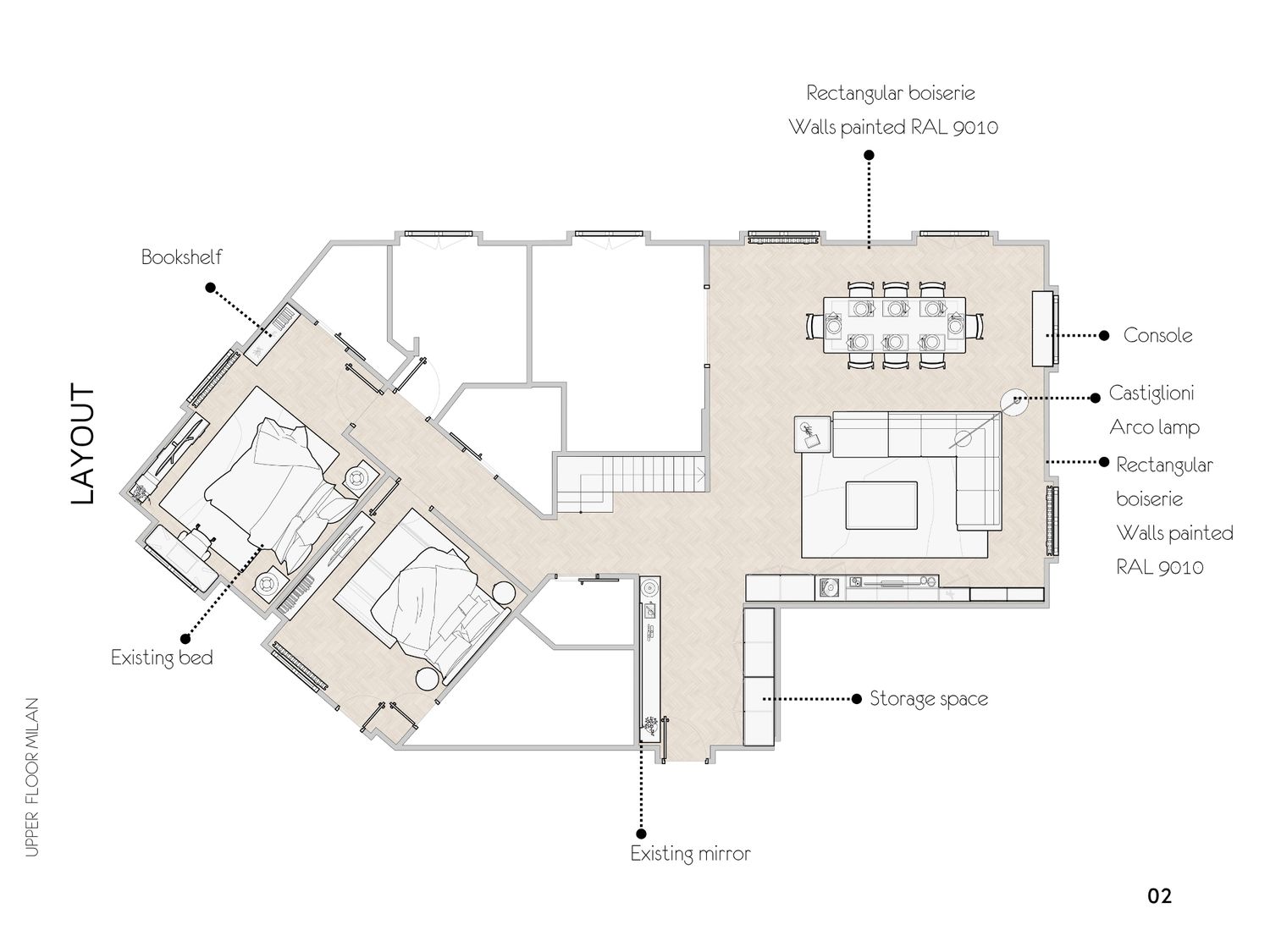 The space beneath the staircase is thoughtfully utilized as a focal point upon entering the apartment, featuring a console that combines visual interest with functional storage.