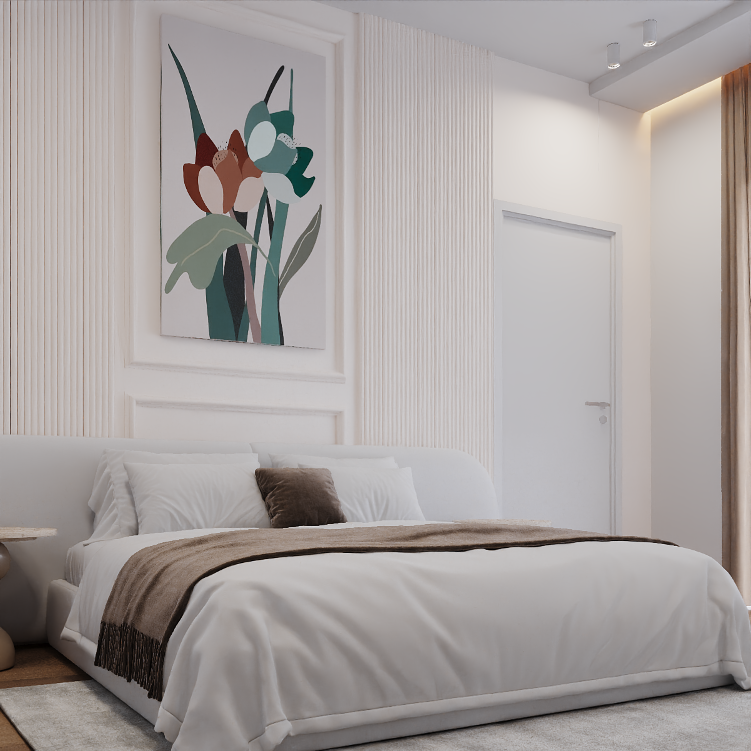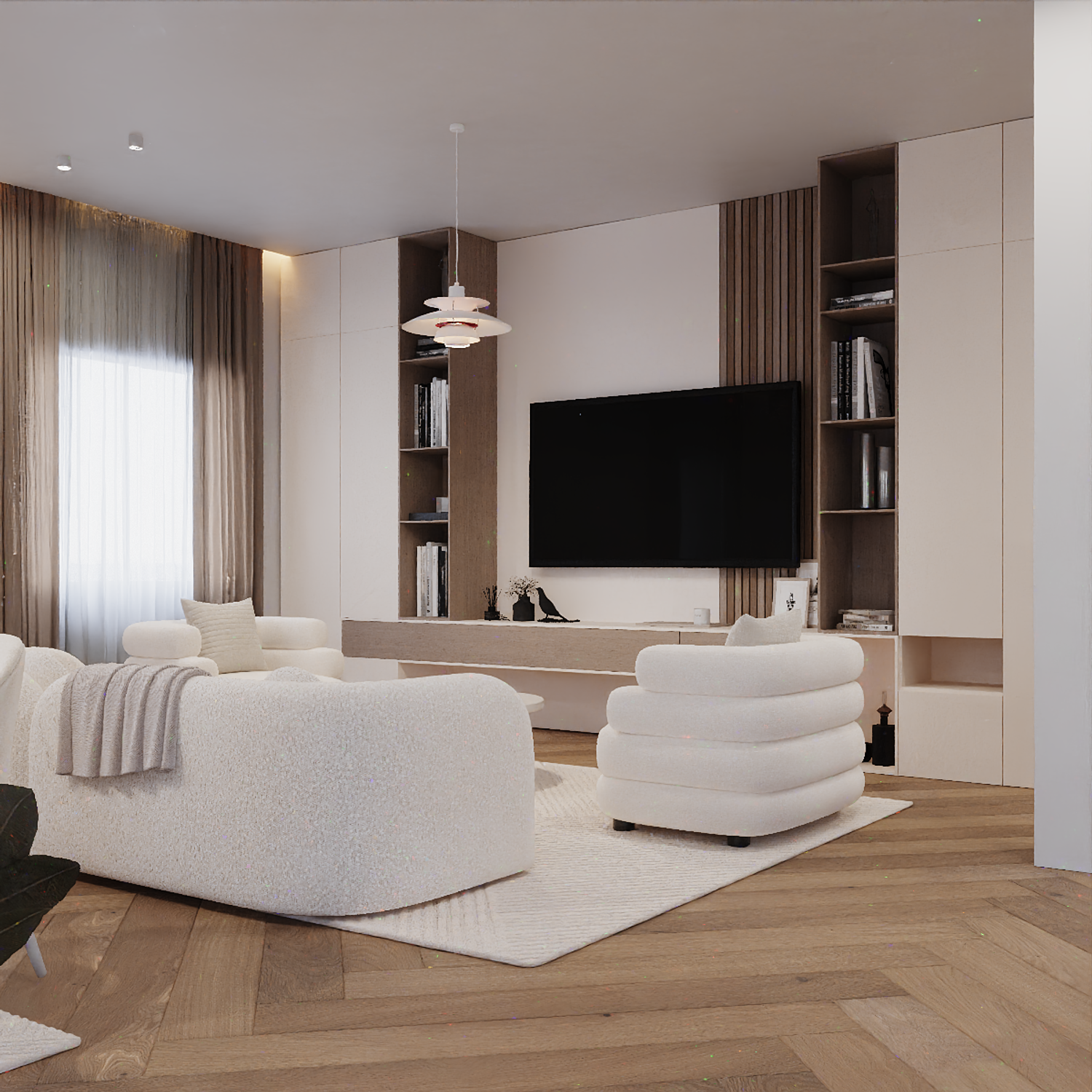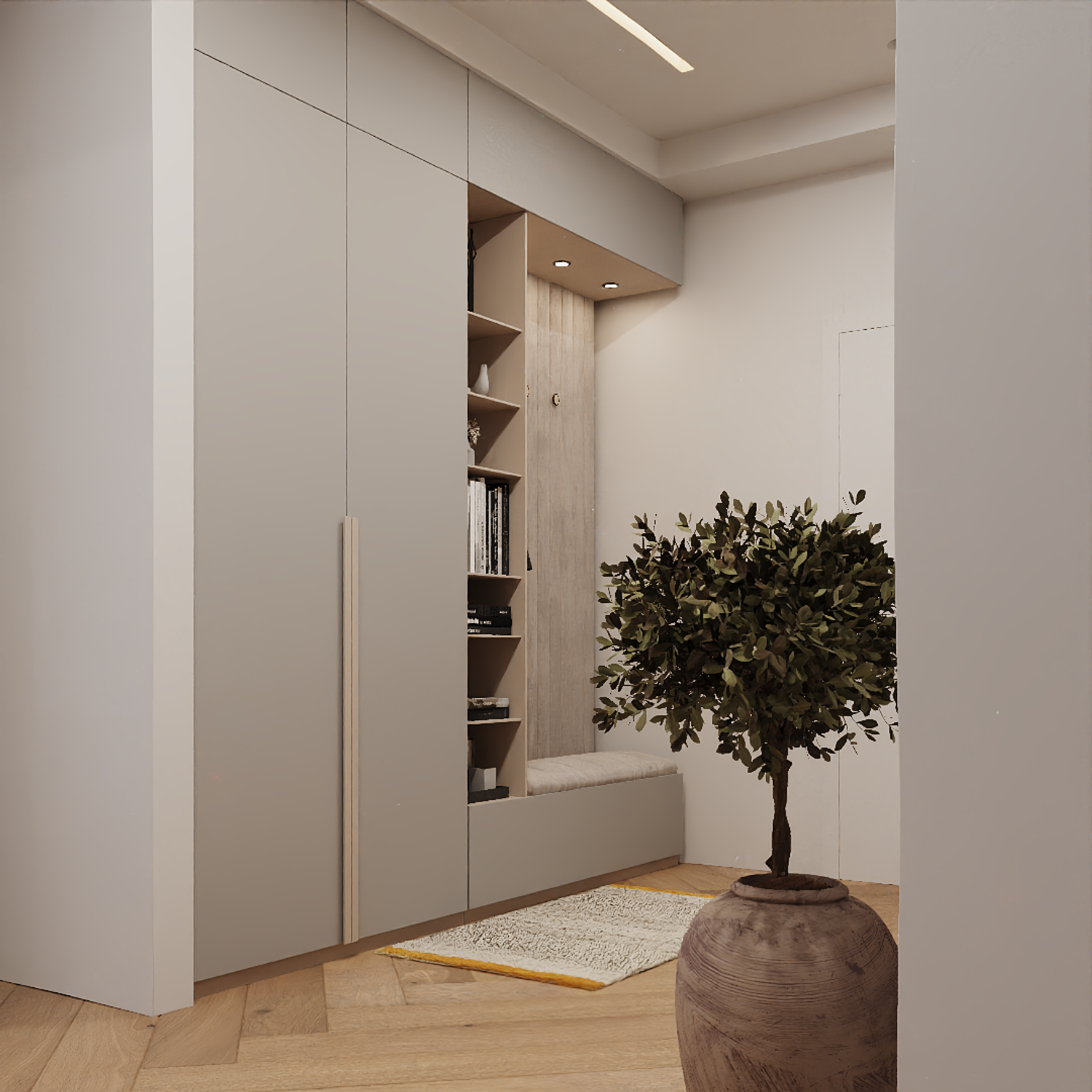 This project was designed as a modern contemporary apartment, featuring a warm and inviting color palette of beige, ivory white, and soft neutral tones. The entrance area was reimagined to include a custom hallway cabinet and shelving system that provides functional yet elegant storage.