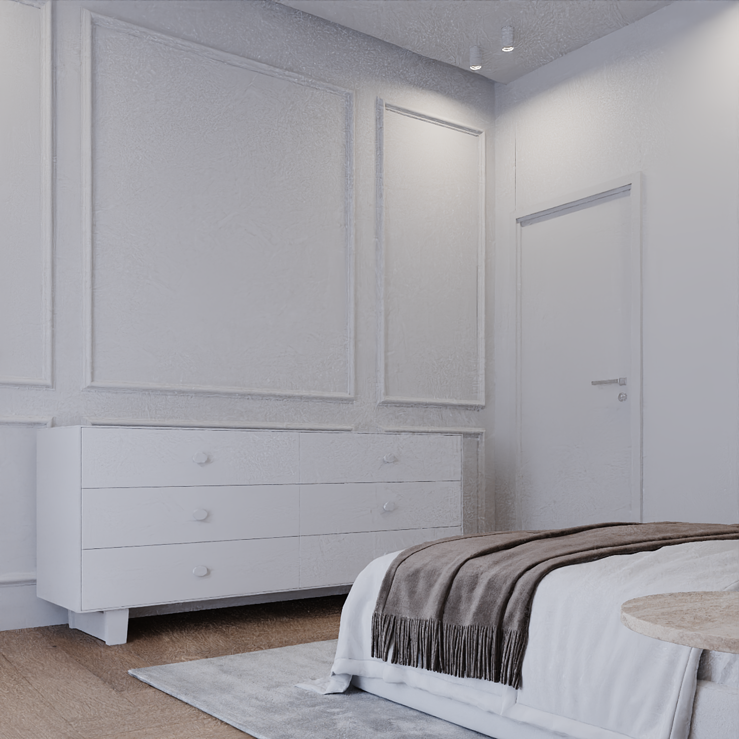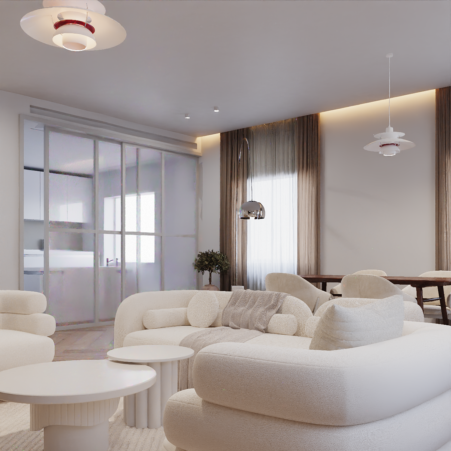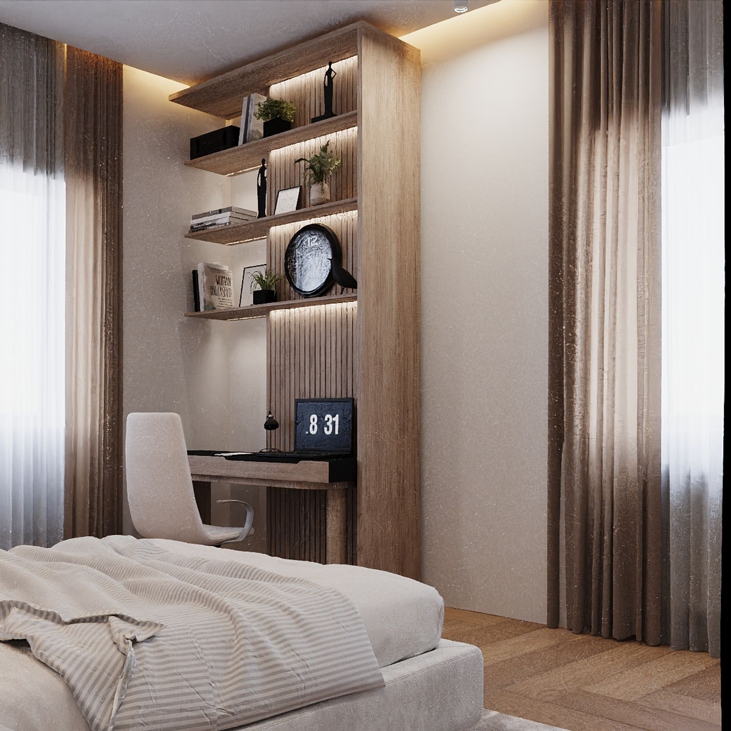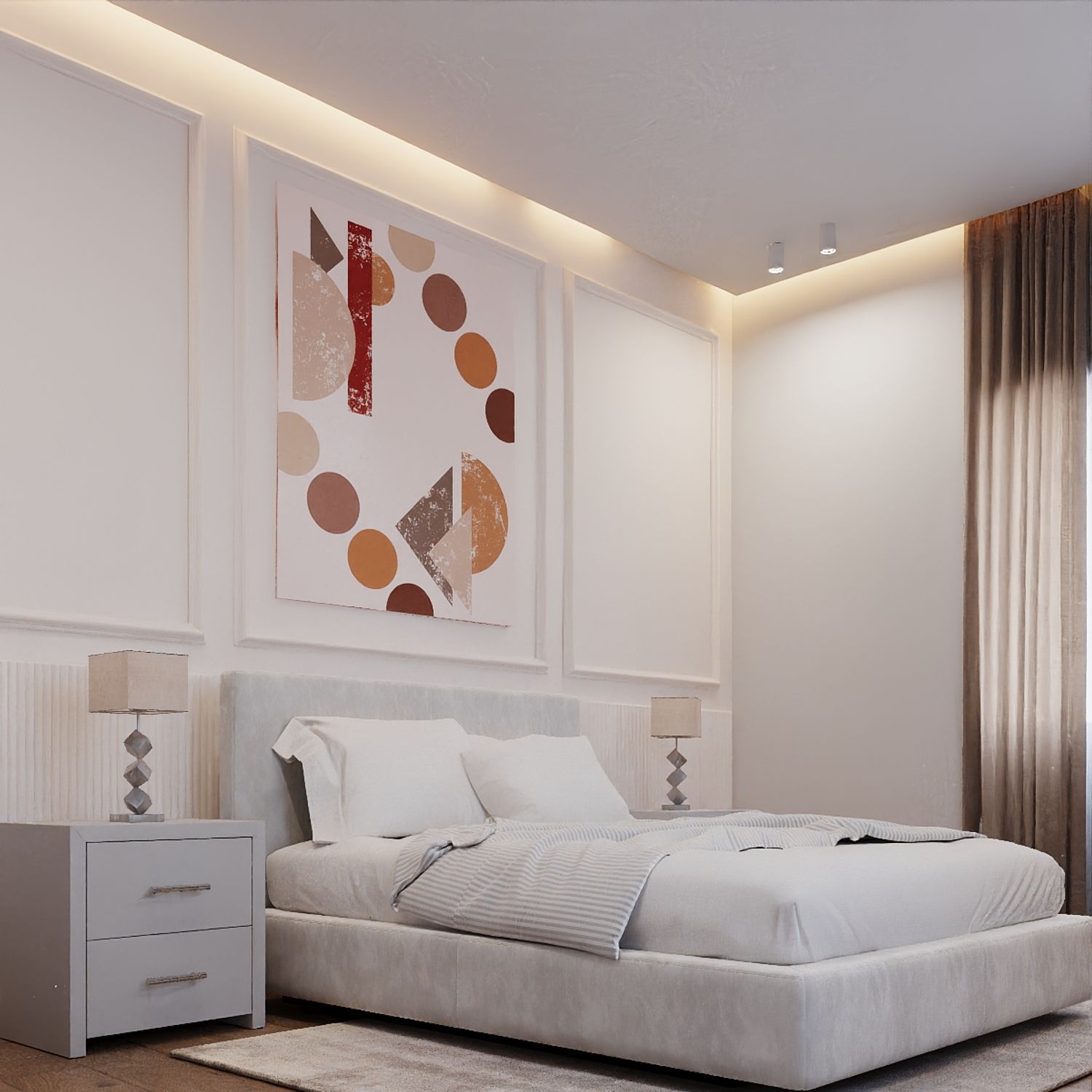 This project was designed as a modern contemporary apartment, featuring a warm and inviting color palette of beige, ivory white, and soft neutral tones. The entrance area was reimagined to include a custom hallway cabinet and shelving system that provides functional yet elegant storage.