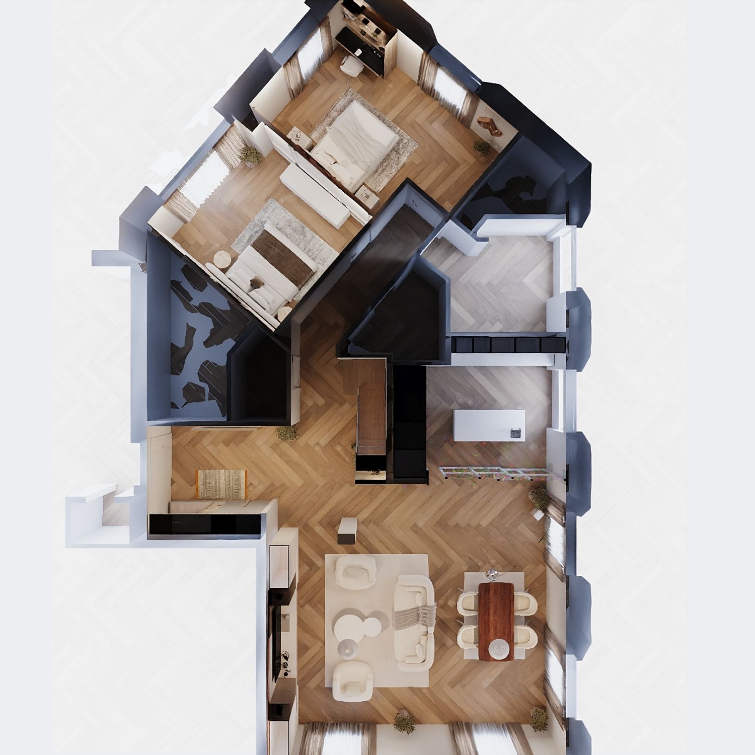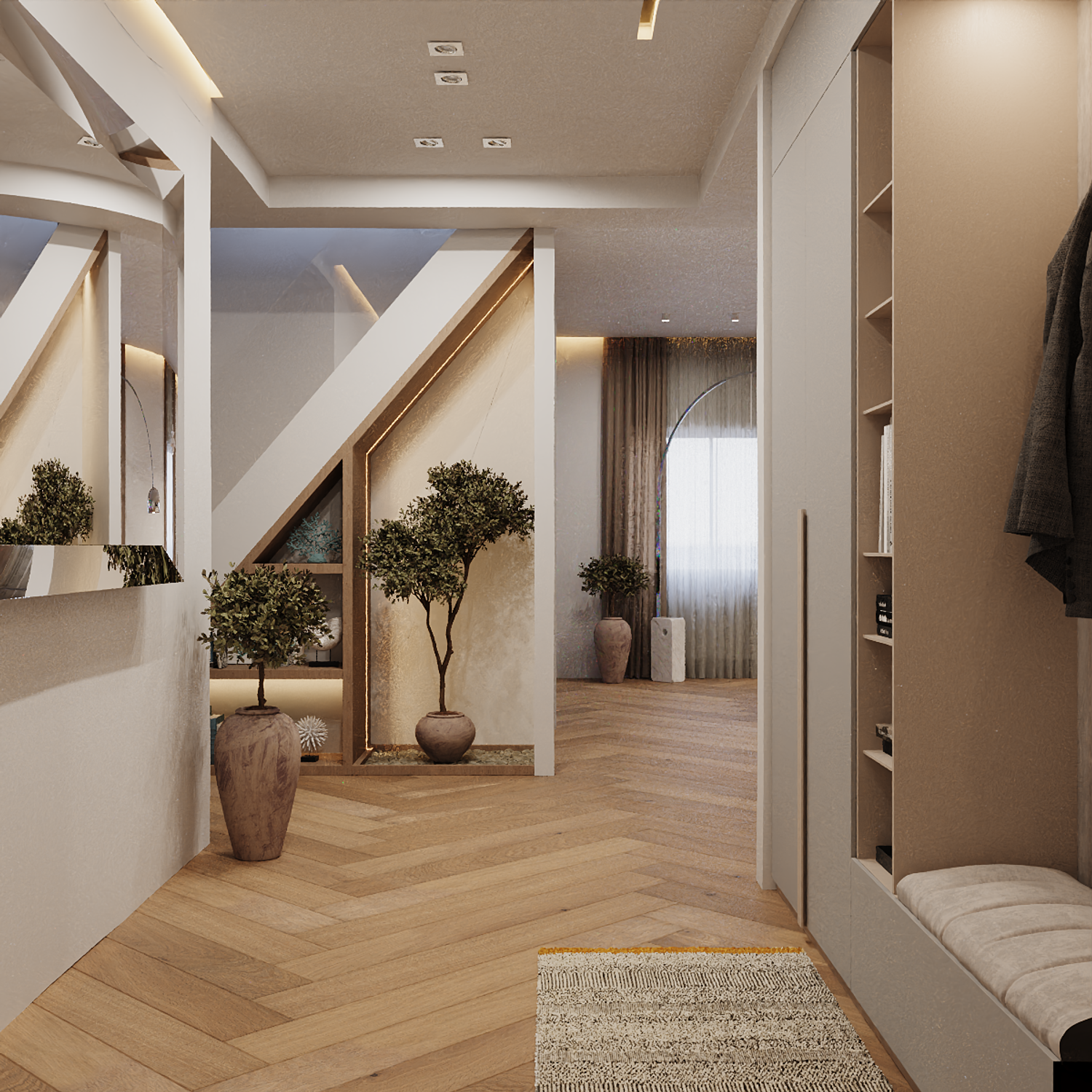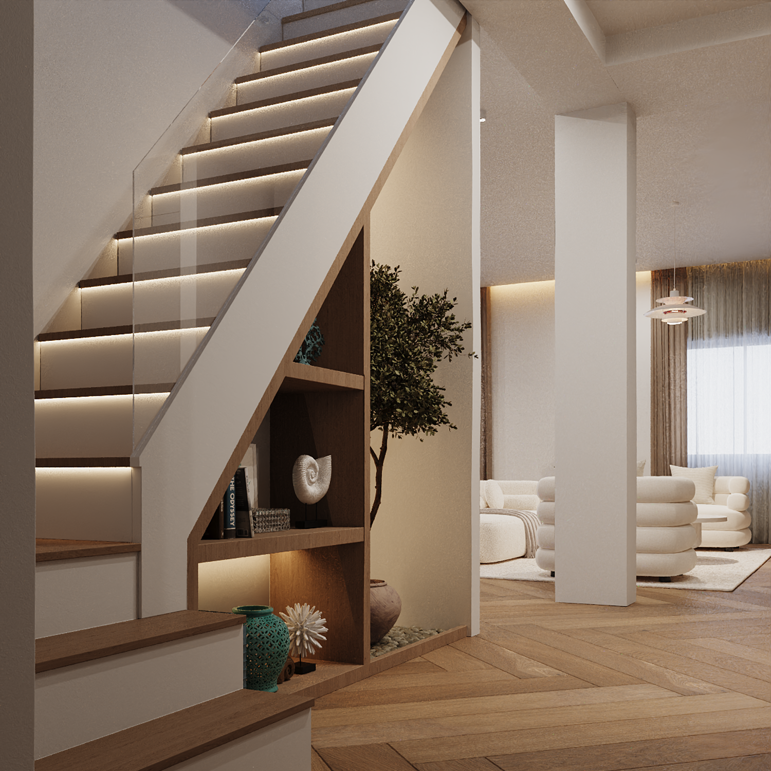 The under-stair space has been beautifully utilized, enhanced with decorative plants and curated design elements to create a visually appealing focal point.