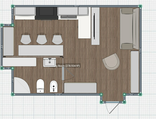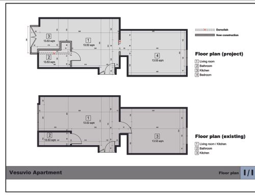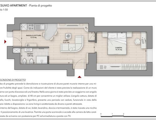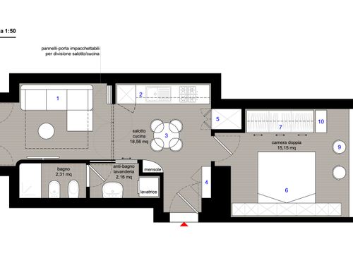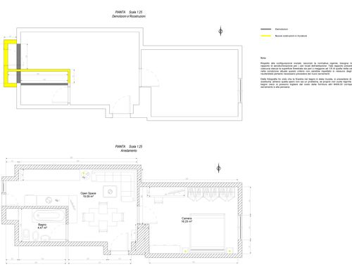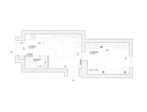The apartment is originally a garage. Refurbished to the best and made it habitable about 10 years ago. Now I would like to restructure it to live there. The main entrance is marked with the letter A. Currently there is a second input (letter B) consists of an aluminum door which will be removed. An external wall will be created with a second door and a window. Being the bathroom too tight I think to enlarge it by another 50 cm.