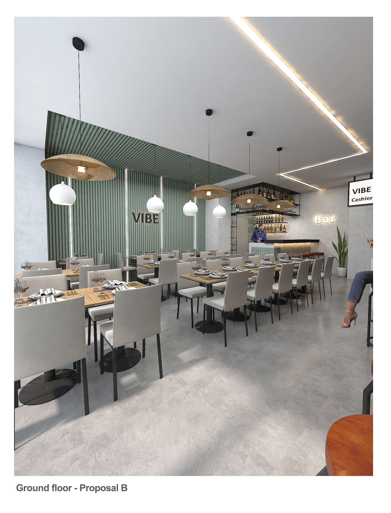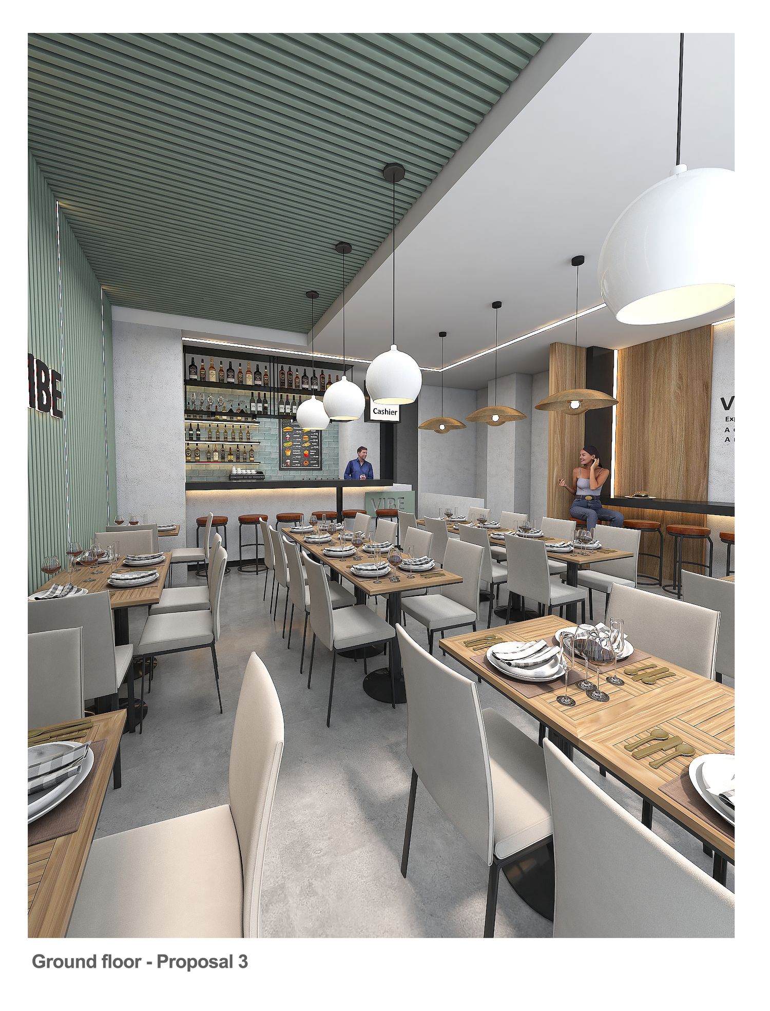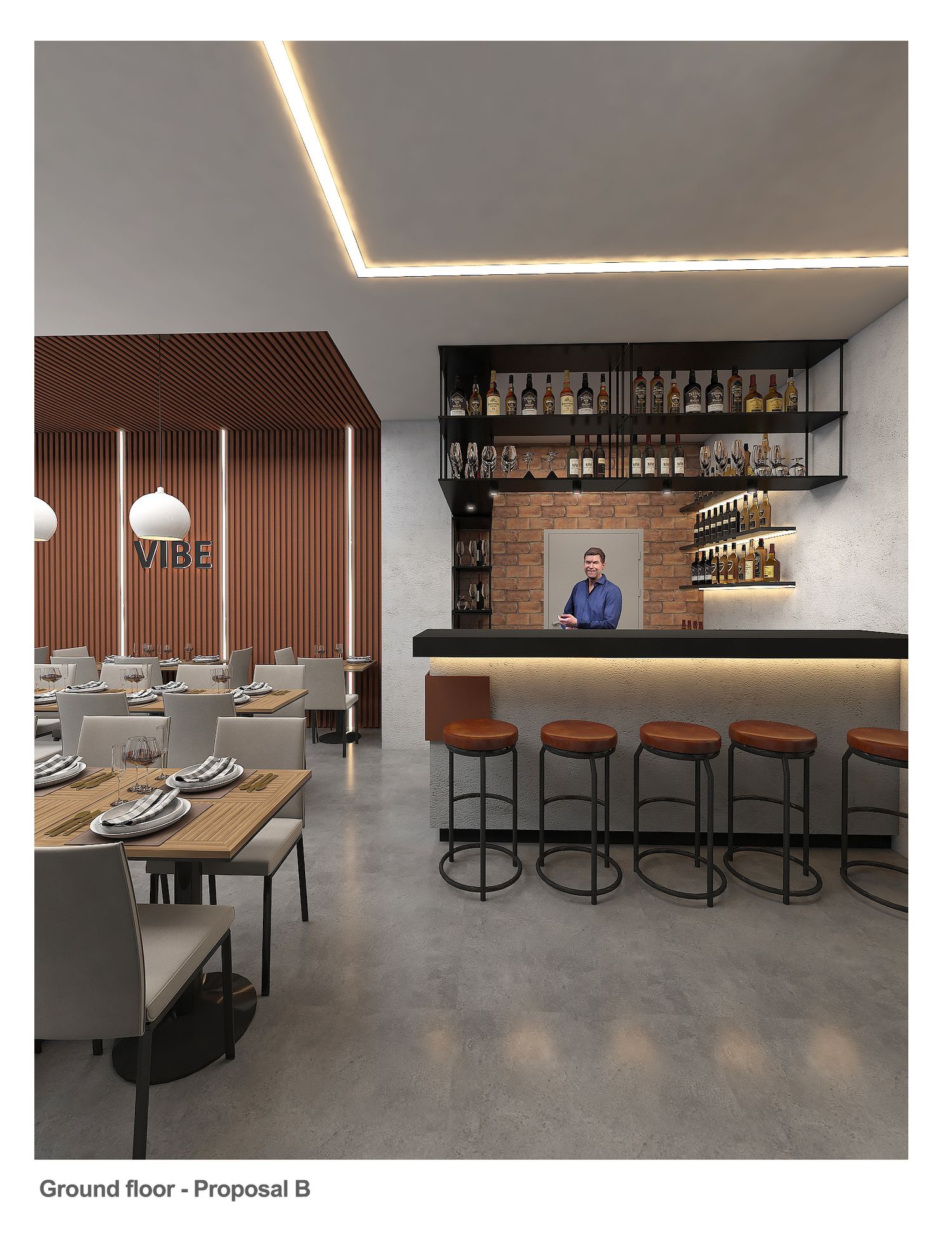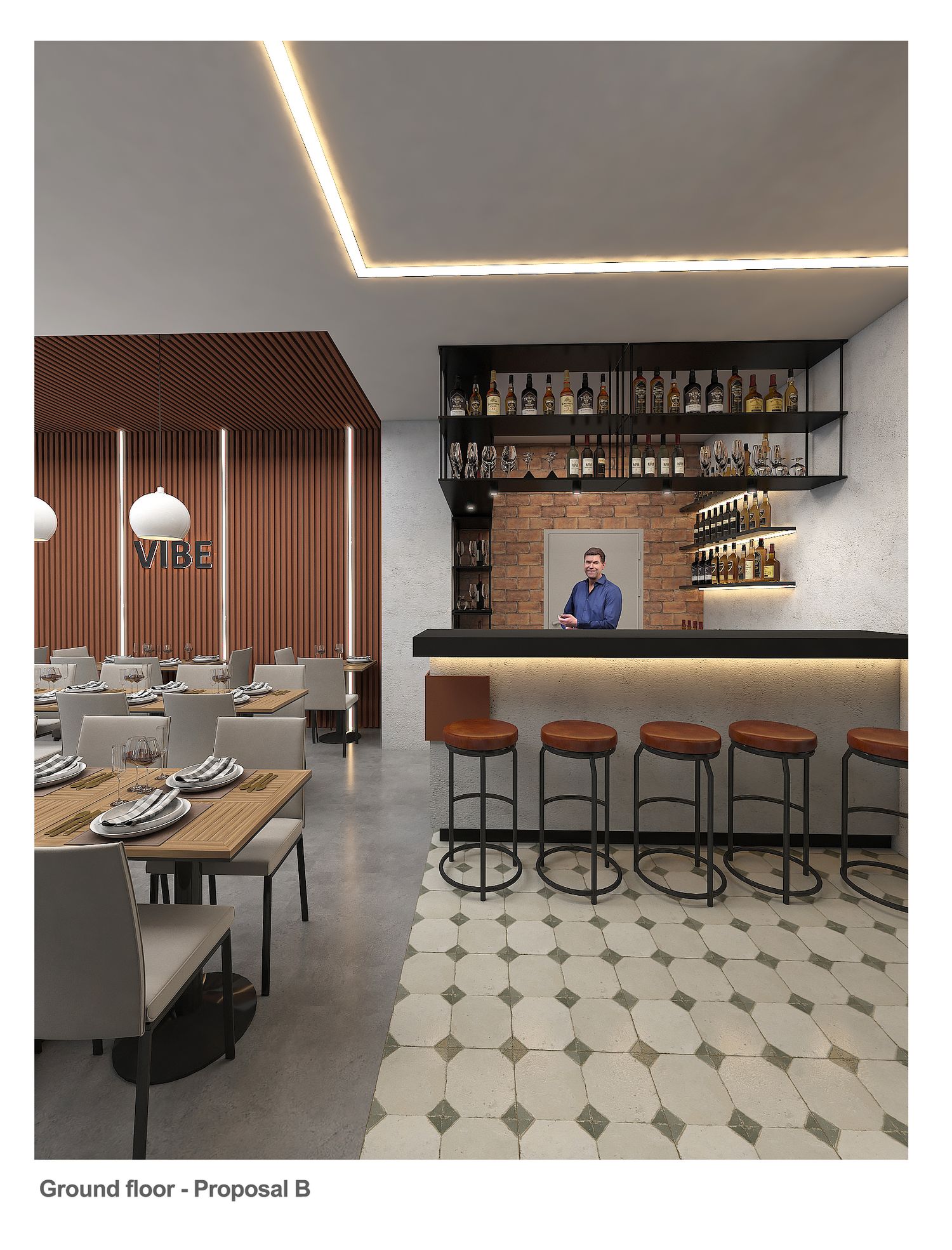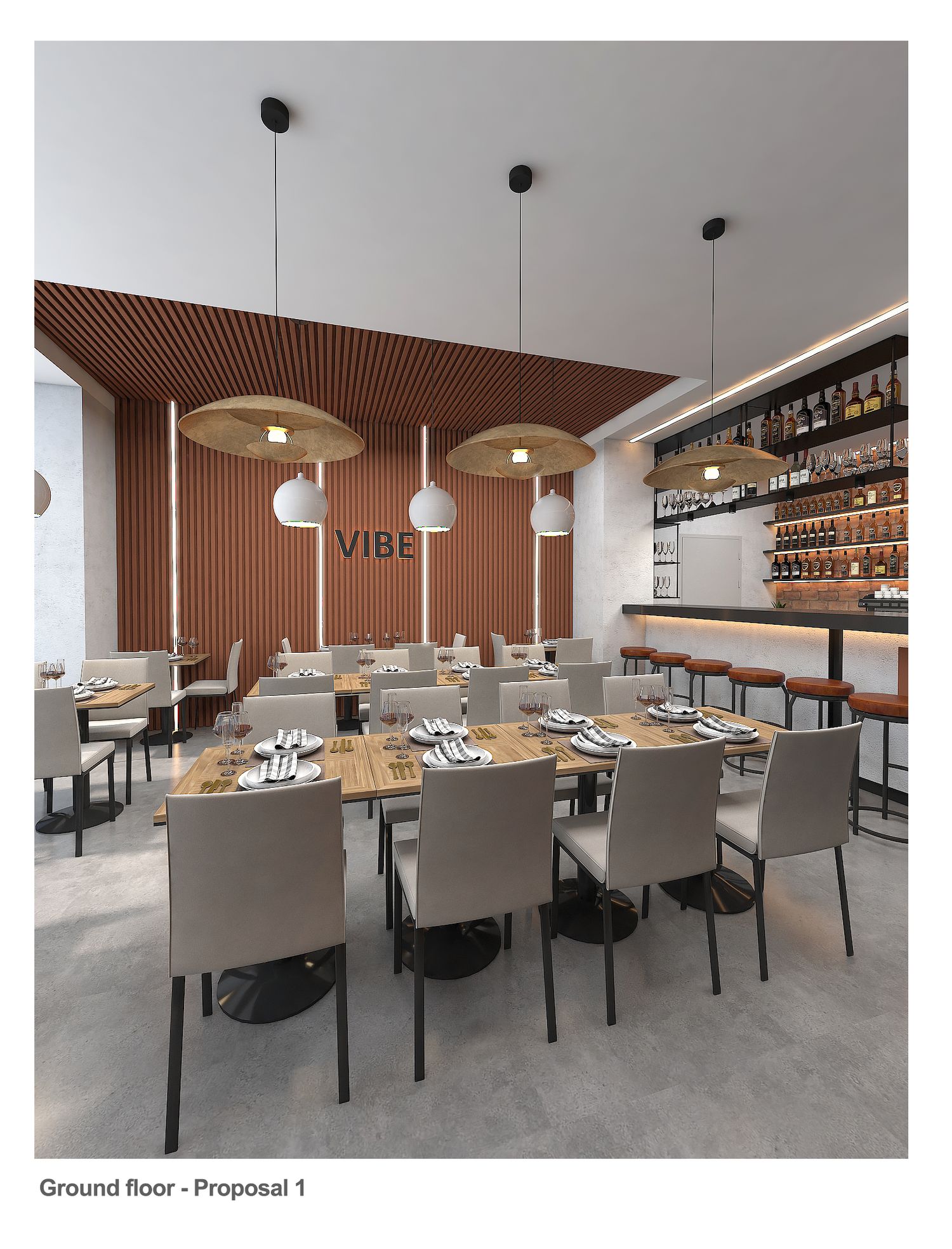 We proposed two designs for the ground floor, the difference of which is in the layout of the bar area and the number of tables in the restaurant area.