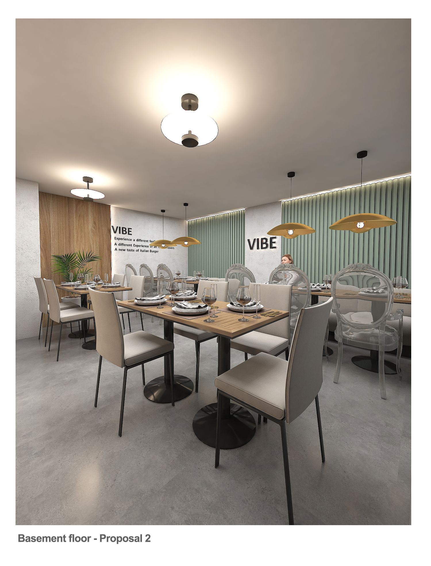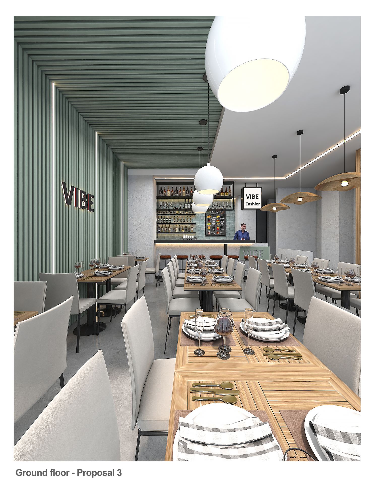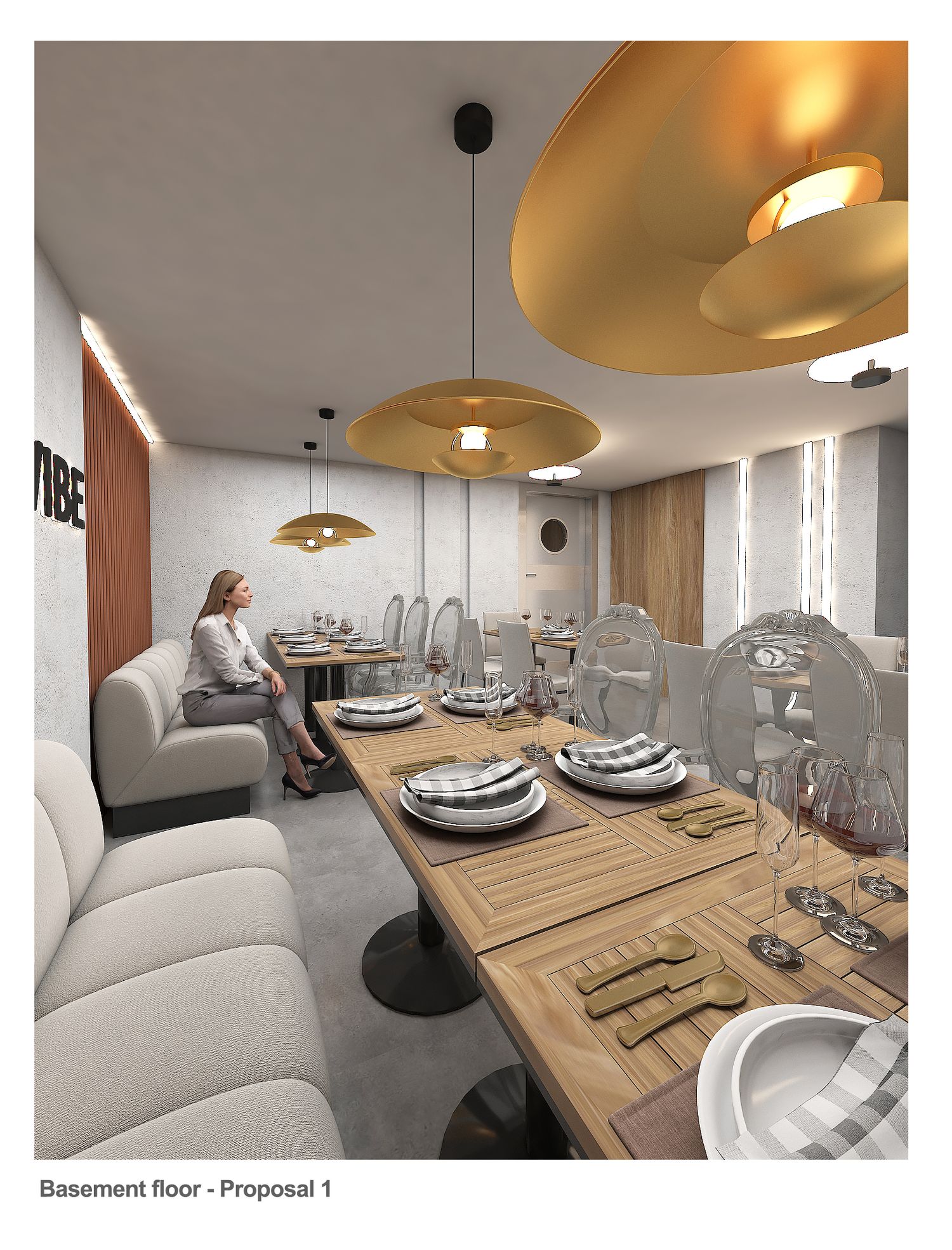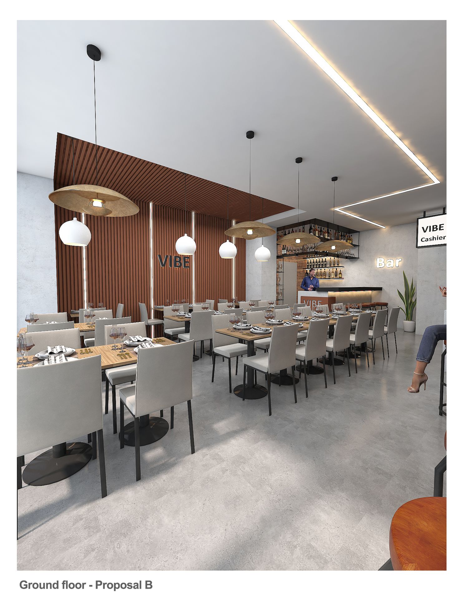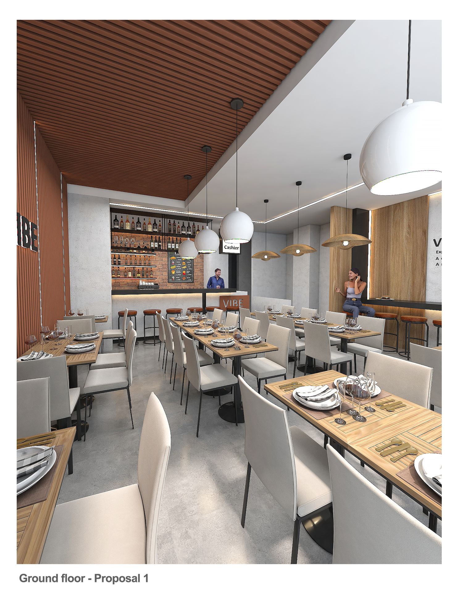 We proposed two designs for the ground floor, the difference of which is in the layout of the bar area and the number of tables in the restaurant area.