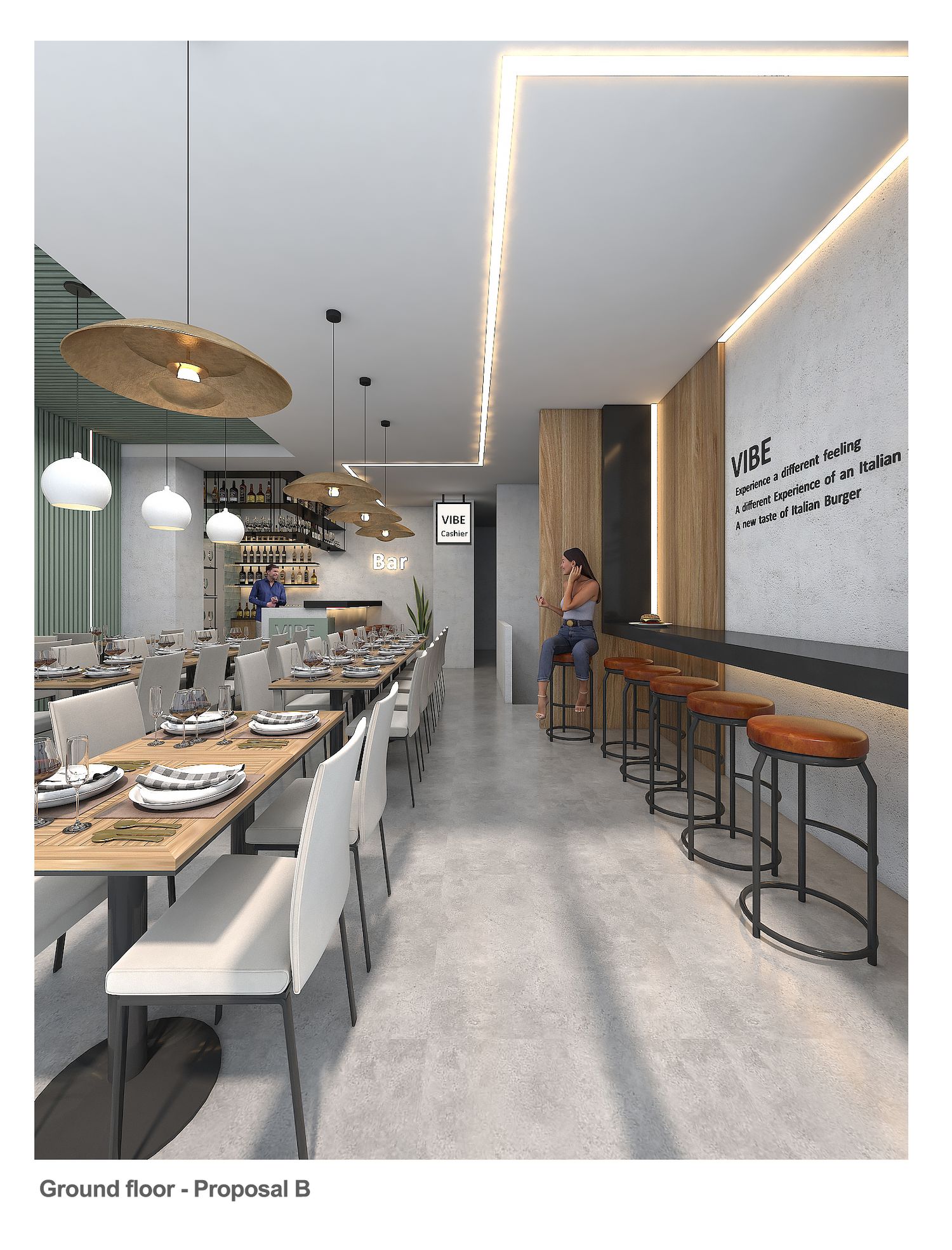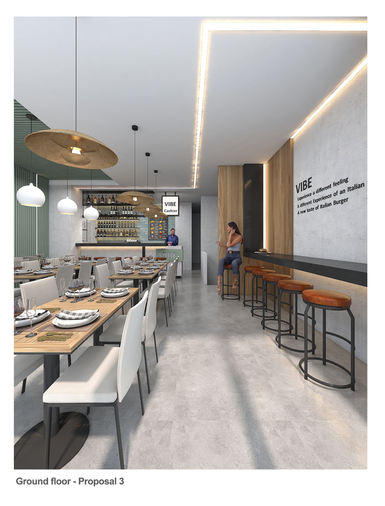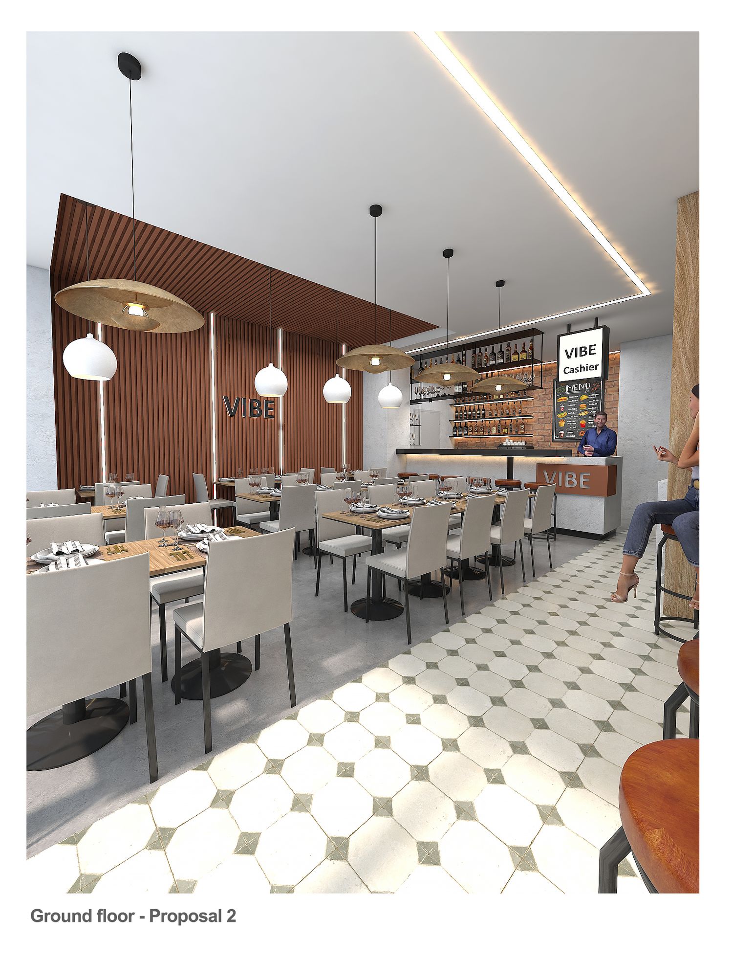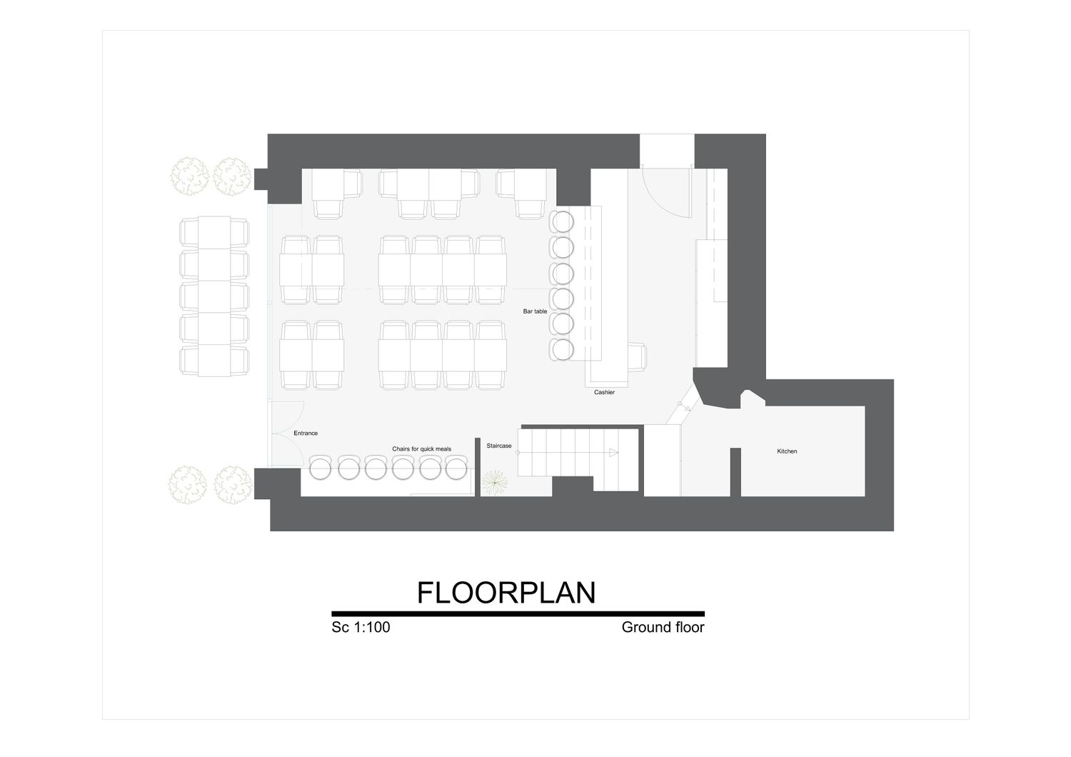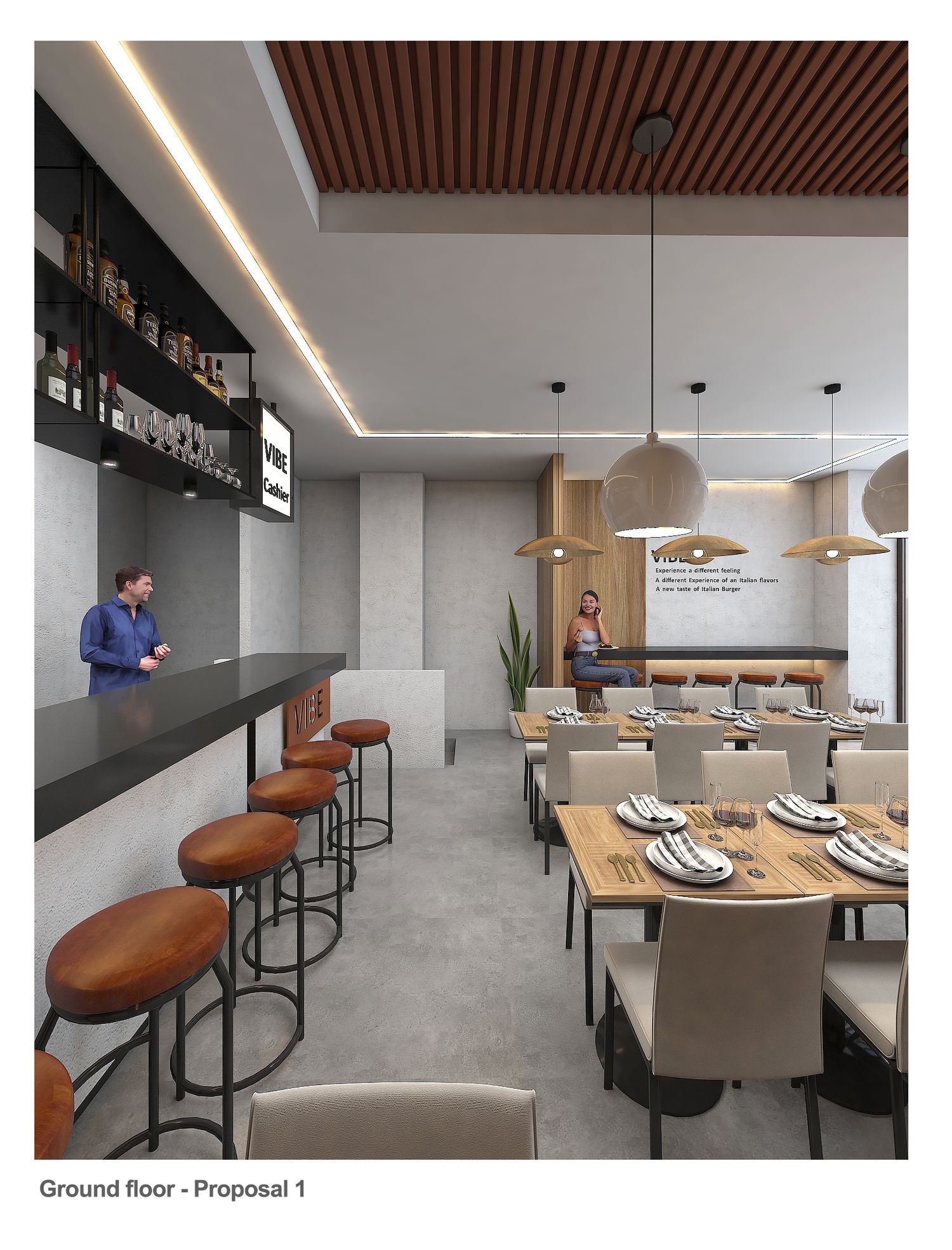 We proposed two designs for the ground floor, the difference of which is in the layout of the bar area and the number of tables in the restaurant area.