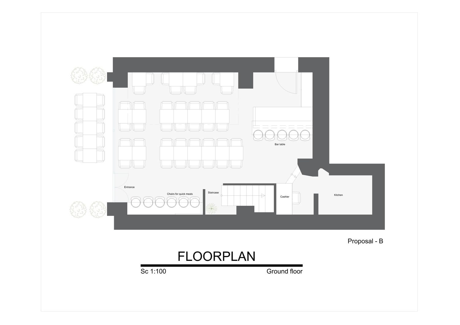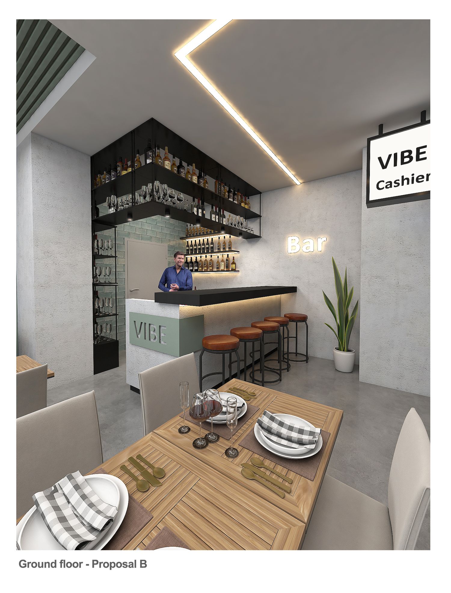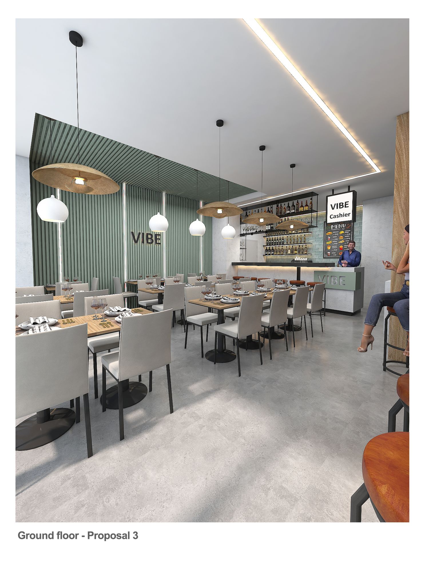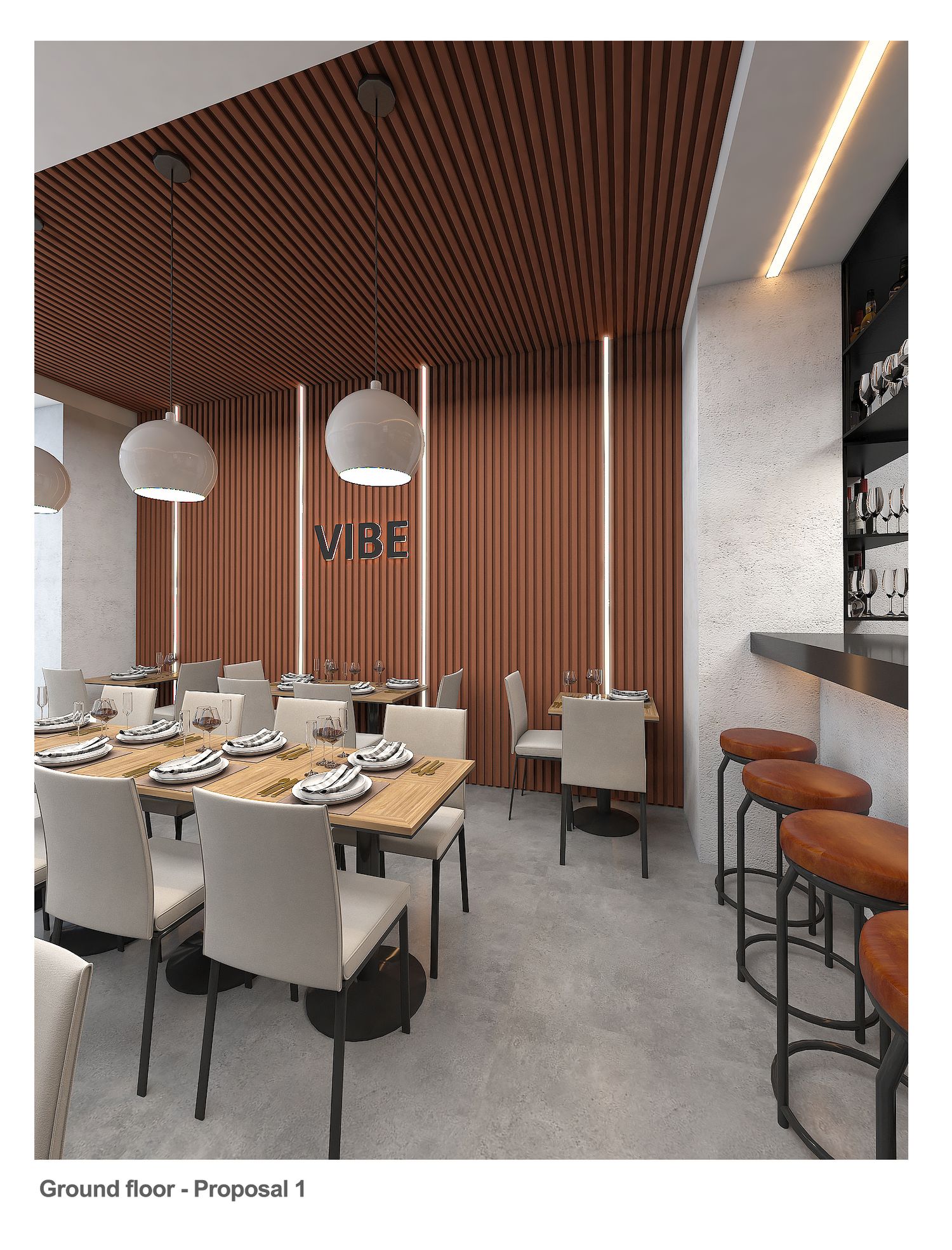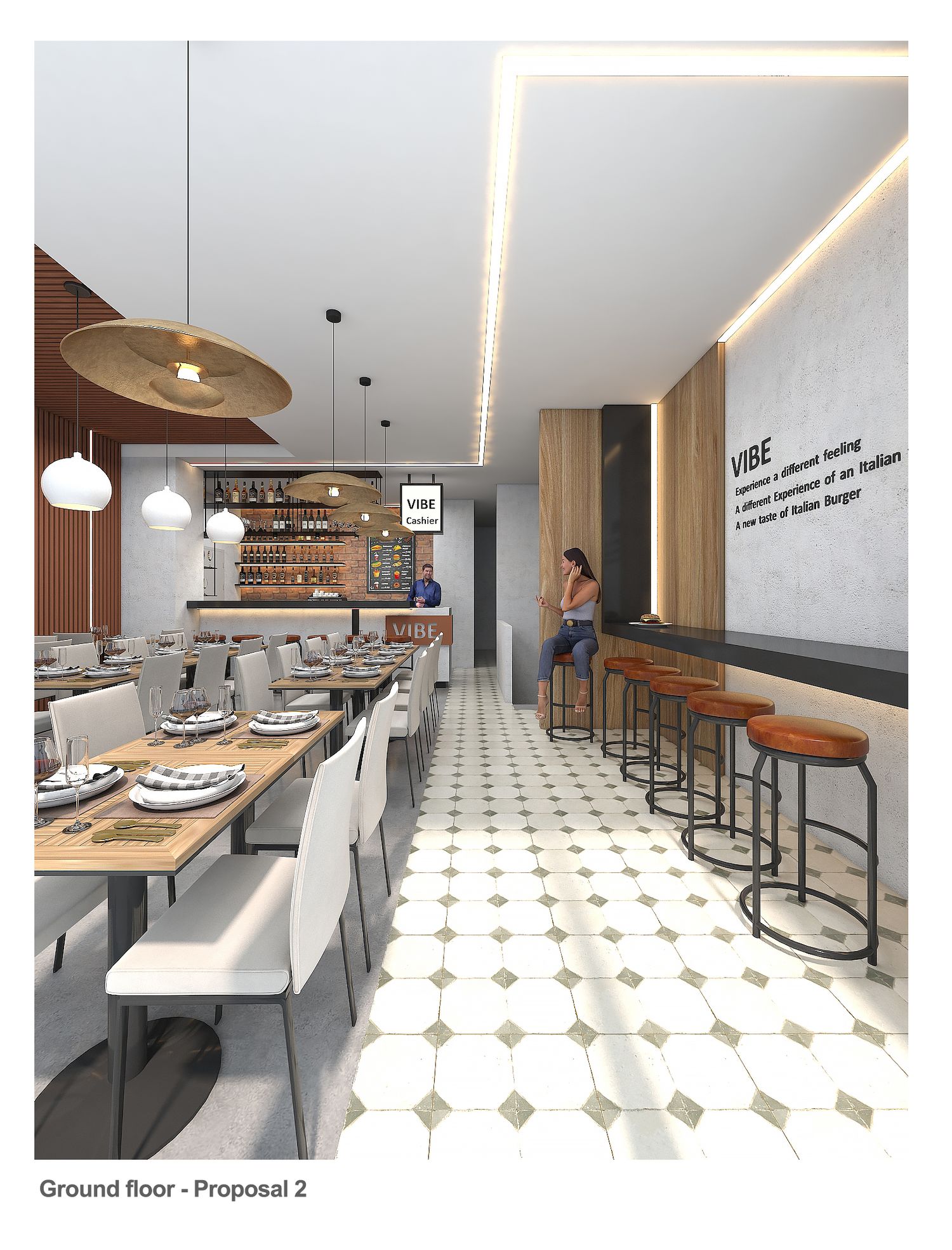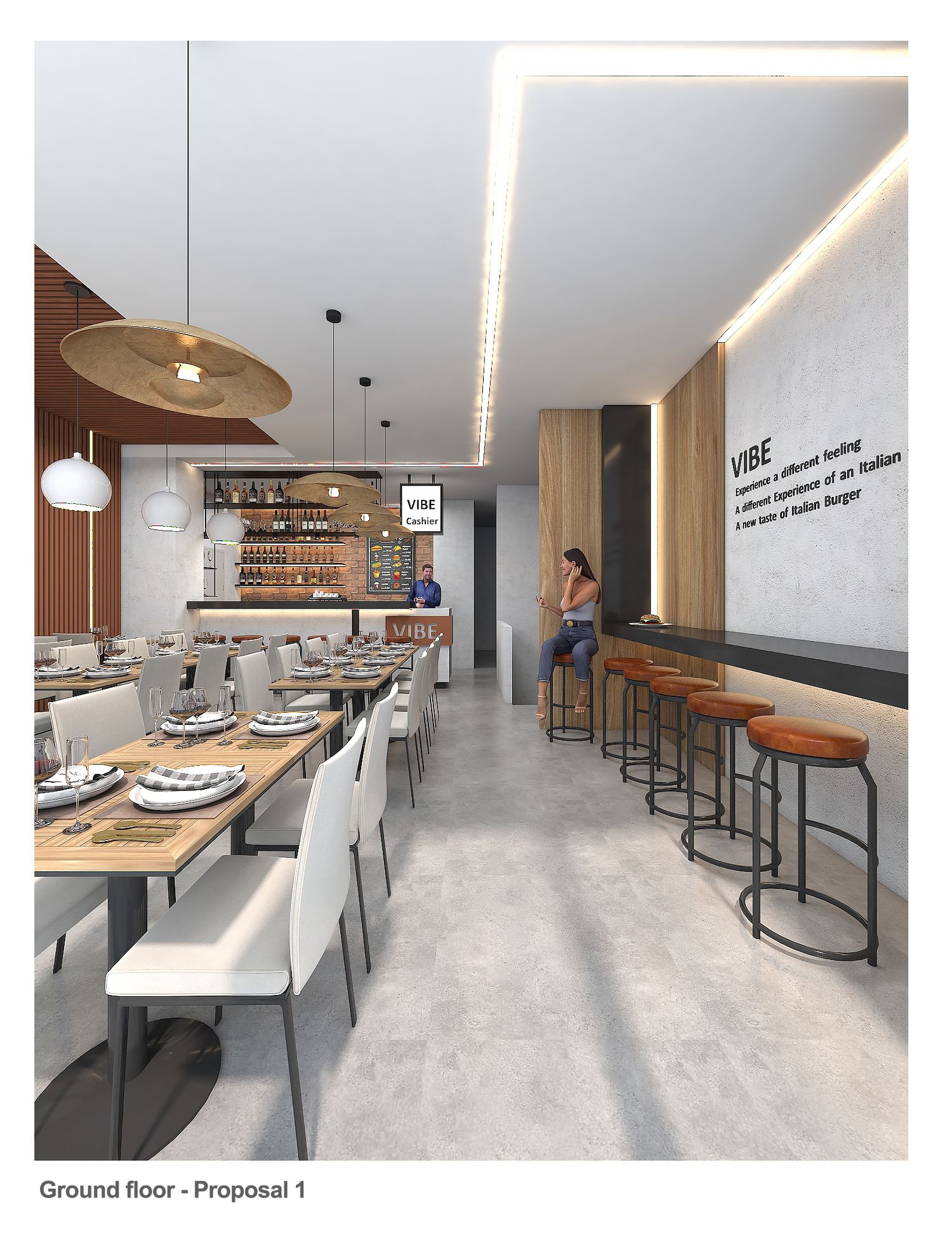 We proposed two designs for the ground floor, the difference of which is in the layout of the bar area and the number of tables in the restaurant area.