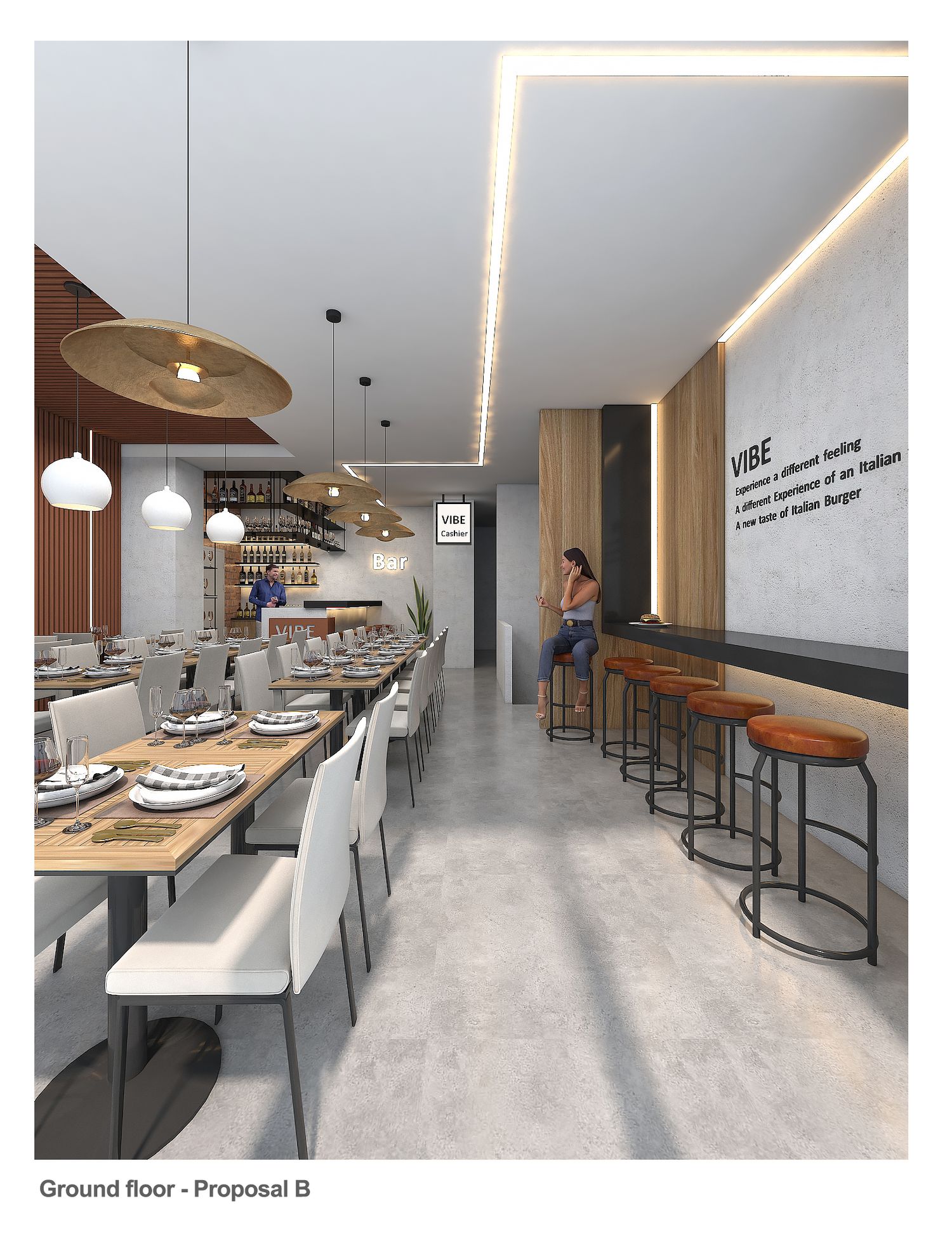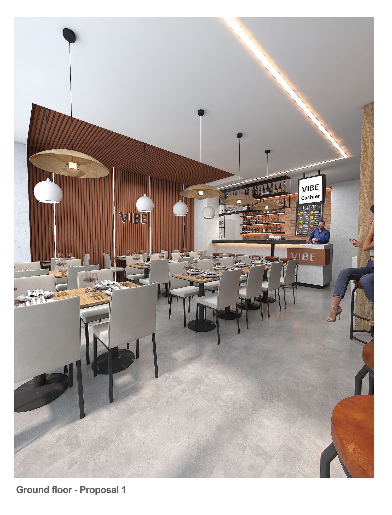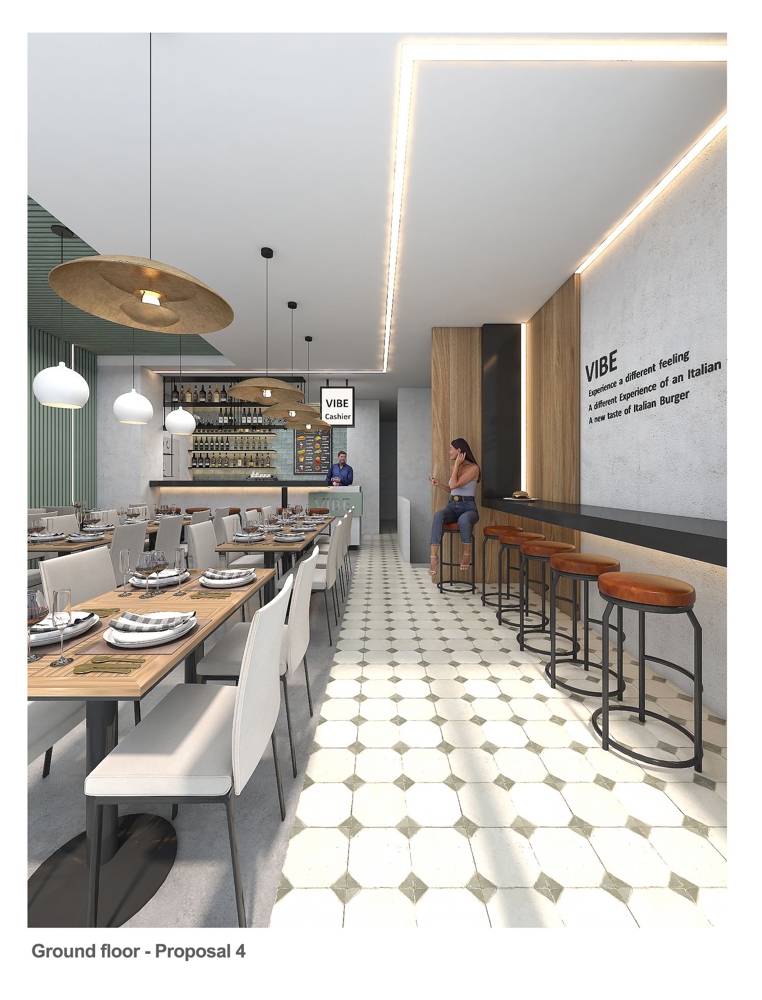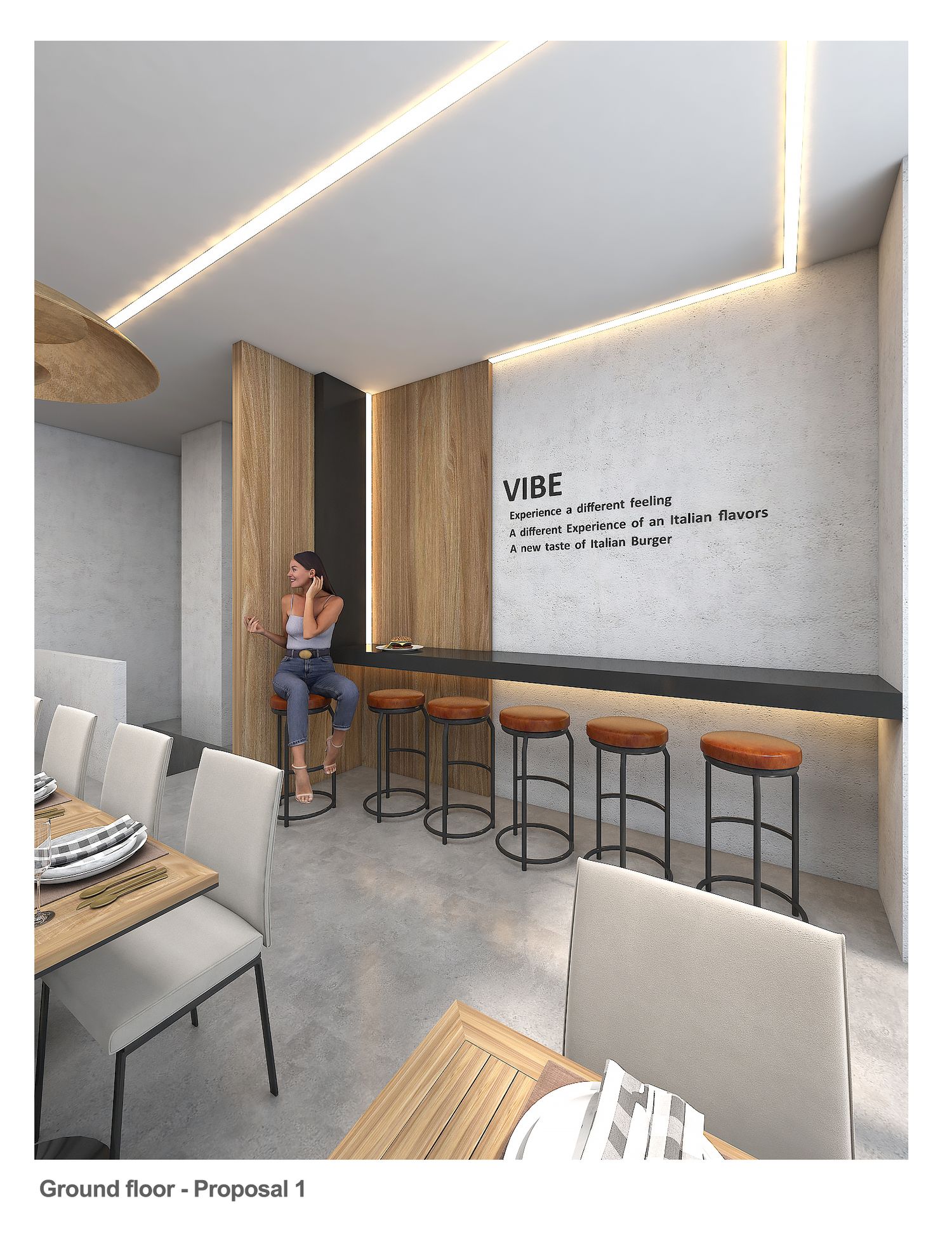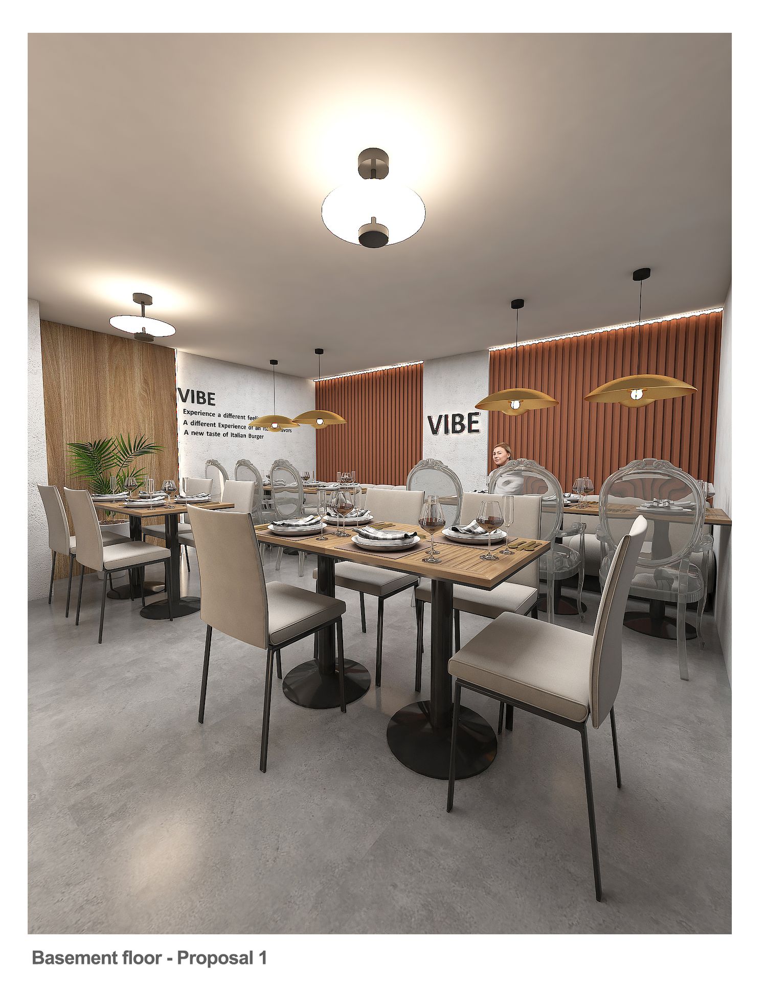 We proposed two designs for the ground floor, the difference of which is in the layout of the bar area and the number of tables in the restaurant area.