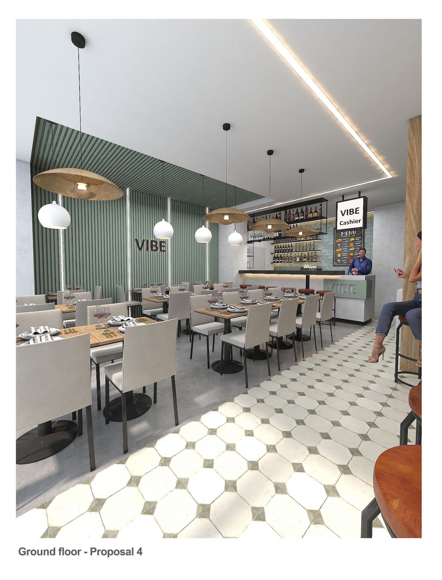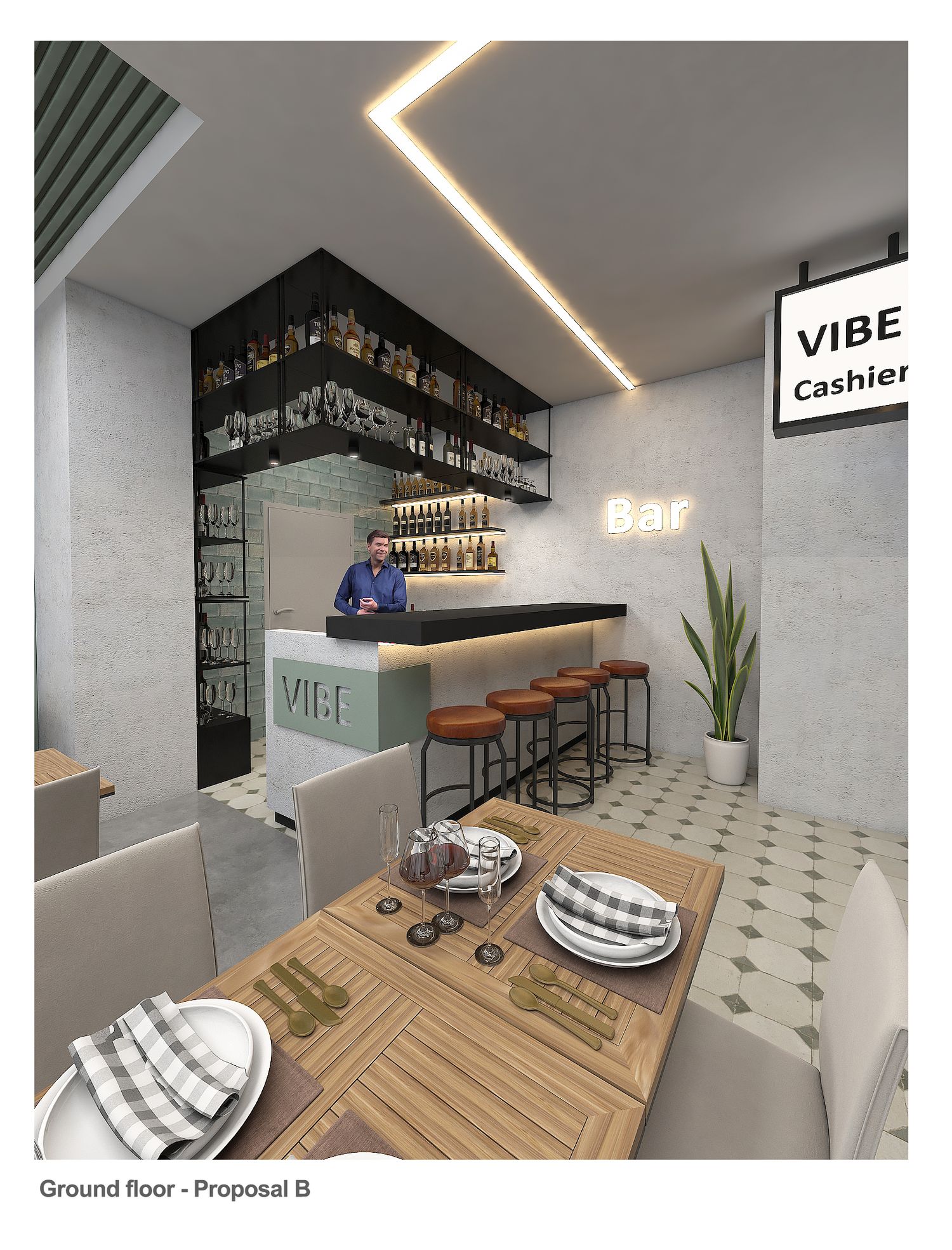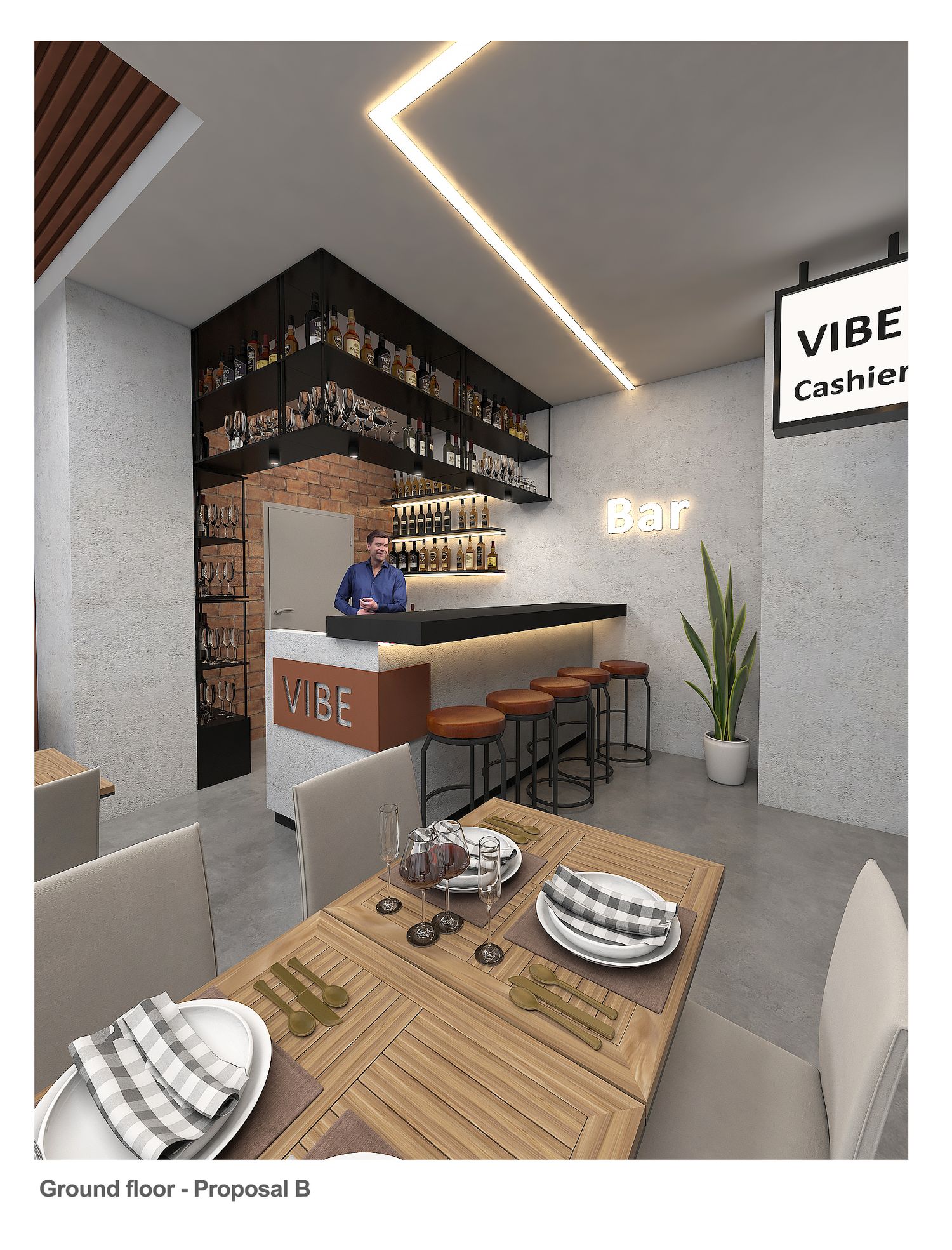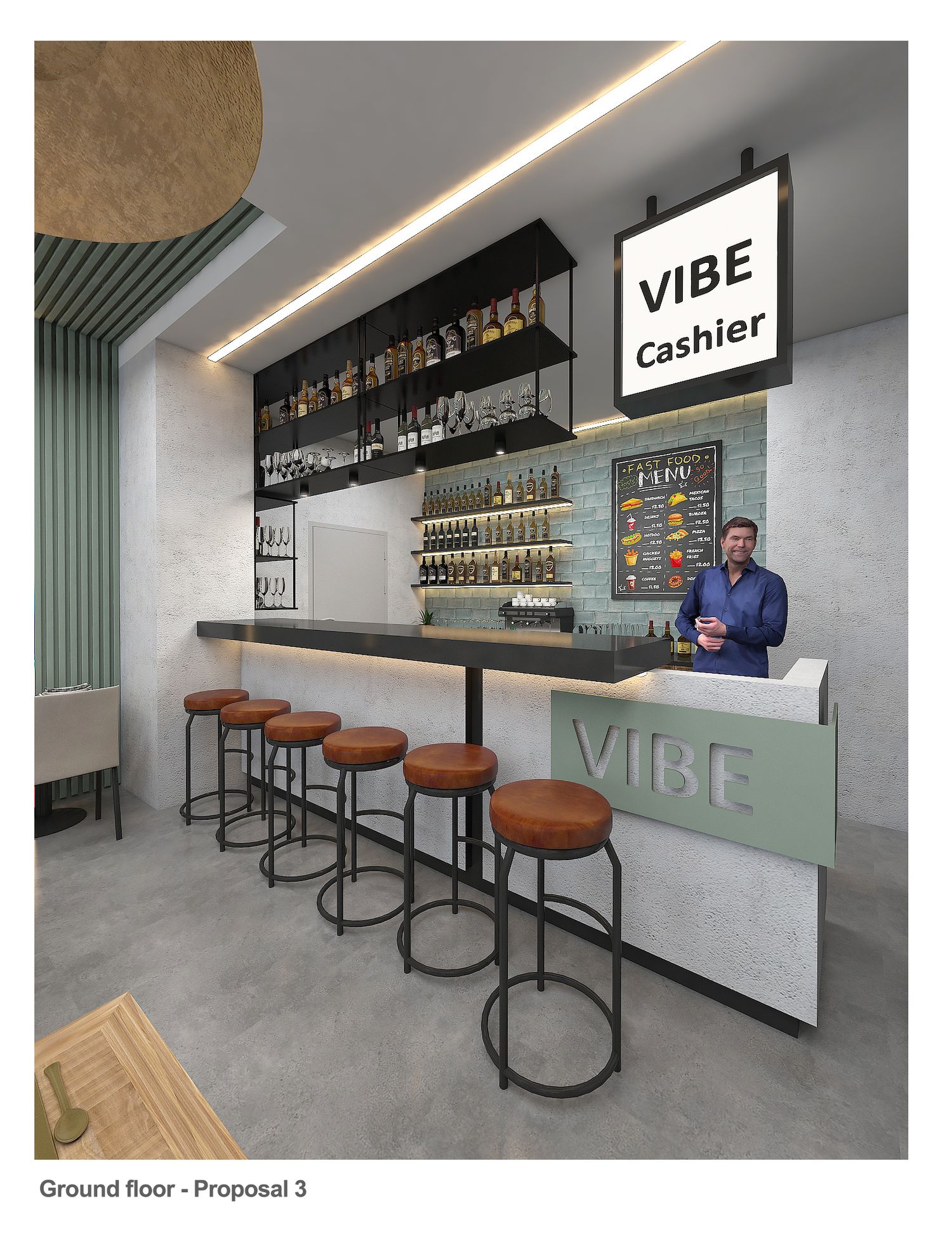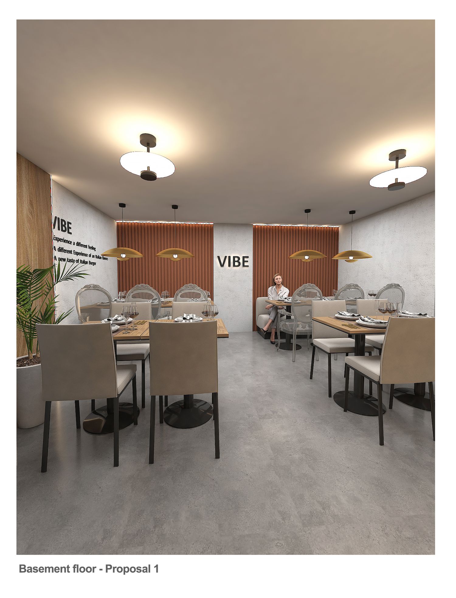 We proposed two designs for the ground floor, the difference of which is in the layout of the bar area and the number of tables in the restaurant area.