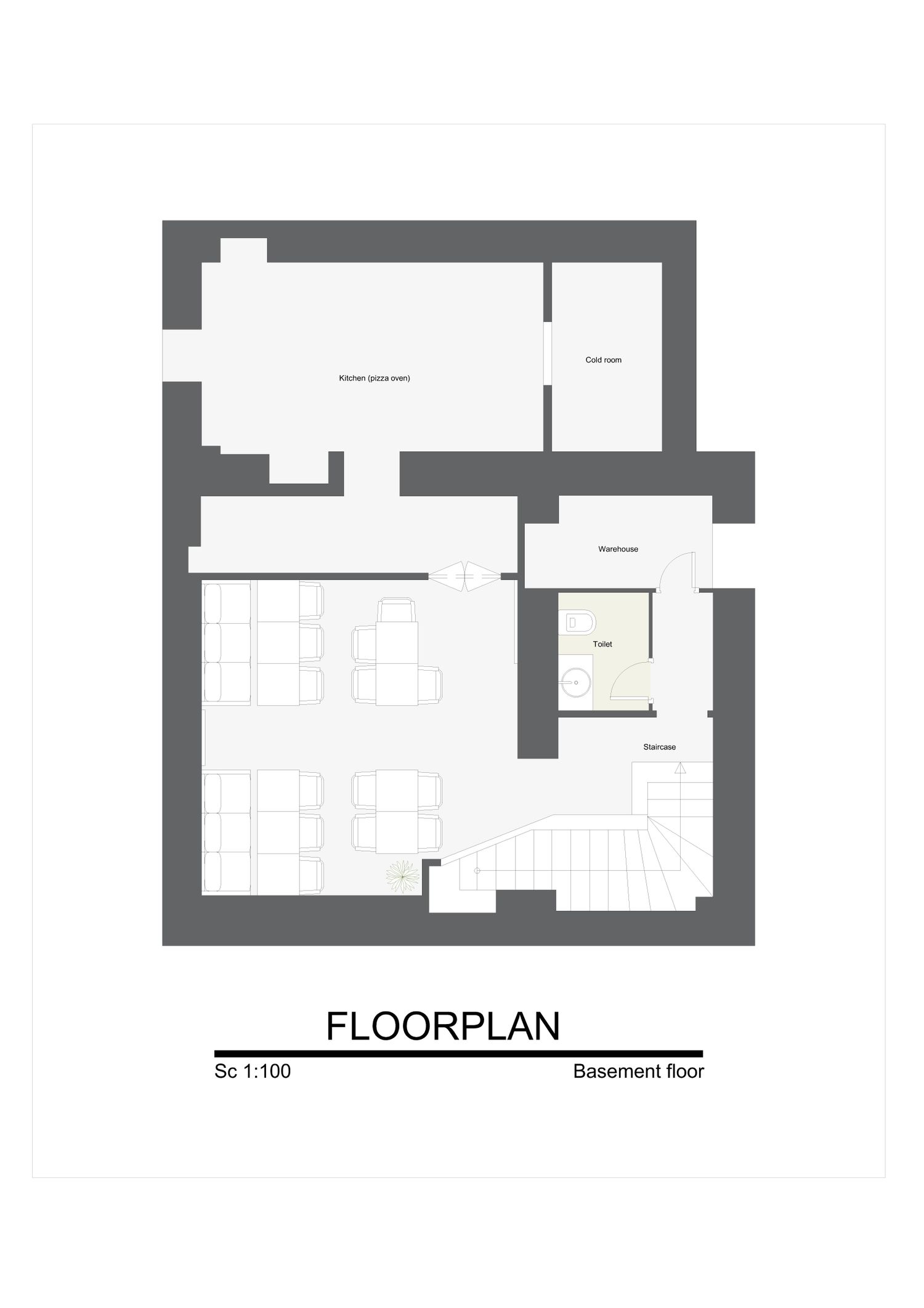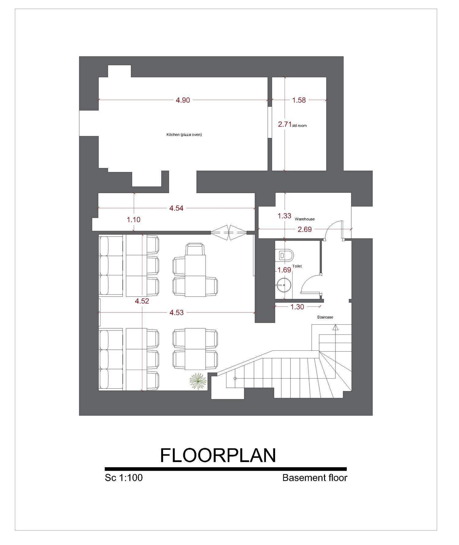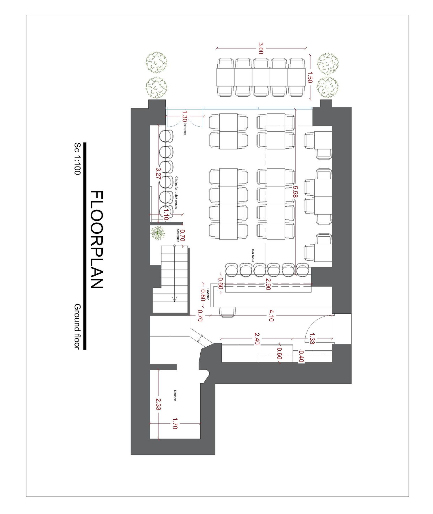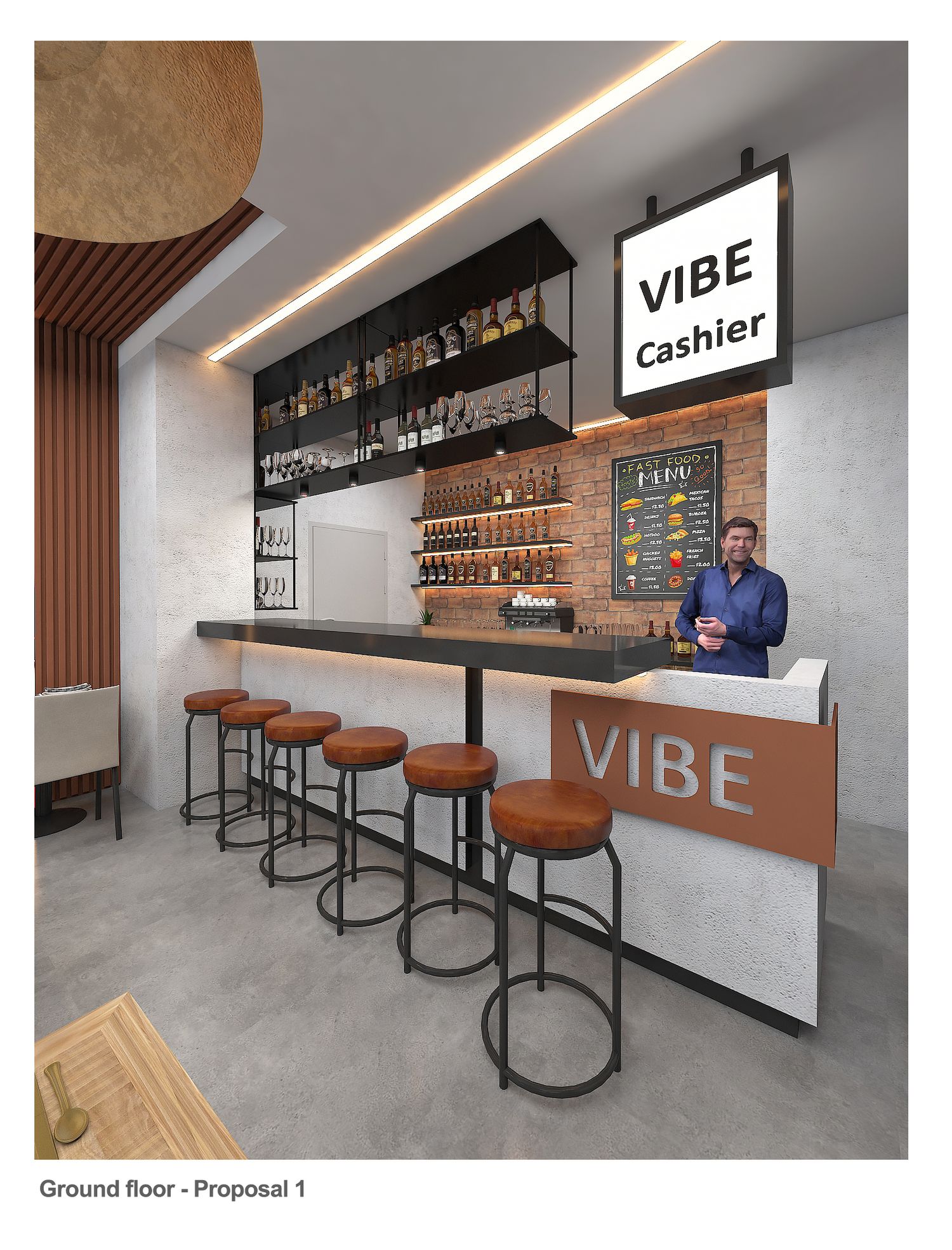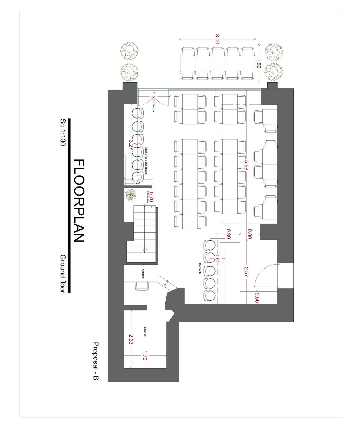 We proposed two designs for the ground floor, the difference of which is in the layout of the bar area and the number of tables in the restaurant area.