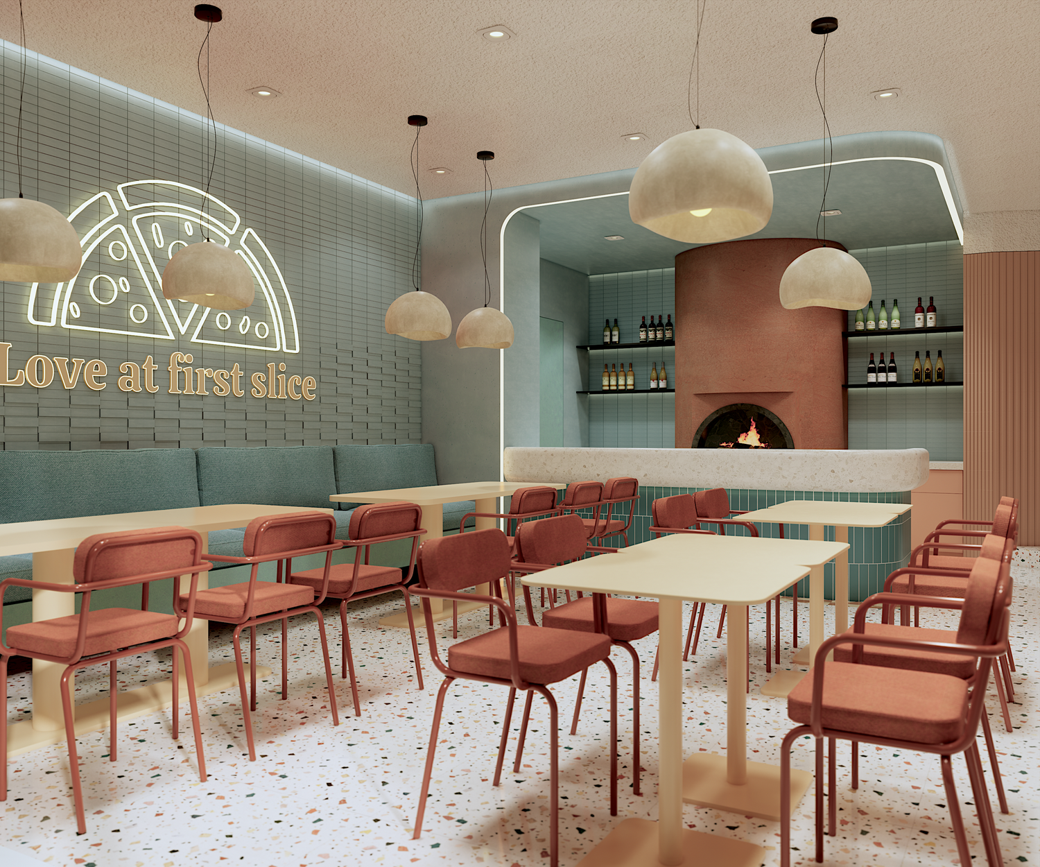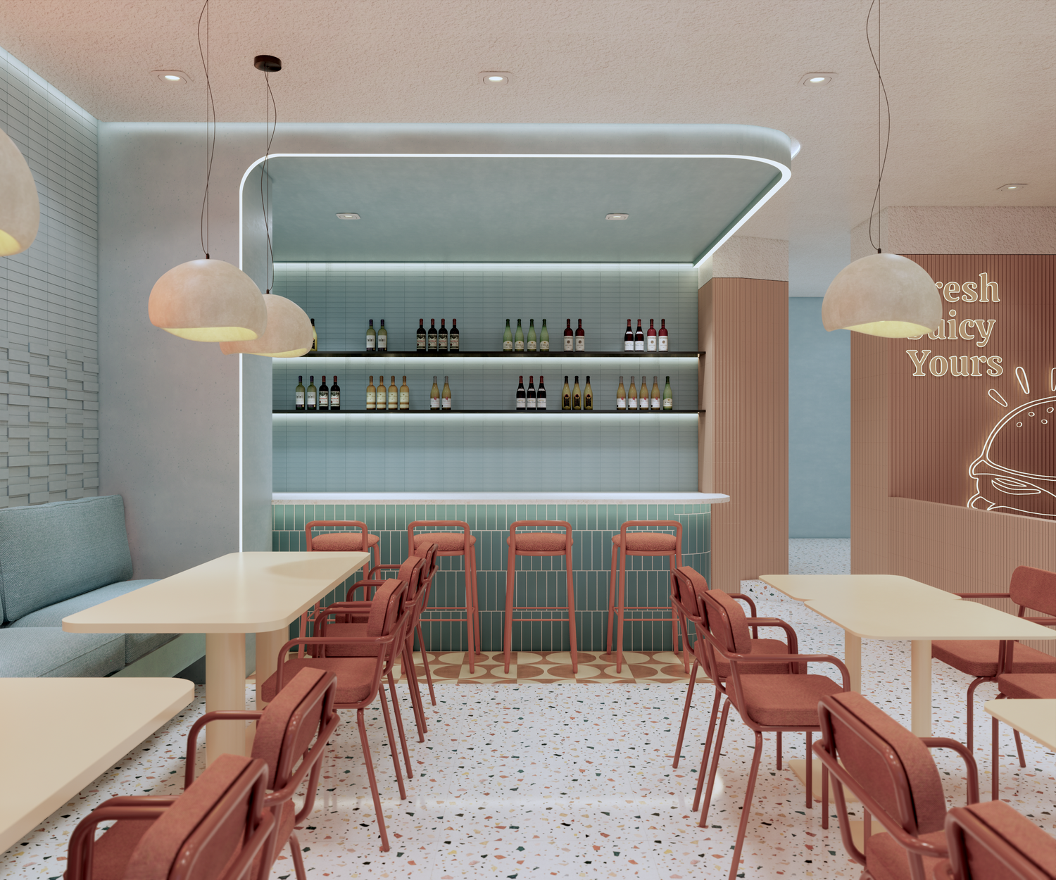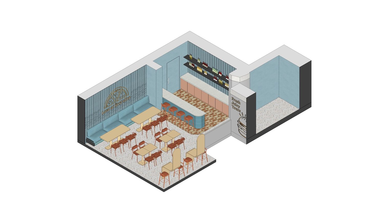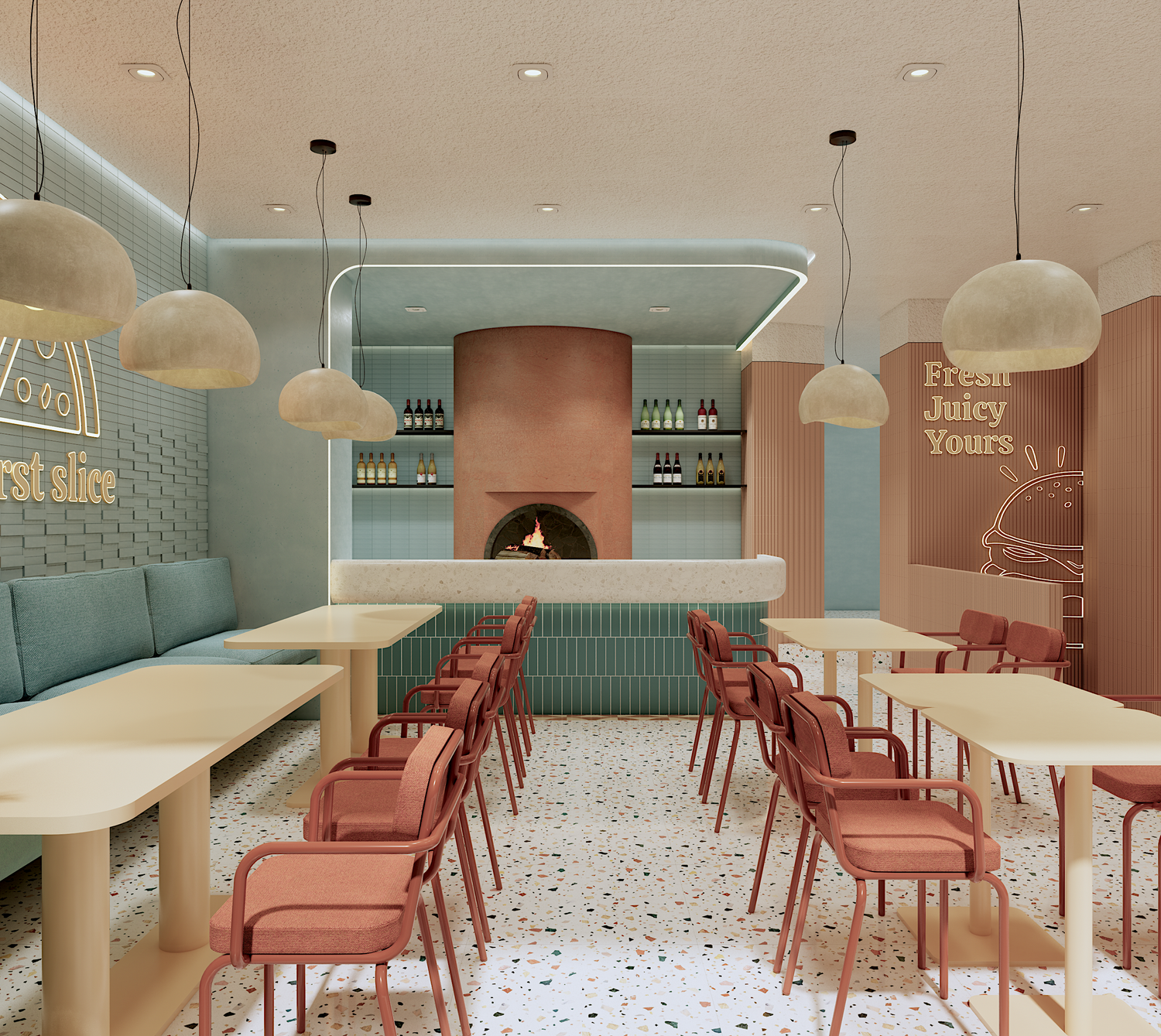 The redesign reinvents the restaurant into a modern, vibrant, and Instagrammable space that fuses Italian tradition with street food energy. Highlighting the signature Italian burger, the design features sleek finishes, dynamic seating, and a bold decorative element as a visual anchor, creating a fresh, distinctive identity that appeals to a young audience.