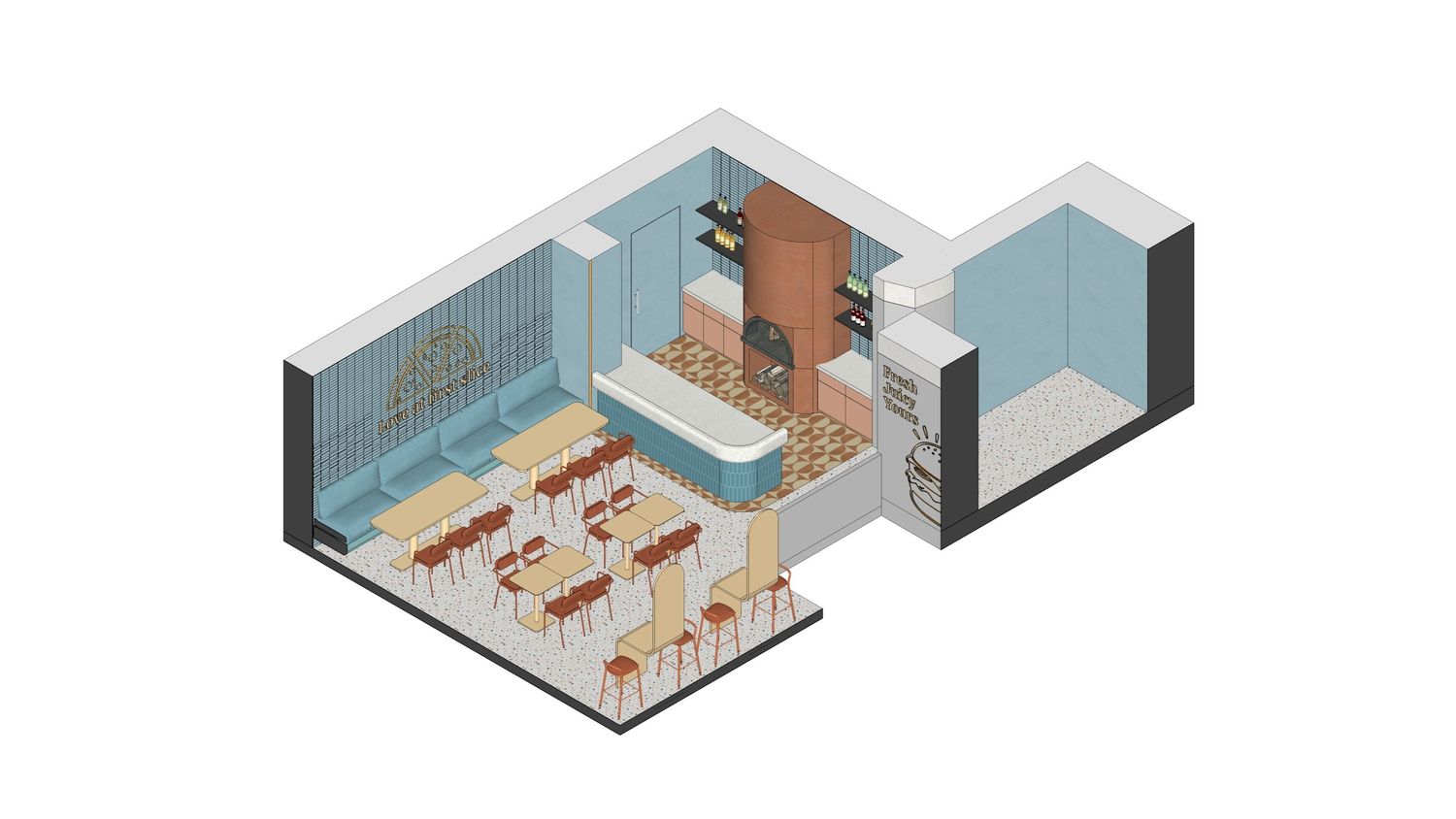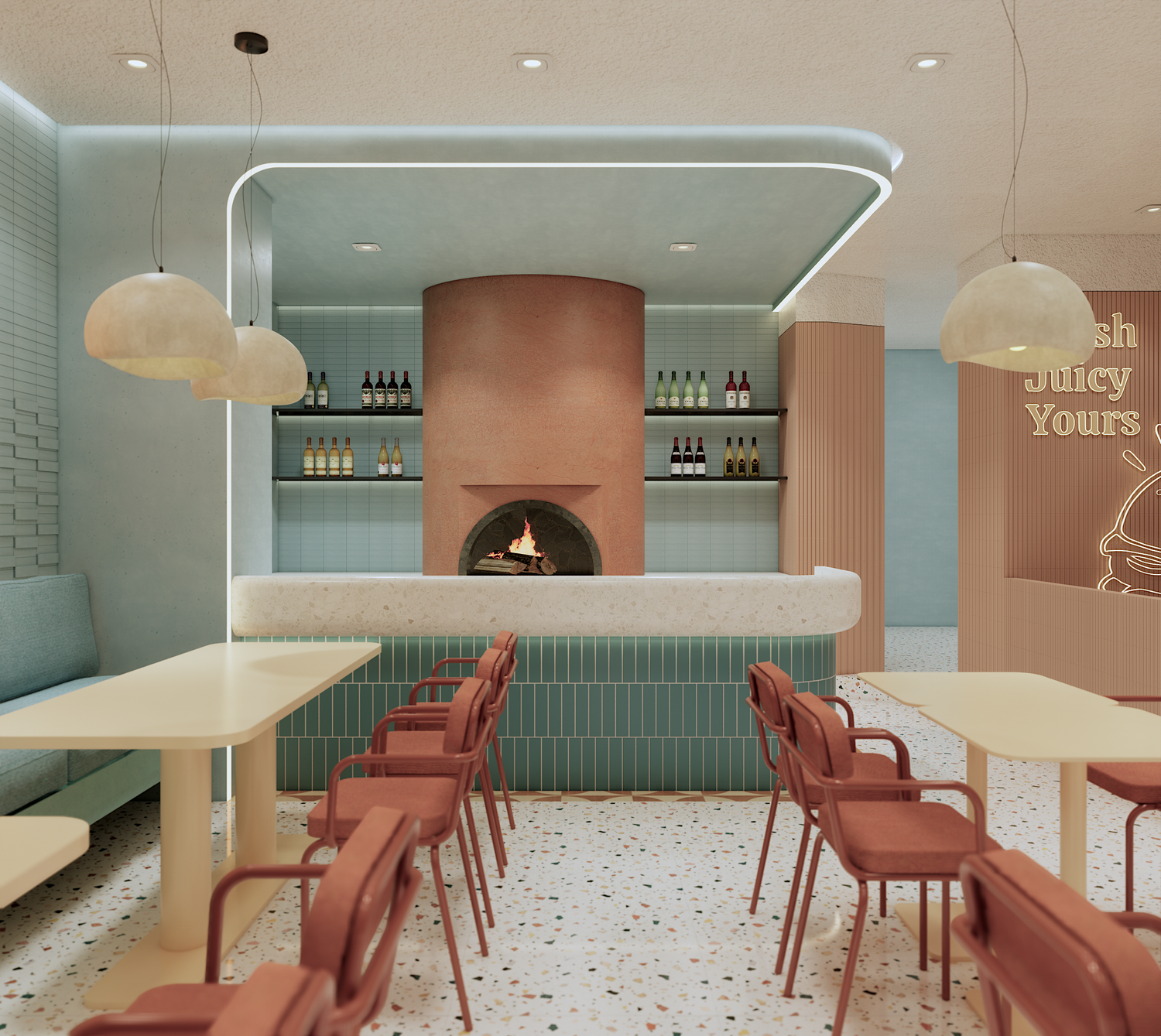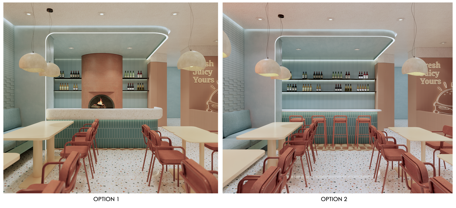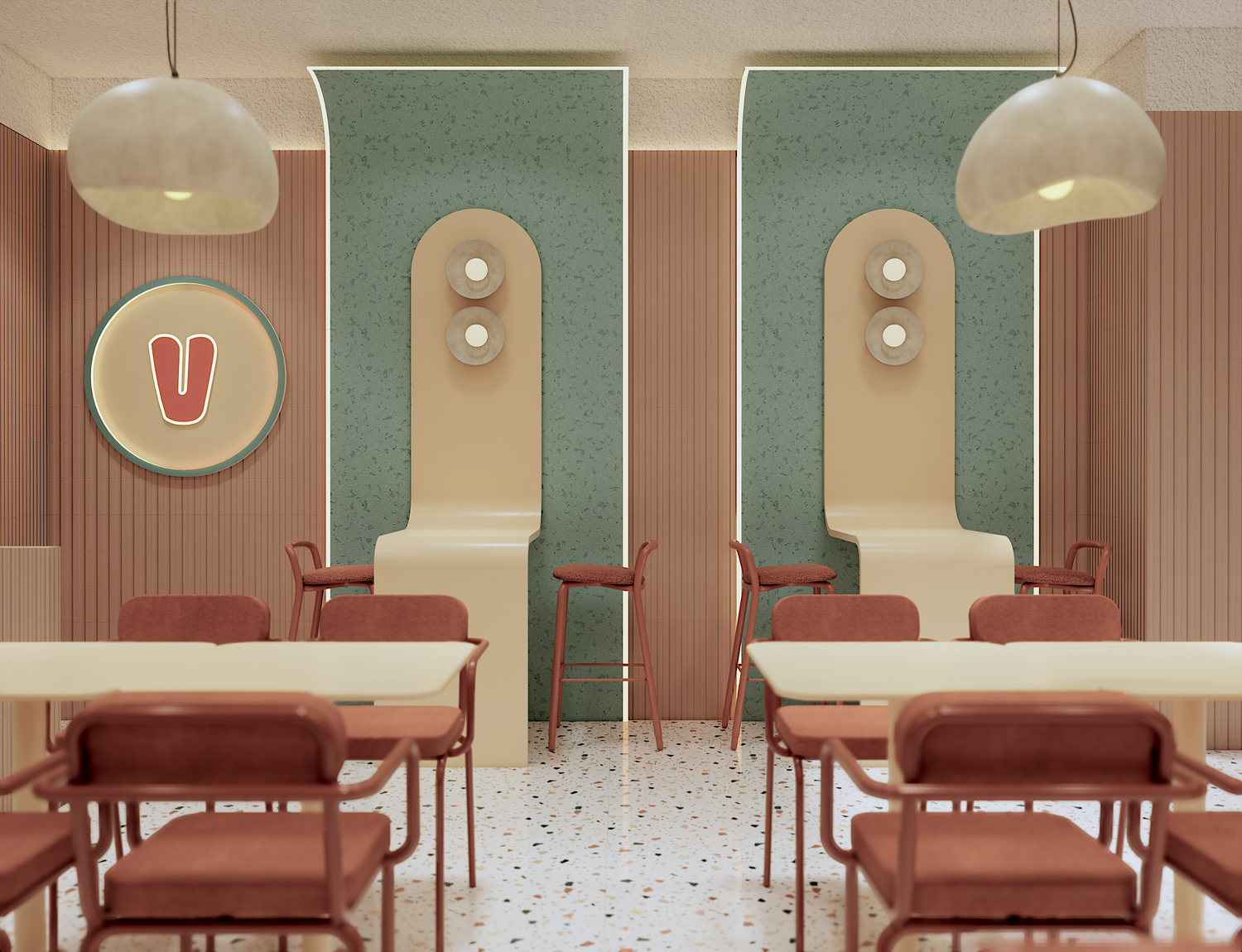 The redesign reinvents the restaurant into a modern, vibrant, and Instagrammable space that fuses Italian tradition with street food energy. Highlighting the signature Italian burger, the design features sleek finishes, dynamic seating, and a bold decorative element as a visual anchor, creating a fresh, distinctive identity that appeals to a young audience.