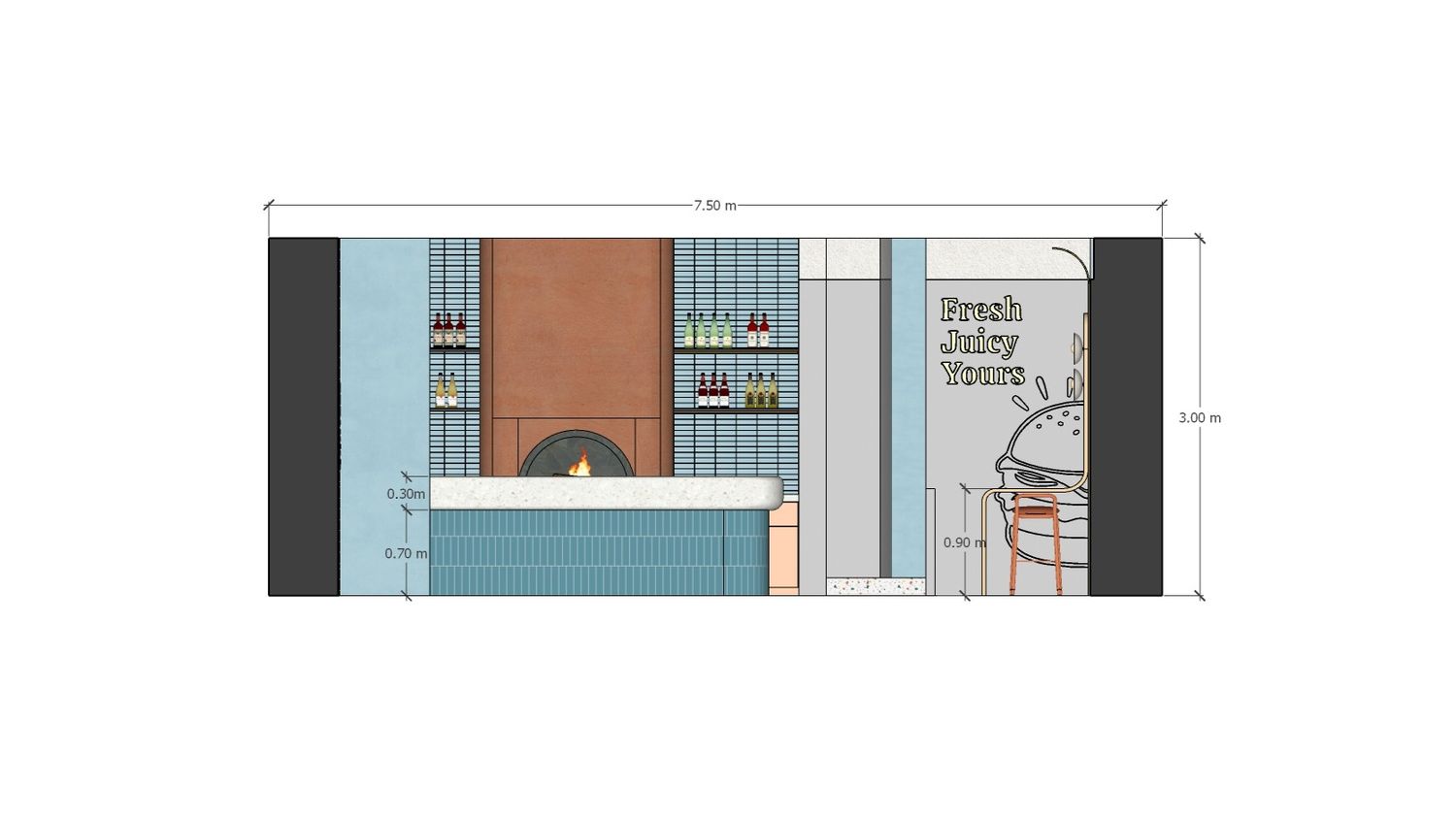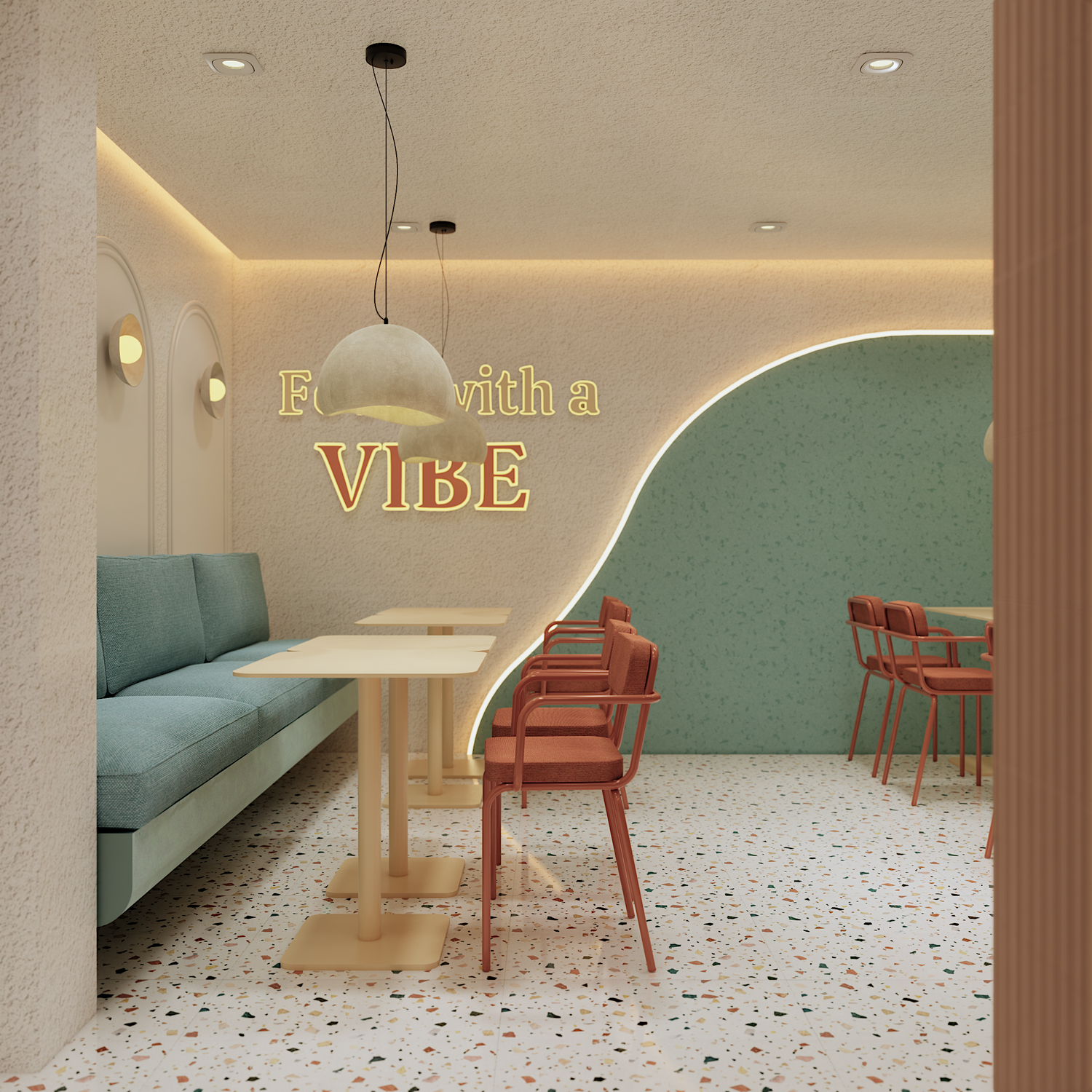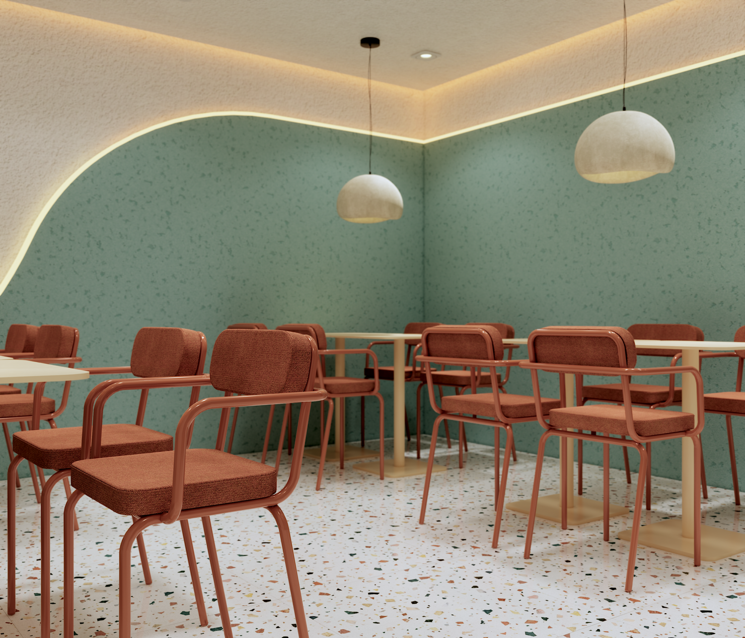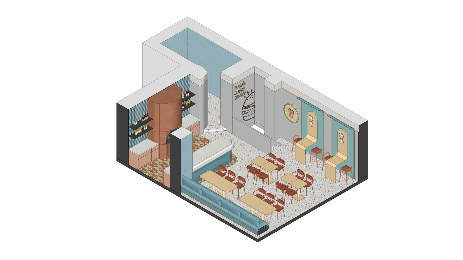 The redesign reinvents the restaurant into a modern, vibrant, and Instagrammable space that fuses Italian tradition with street food energy. Highlighting the signature Italian burger, the design features sleek finishes, dynamic seating, and a bold decorative element as a visual anchor, creating a fresh, distinctive identity that appeals to a young audience.