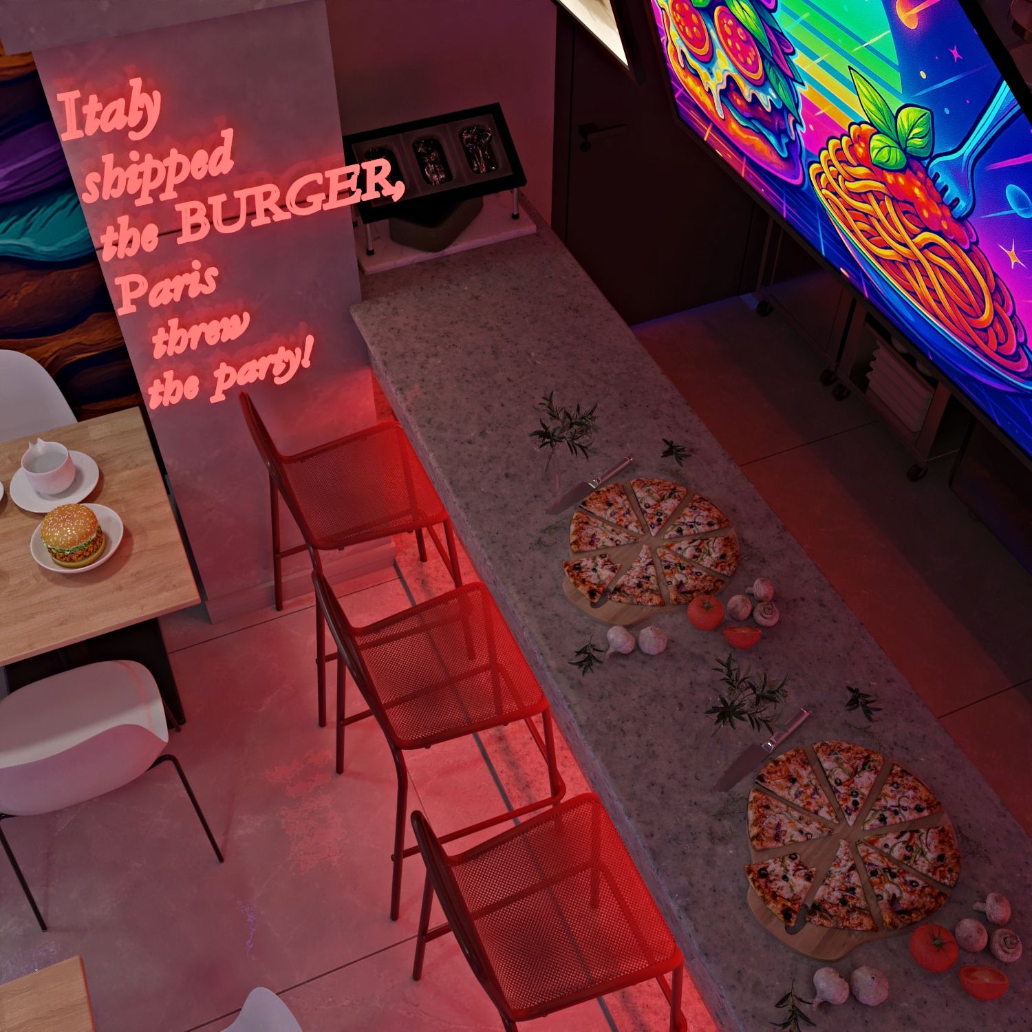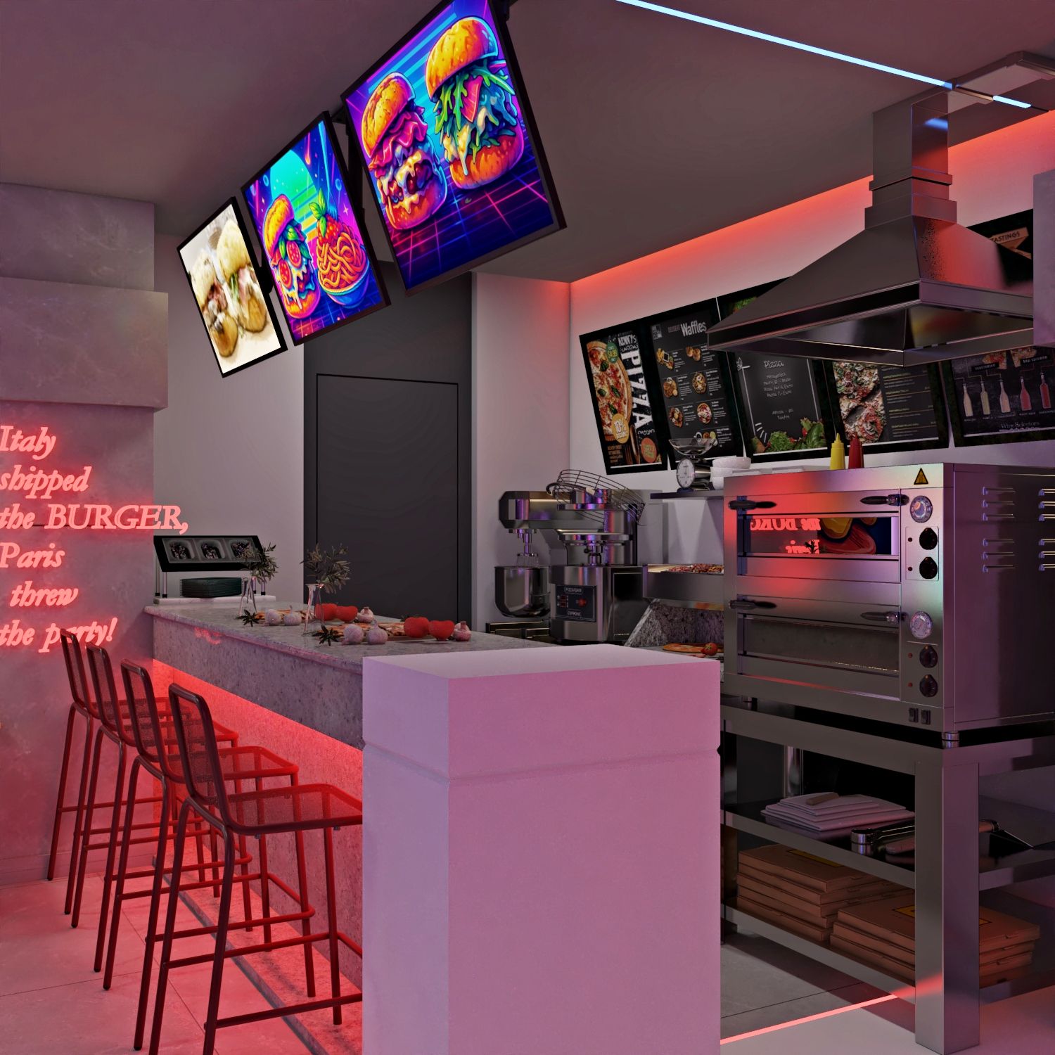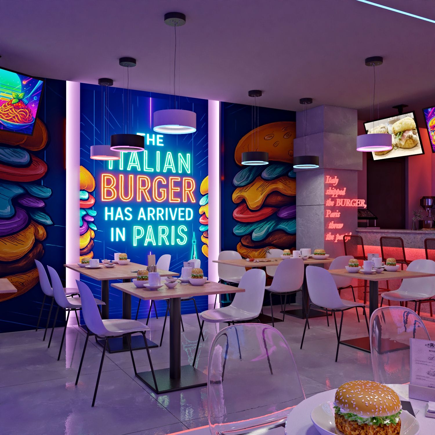 The new design mixes: - That Italian soul-still there in touches like the pizza oven and familiar aromas -A little Paris finesse-clean lines, elegant lighting, and detail that speaks style And a whole lot of playful burger energy-bold colors, fun characters, and neon moments made for Instagram.