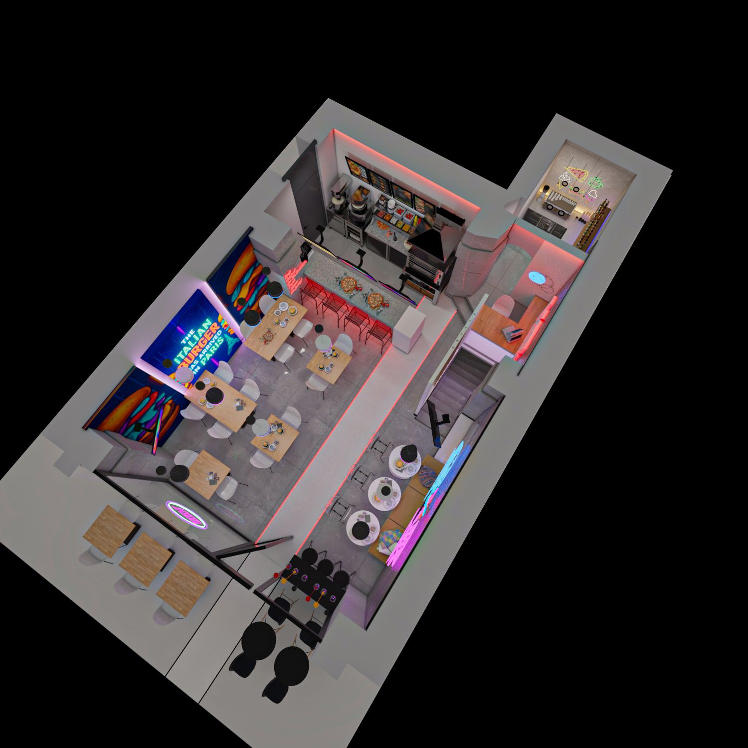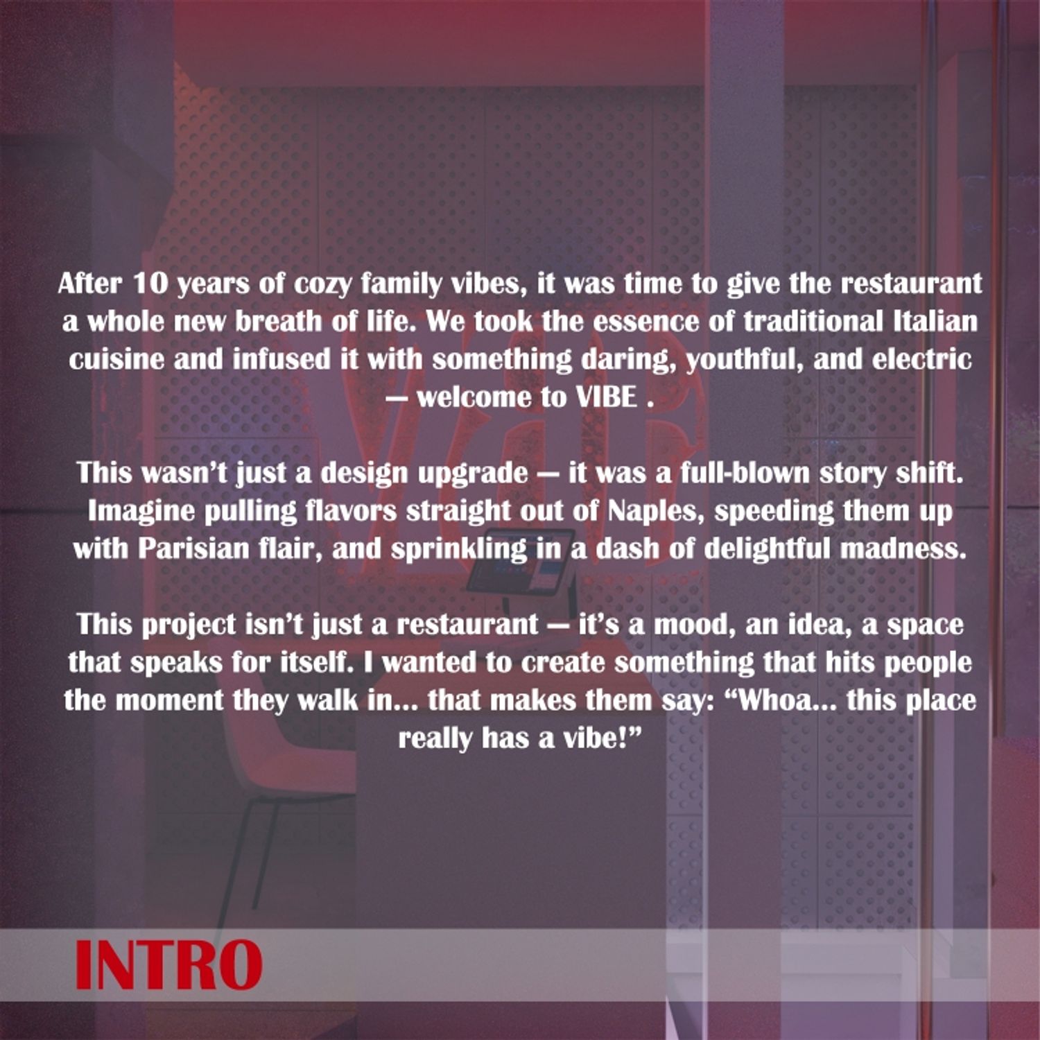 This project isn't just a restaurant - it's a mood, an idea, a space that speaks for itself. I wanted to create something that hits people the moment they walk in... that makes them say: "Whoa... this place really has a vibe!"
