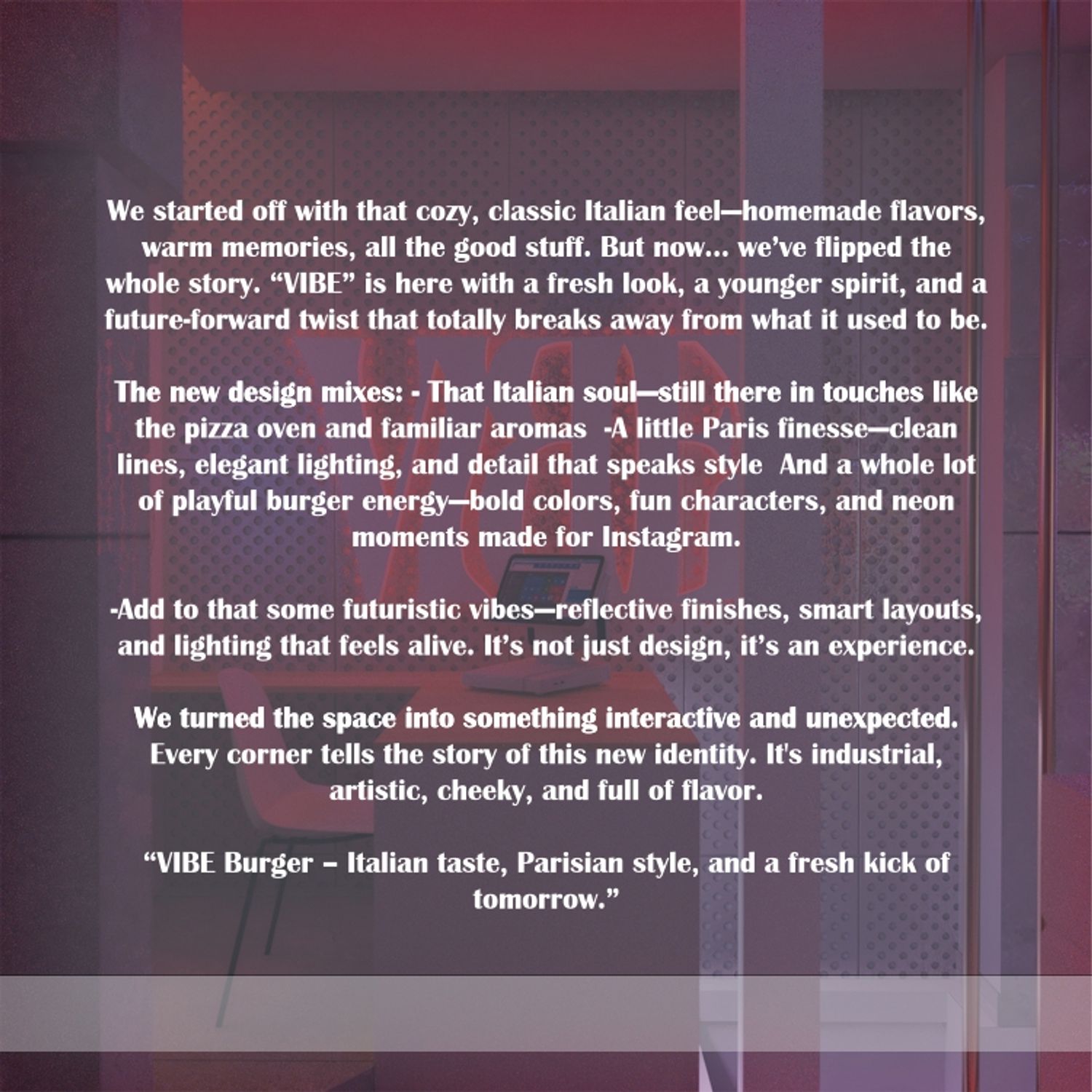 "VIBE Burger - Italian taste, Parisian style, and a fresh kick of tomorrow."