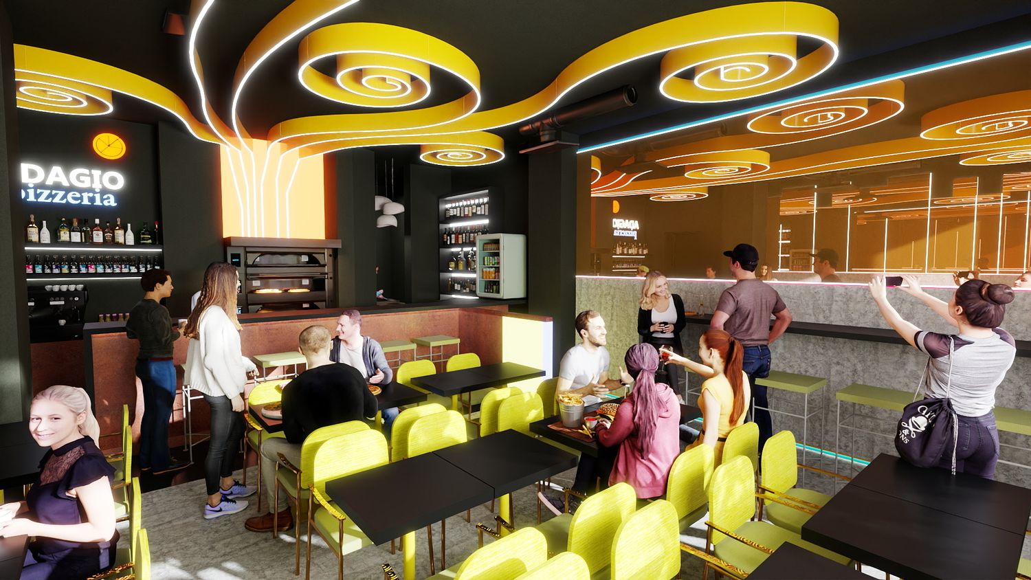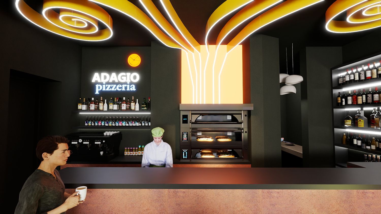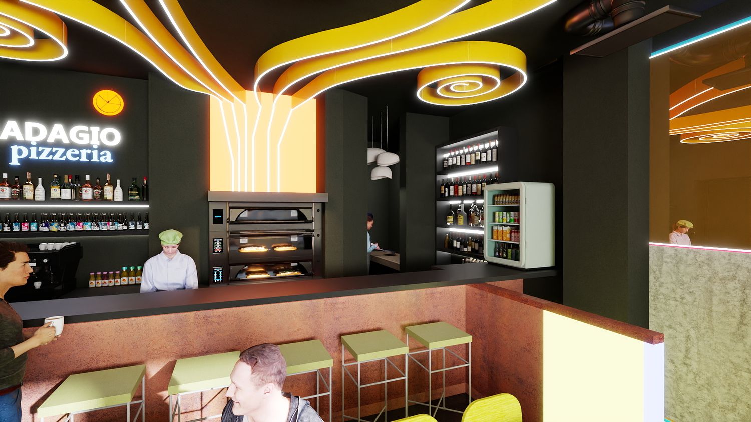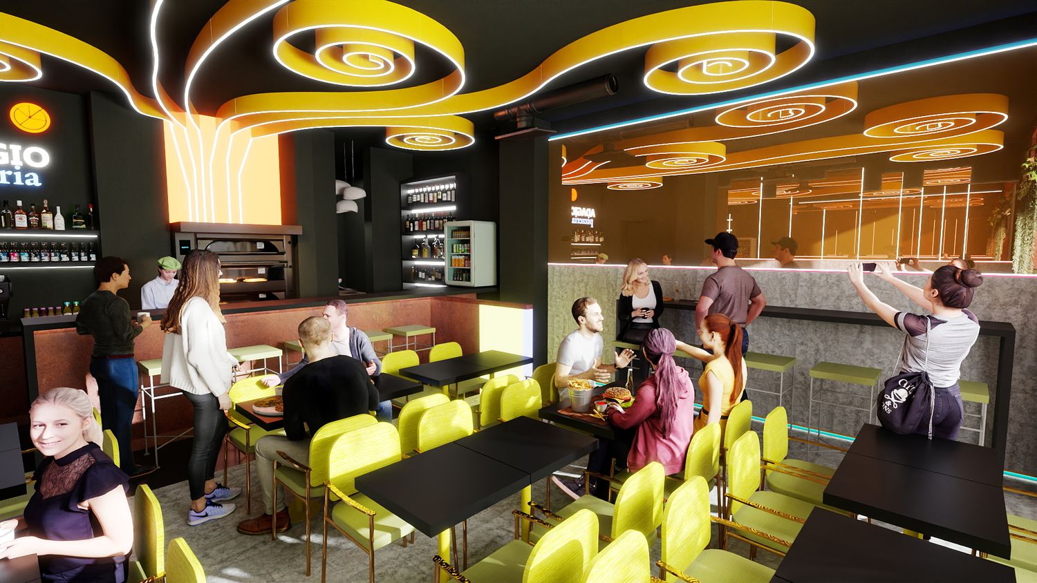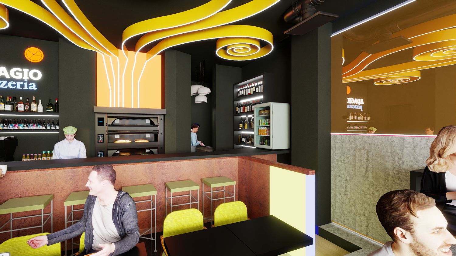 Il concept di design si basa sull’idea che le spirali luminose a soffitto rappresentino il fumo e i profumi che si sprigionano dal forno a legna per la pizza, creando un segno iconico e riconoscibile. Le pareti specchiate con bande LED ampliano visivamente lo spazio e donano profondità, mentre la parete verde diventa un vero e proprio punto “instagrammabile”, rafforzando l’identità contemporanea e conviviale del locale.