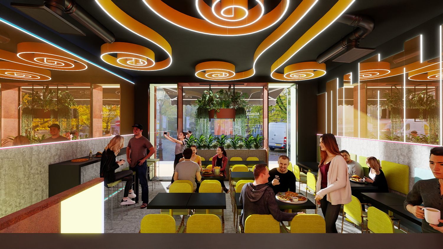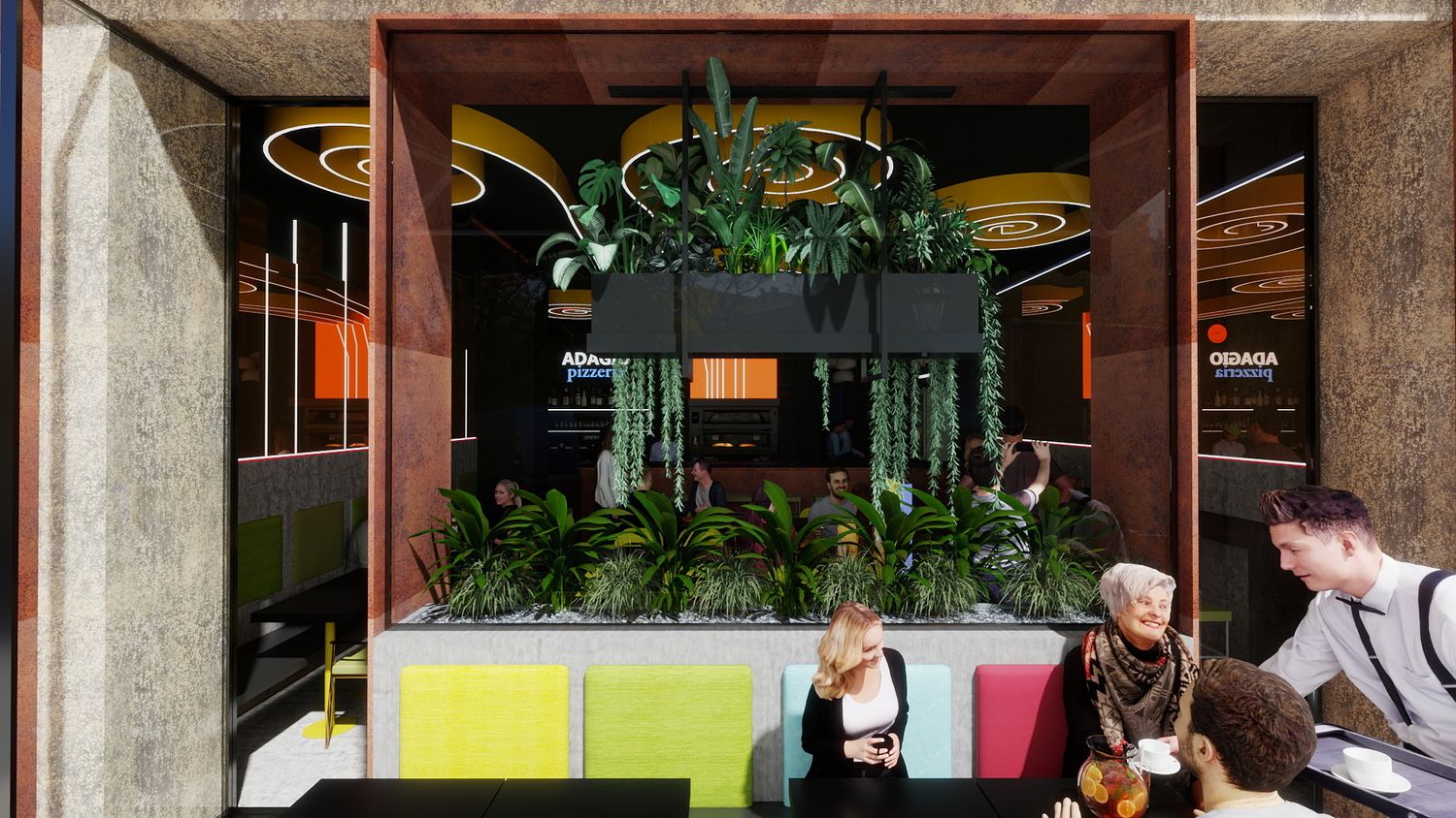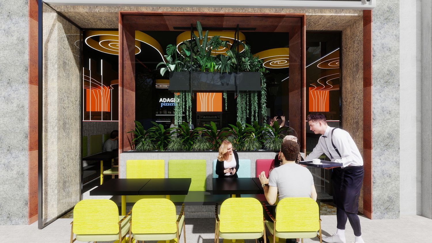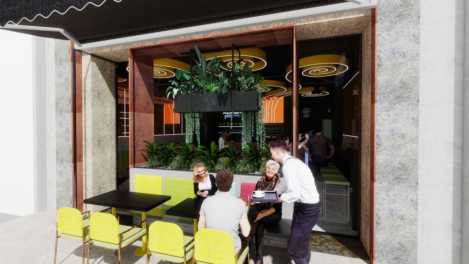 Il concept di design si basa sull’idea che le spirali luminose a soffitto rappresentino il fumo e i profumi che si sprigionano dal forno a legna per la pizza, creando un segno iconico e riconoscibile. Le pareti specchiate con bande LED ampliano visivamente lo spazio e donano profondità, mentre la parete verde diventa un vero e proprio punto “instagrammabile”, rafforzando l’identità contemporanea e conviviale del locale.