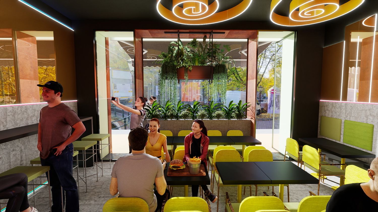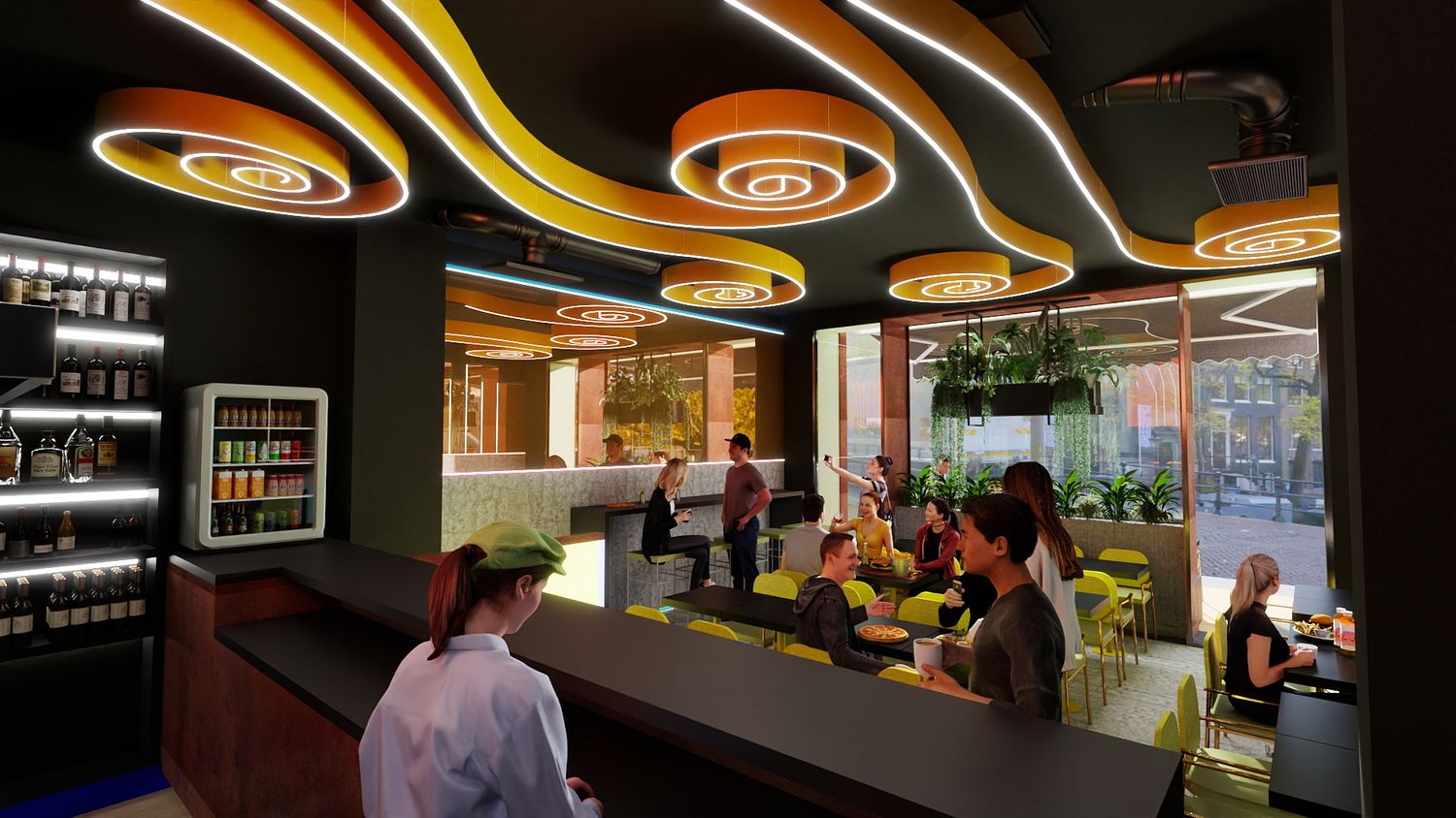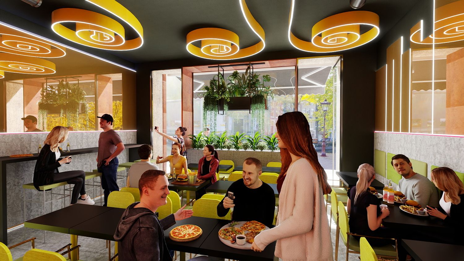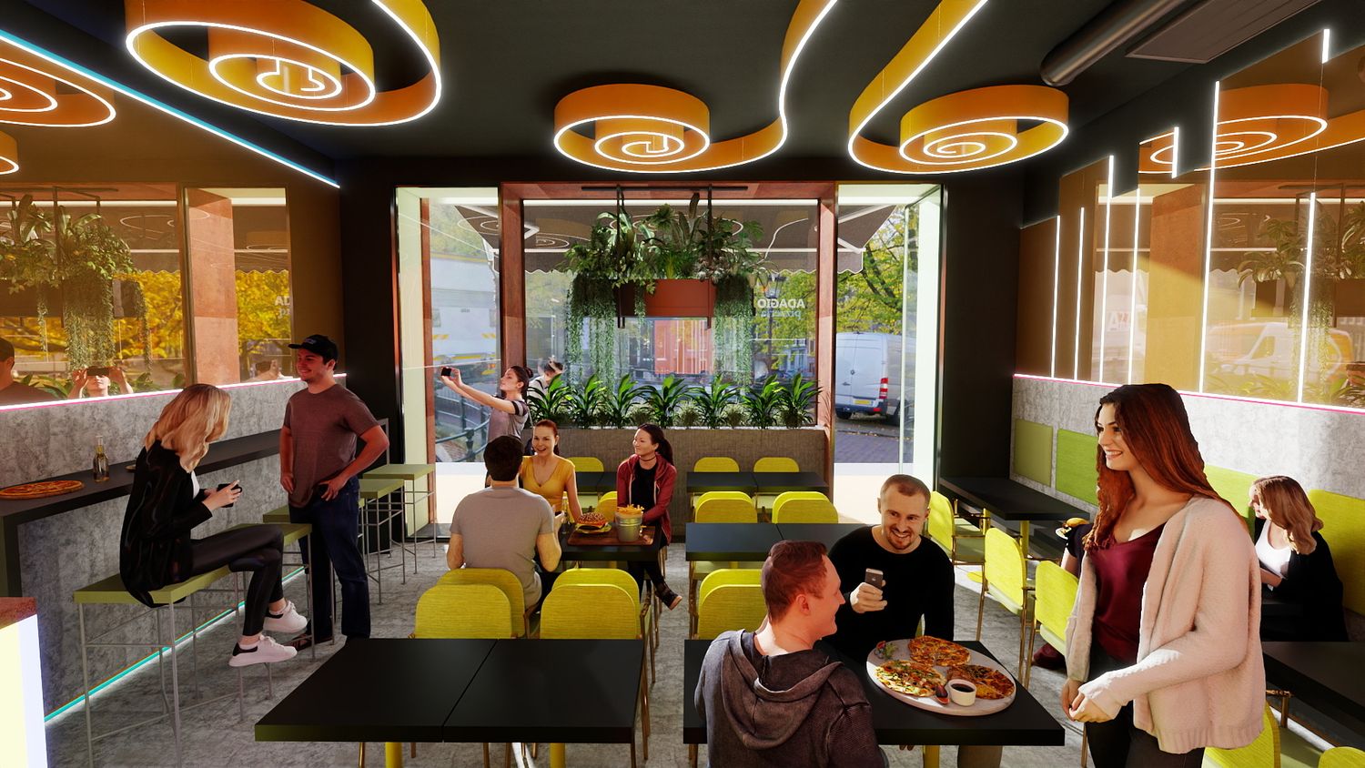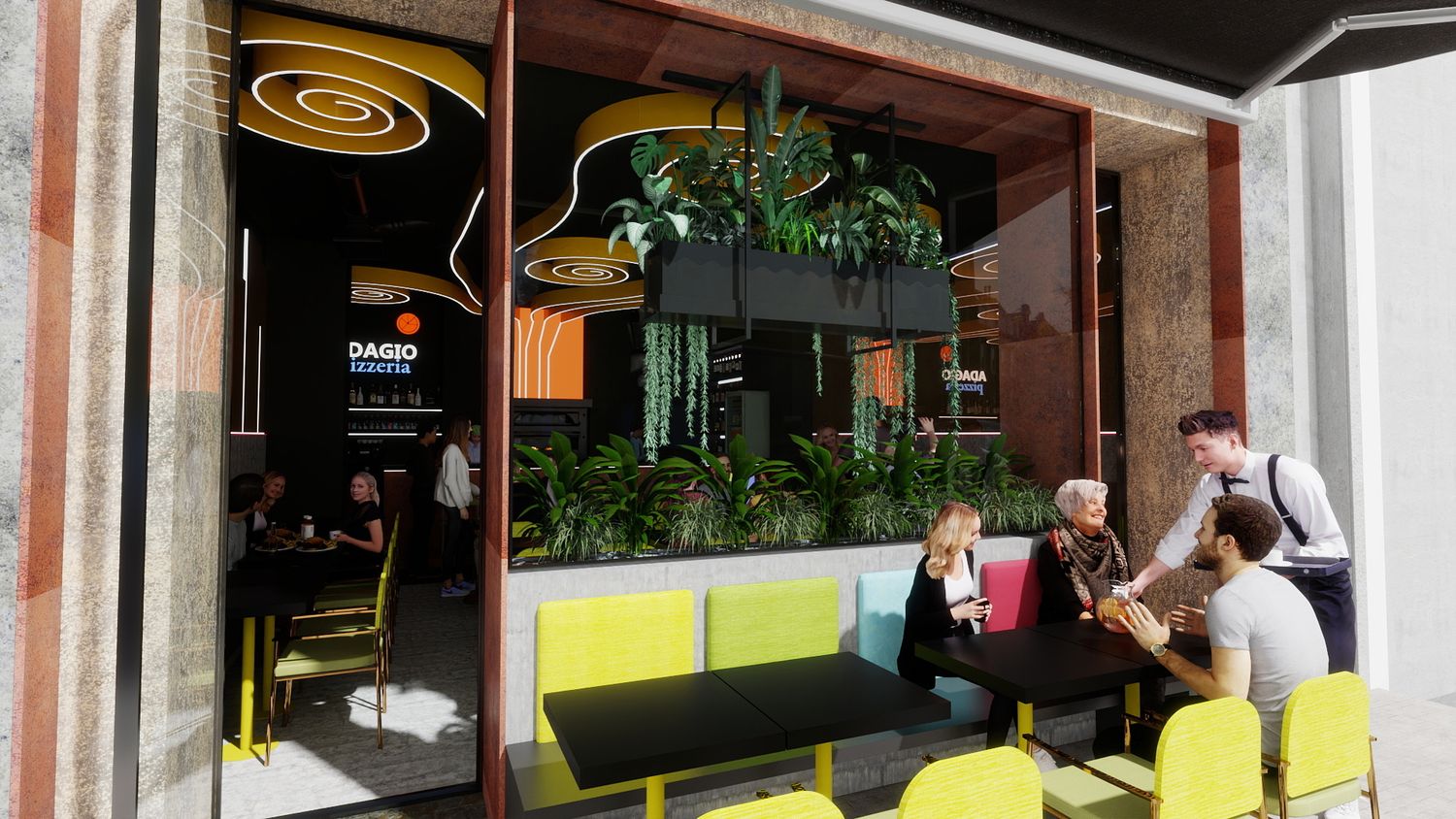 Il concept di design si basa sull’idea che le spirali luminose a soffitto rappresentino il fumo e i profumi che si sprigionano dal forno a legna per la pizza, creando un segno iconico e riconoscibile. Le pareti specchiate con bande LED ampliano visivamente lo spazio e donano profondità, mentre la parete verde diventa un vero e proprio punto “instagrammabile”, rafforzando l’identità contemporanea e conviviale del locale.