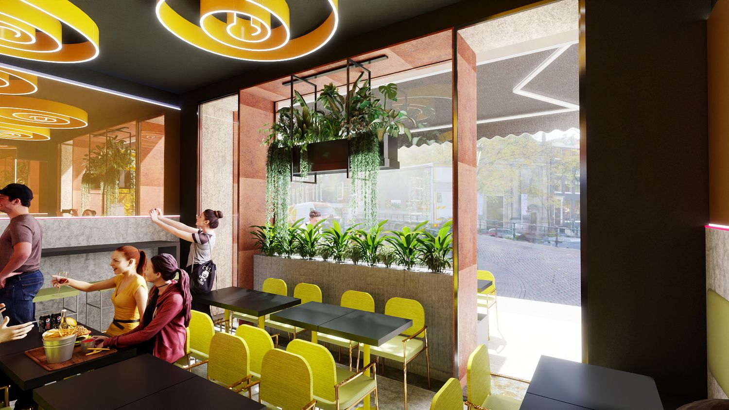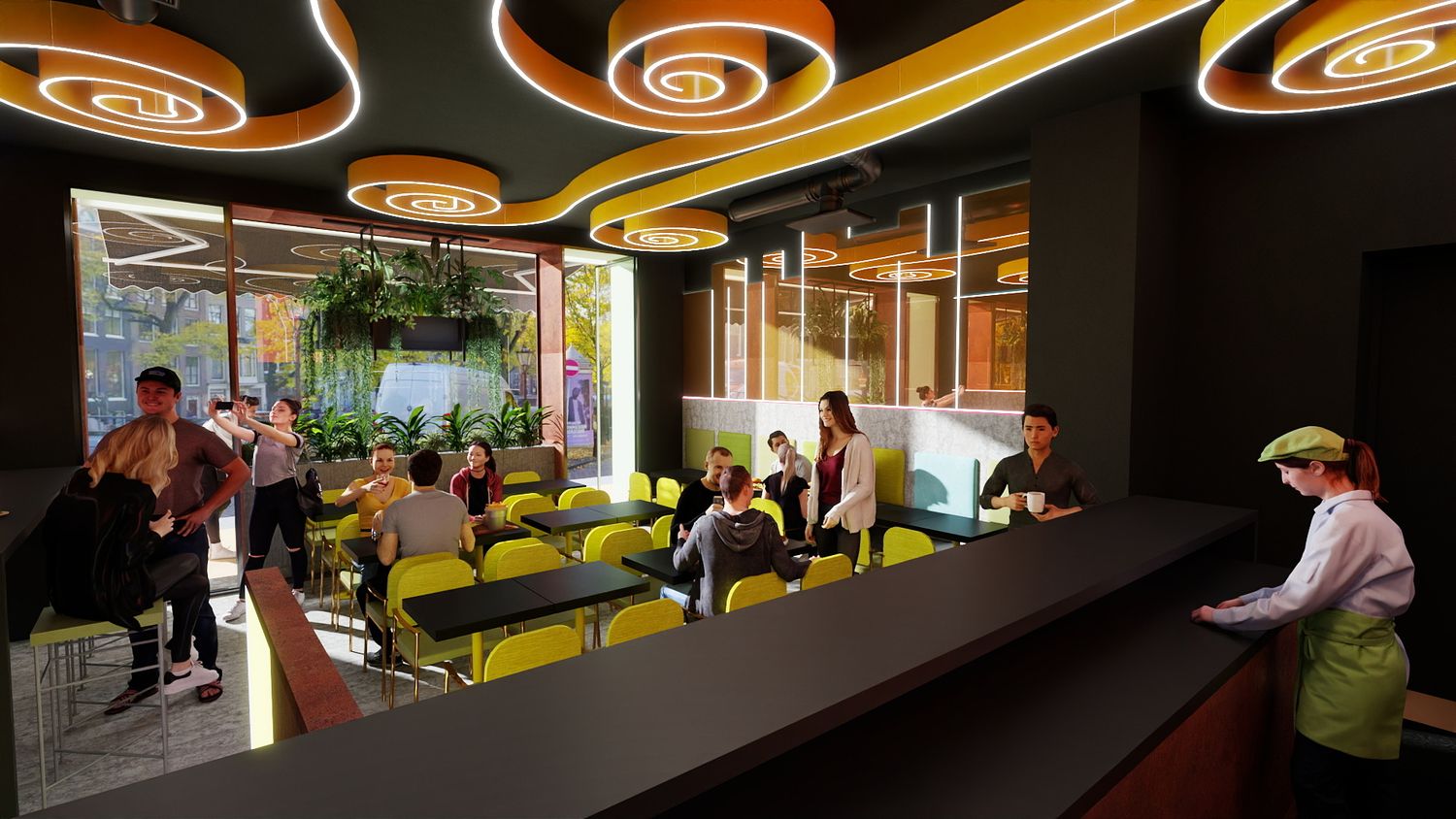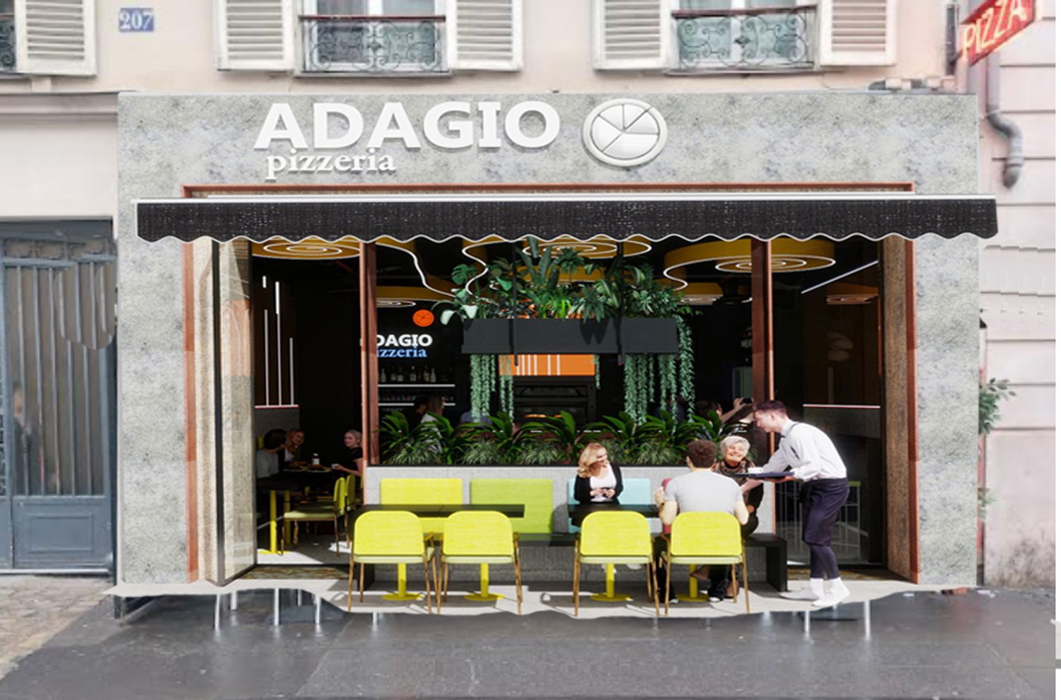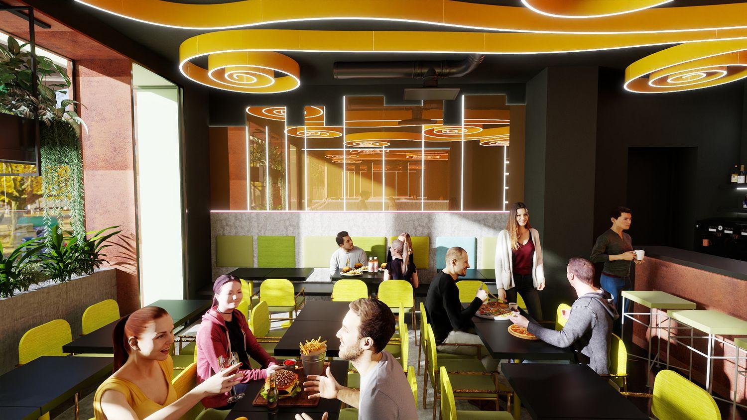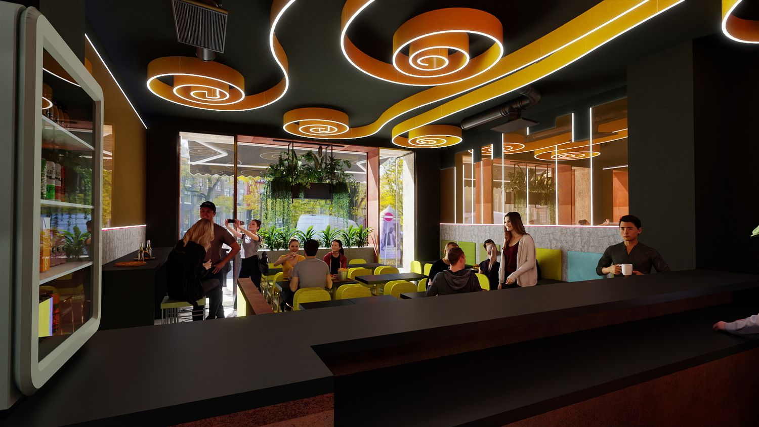 Il concept di design si basa sull’idea che le spirali luminose a soffitto rappresentino il fumo e i profumi che si sprigionano dal forno a legna per la pizza, creando un segno iconico e riconoscibile. Le pareti specchiate con bande LED ampliano visivamente lo spazio e donano profondità, mentre la parete verde diventa un vero e proprio punto “instagrammabile”, rafforzando l’identità contemporanea e conviviale del locale.