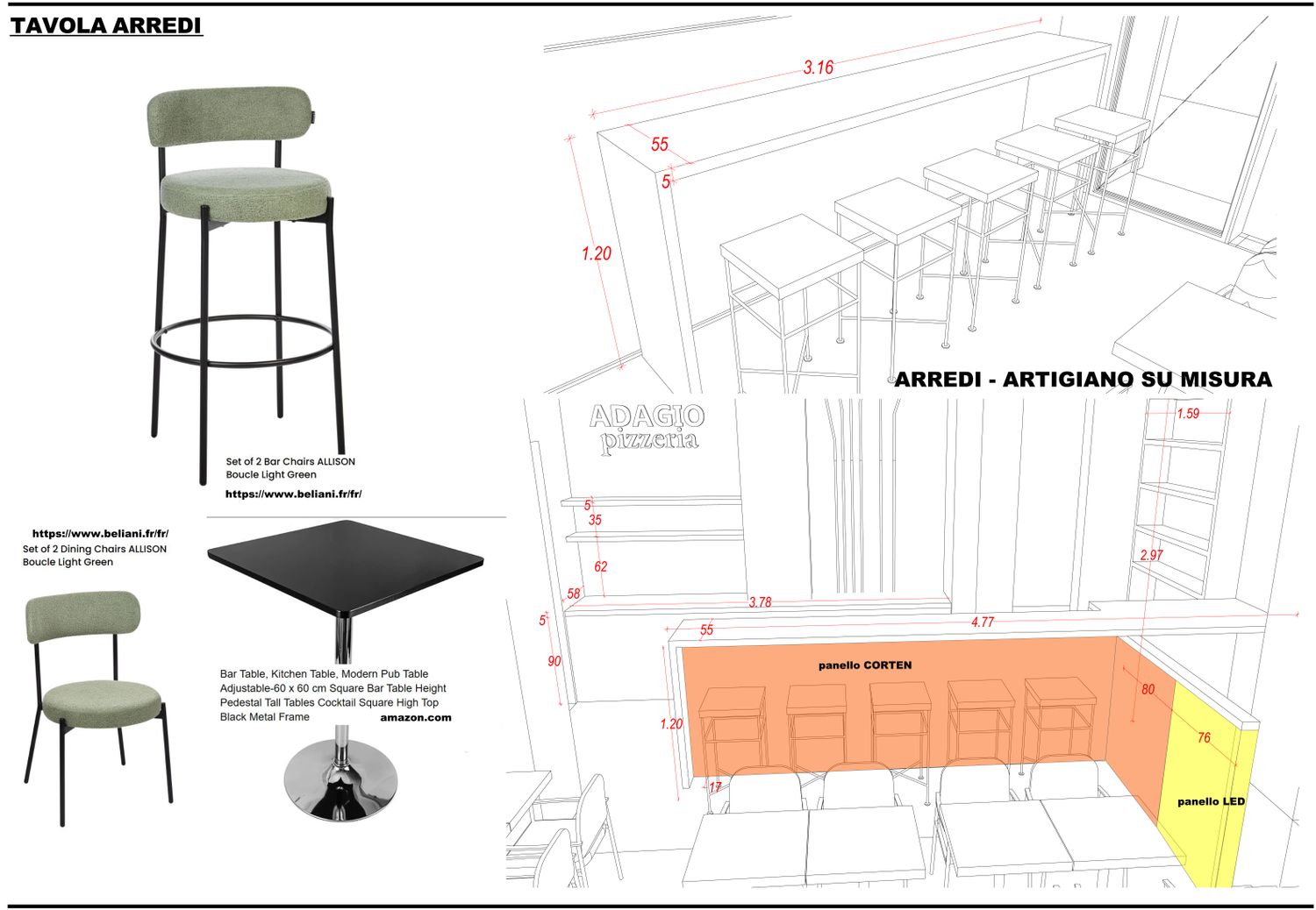 Il mobilio del banco bar sarà realizzato su misura, adattato alle dimensioni effettive e alle esigenze di stoccaggio. In alternativa al truciolare rivestito, si propone l’utilizzo di pannelli MDF laccati neri ad alta resistenza (spessore circa 5 cm), materiale comunemente impiegato nel design di locali e bar per la sua resistenza, finitura uniforme e facilità di manutenzione. Questa scelta permette di mantenere la pulizia delle linee, la solidità strutturale e l’aspetto contemporaneo, in linea con l’identità visiva del progetto.